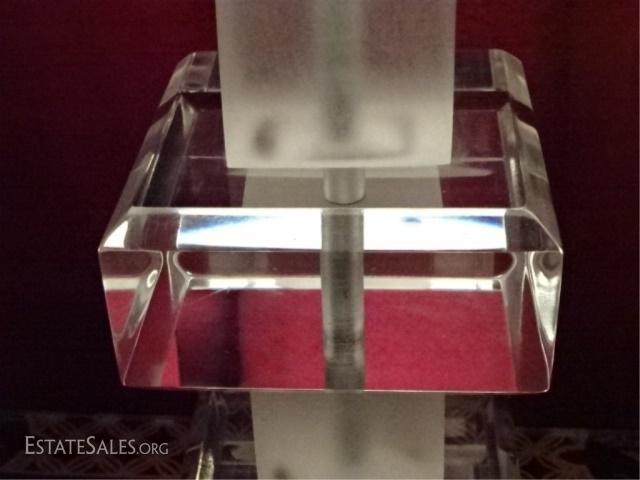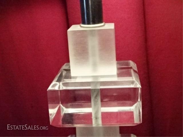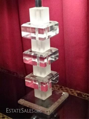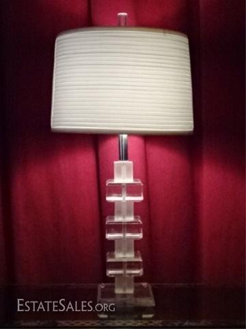 LOT 71D: LARGE STACKED BLOCK LUCITE LAMP, CLEAR AND FROSTED LUCITE ON SQUARE LUCITE BASE, VERY GOOD CONDITION WITH SOME MINOR CRAZING ON LOWER BACK EDGE OF BASE, 30"H, SKU6356.01