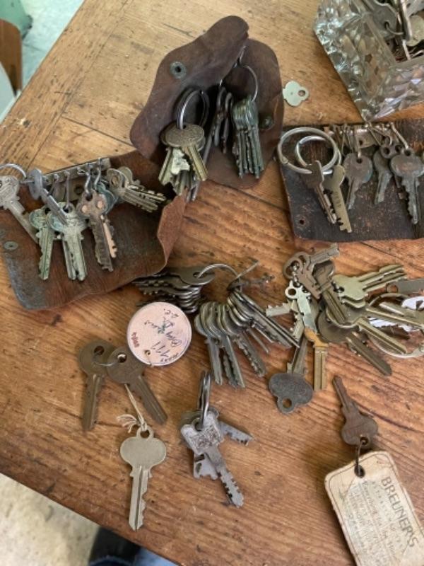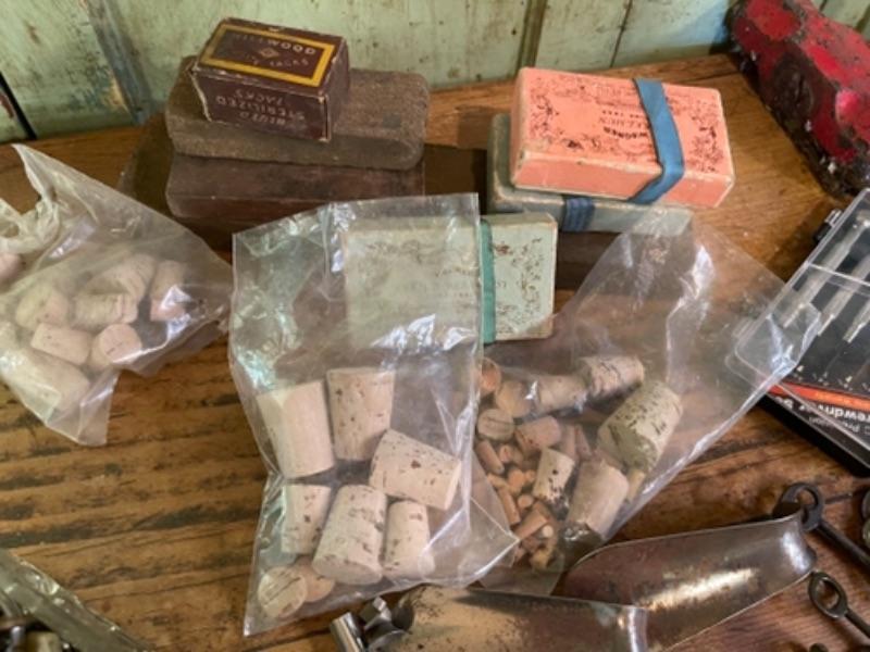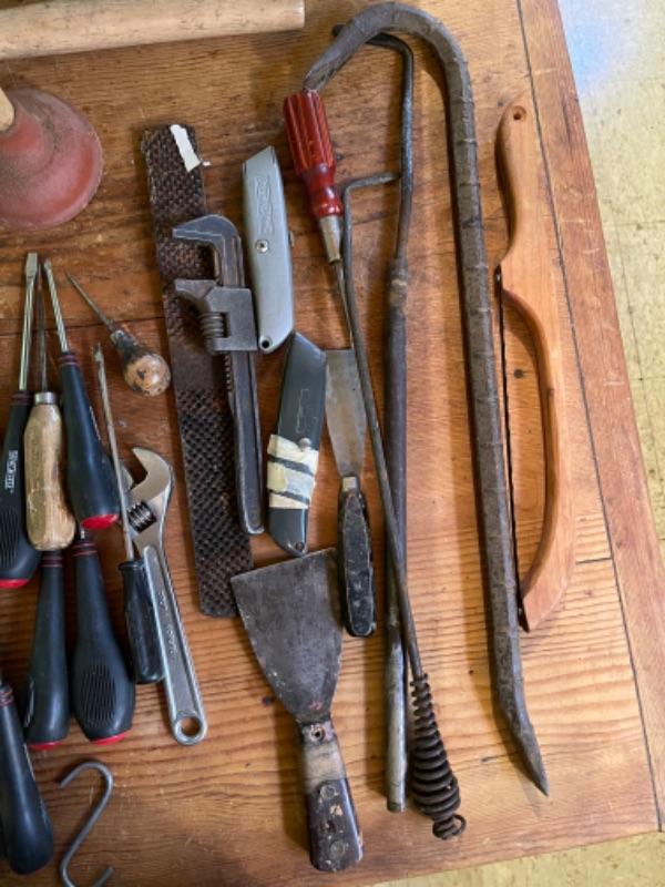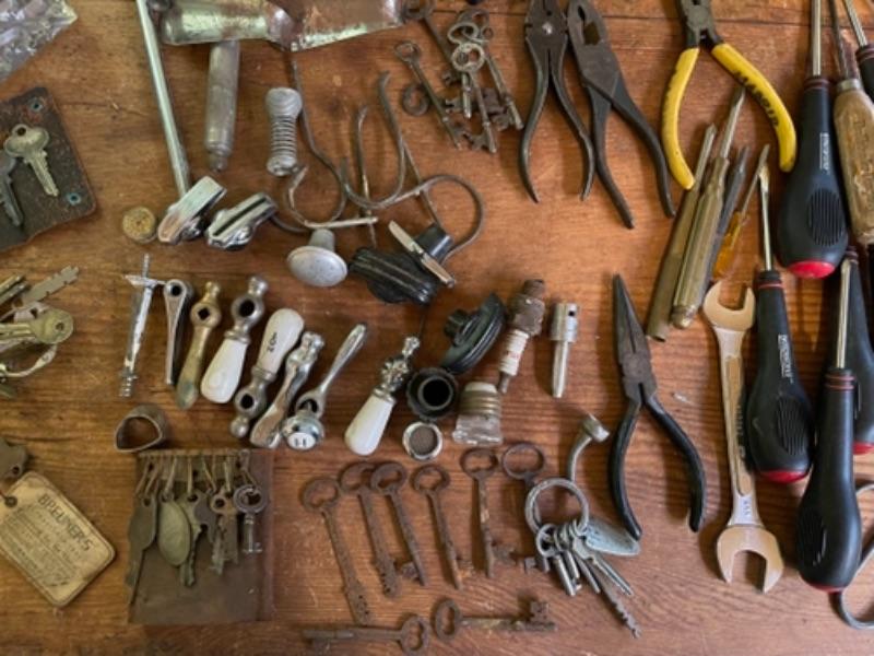 Lot 71K. Large assortment of vintage hand tools“”wrenches, plungers, scrubber, faucet and stove knobs, crowbar, sledge hammer, wire cutters, corks, twine, sharpening stones, awl, rasp, huge collection of antique keys--$125