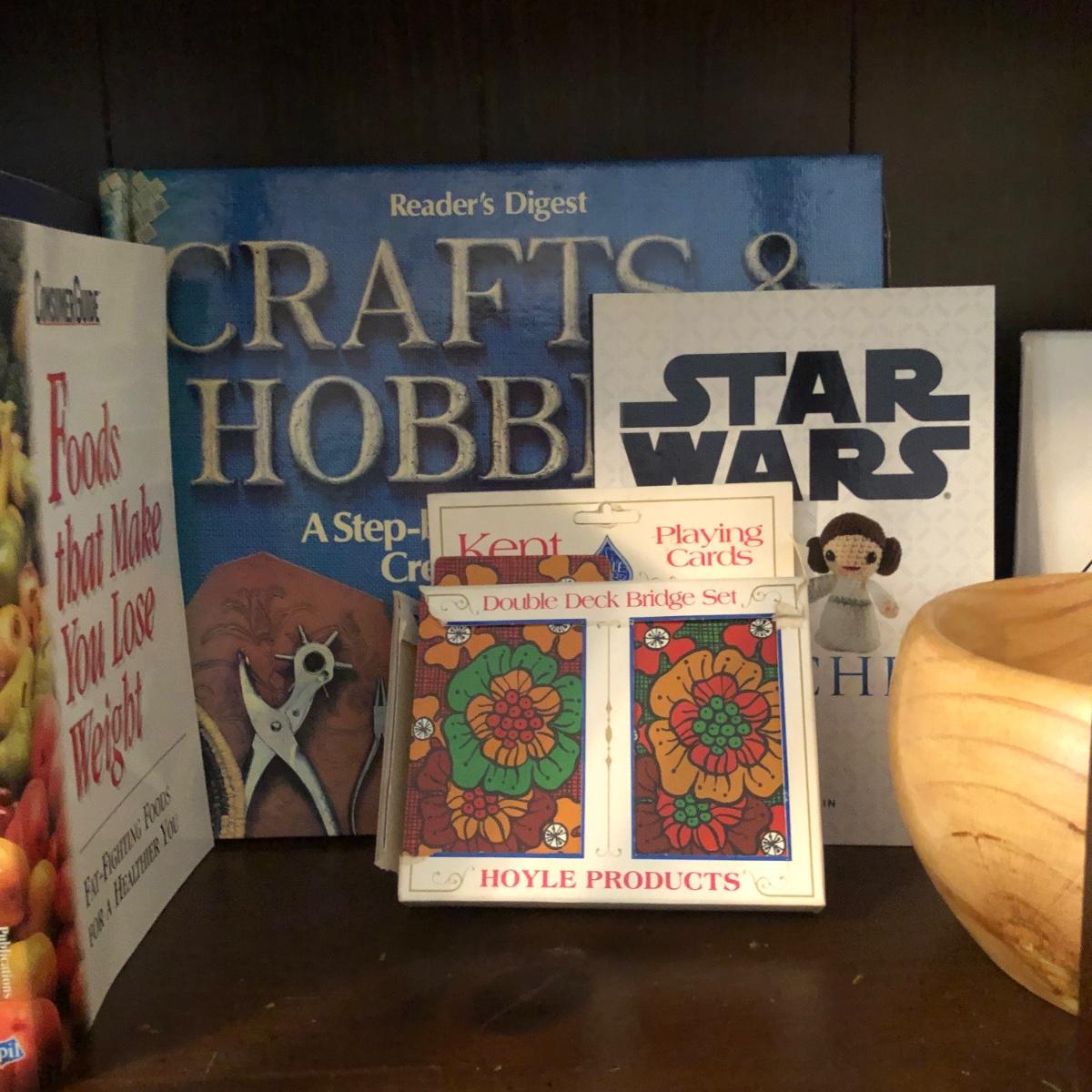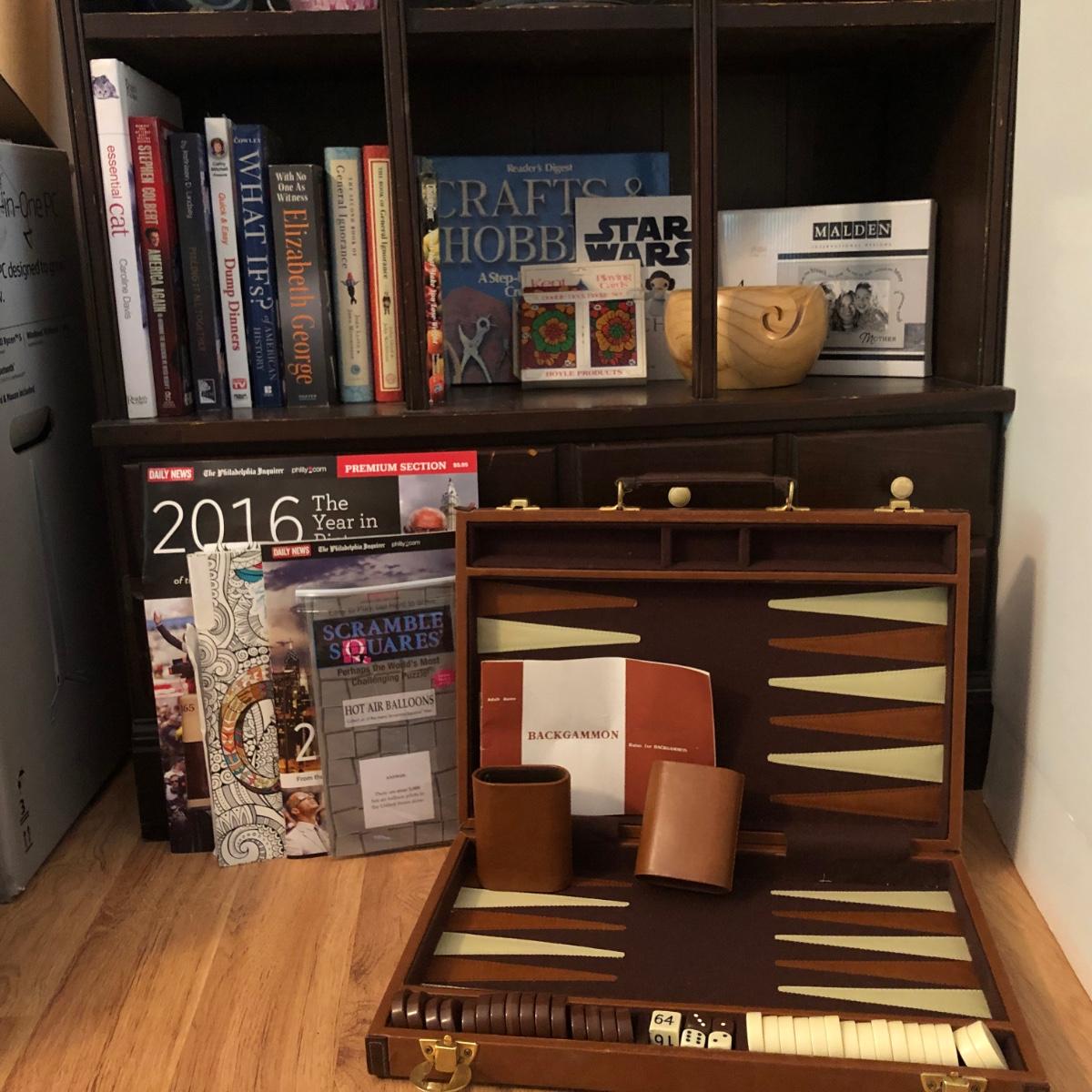 LOT 71M: Craft Books, Backgammon Set, Wooden Yarn Bowl & More