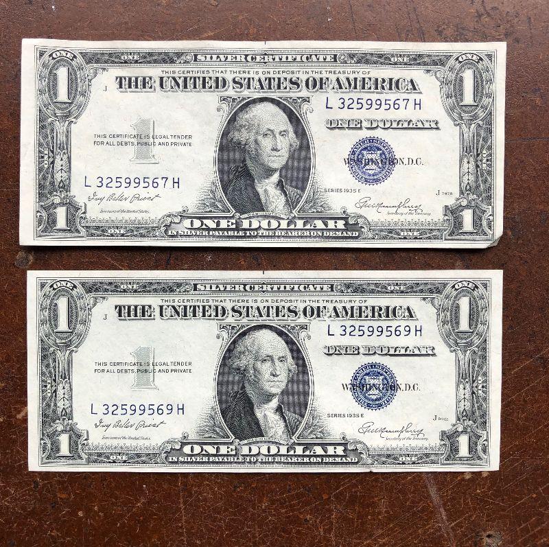 Lot 72, 2 1935 Series E US Silver Certificates $1 Dollar