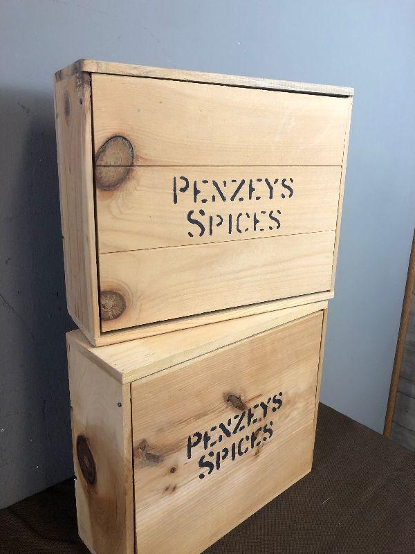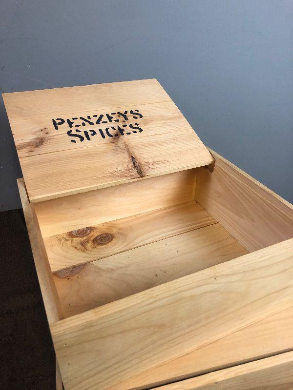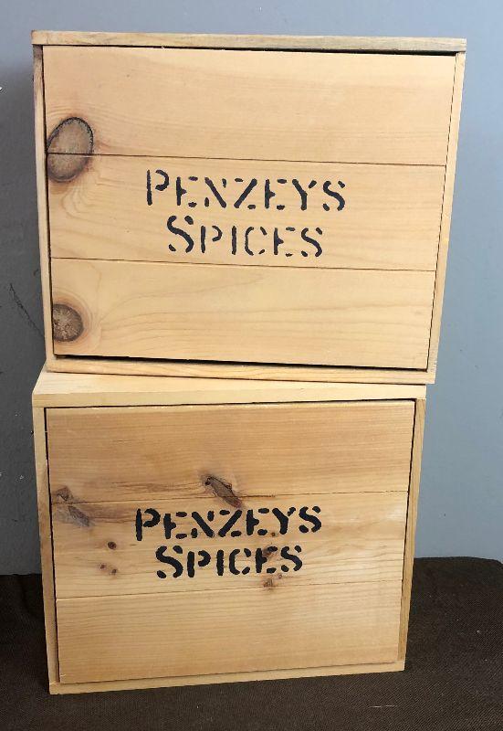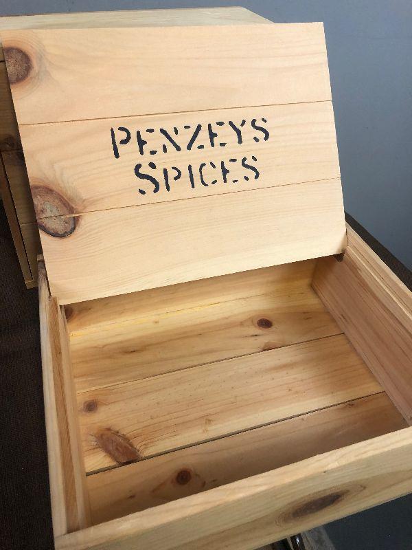 Marked: Penzeys Spices, newer with hinged lid, good condition 14 x 12 x 5