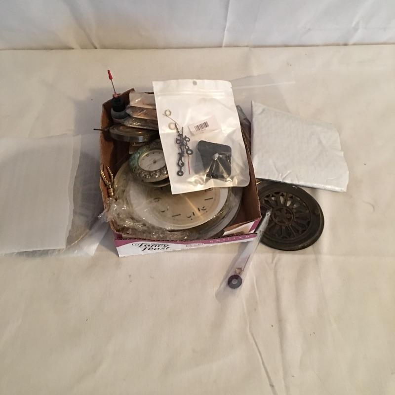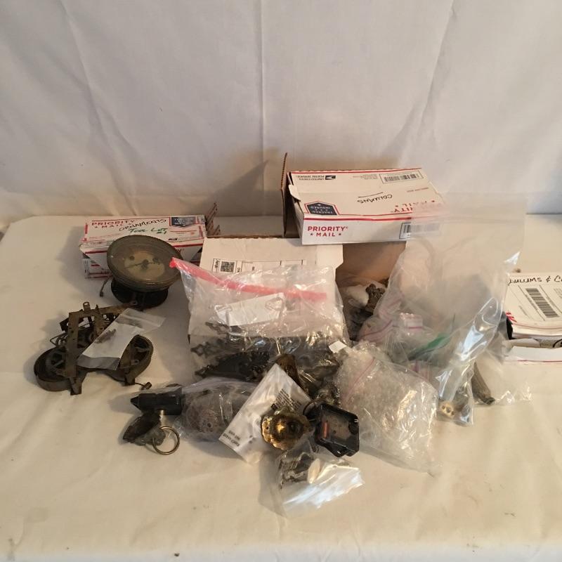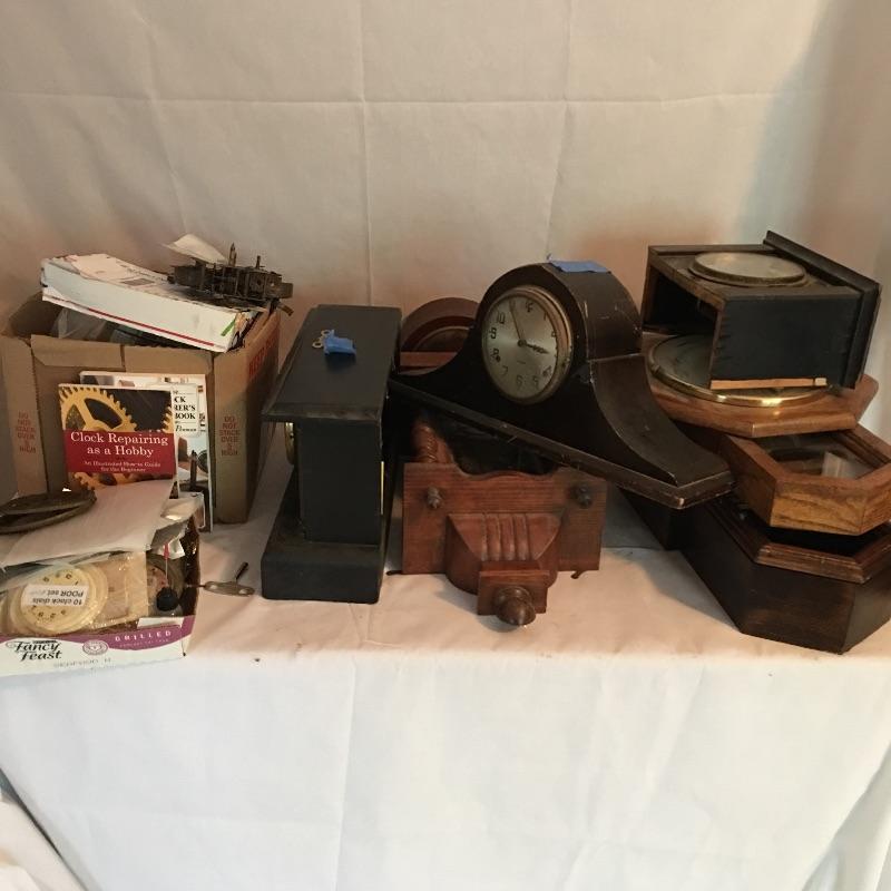Large array of clocks in all states of assembly and oodles of parts - see pictures. Also a tool kit like new in box and generic clock keys.
