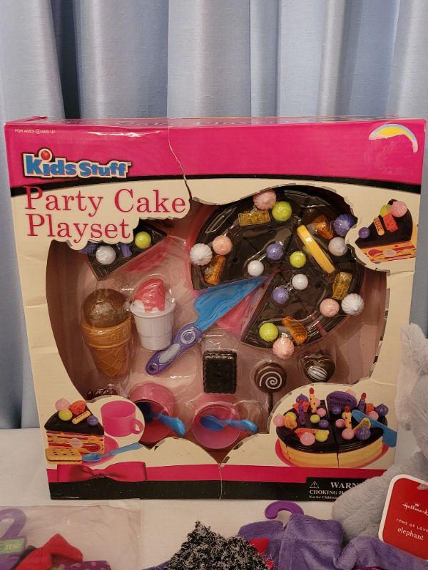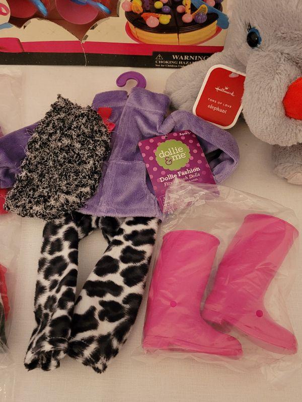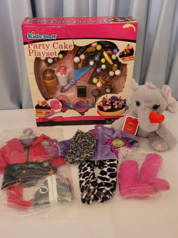 Lot 72: New 18" Doll Clothes, Plushie and Party Cake Playset