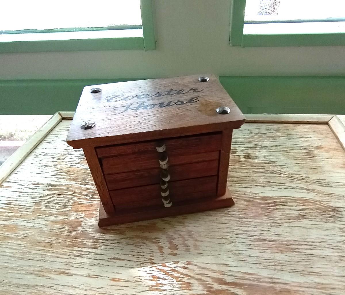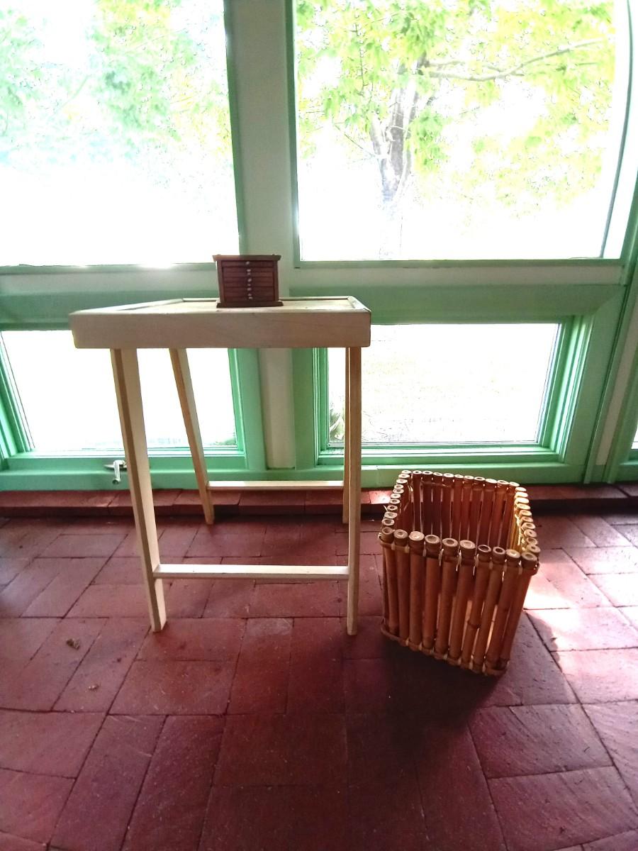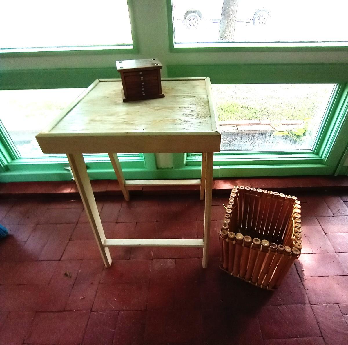 WOODEN TABLE MEASURES 17 SQUARE, IT COULD USE A NEW COAT OF PAINT, COASTERS AND-BASKET