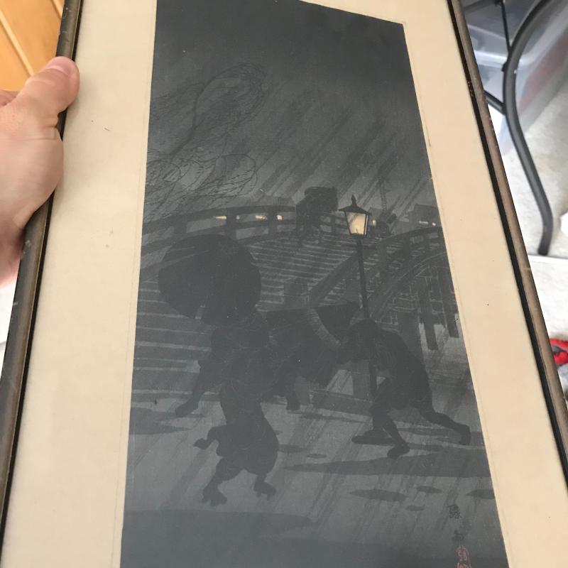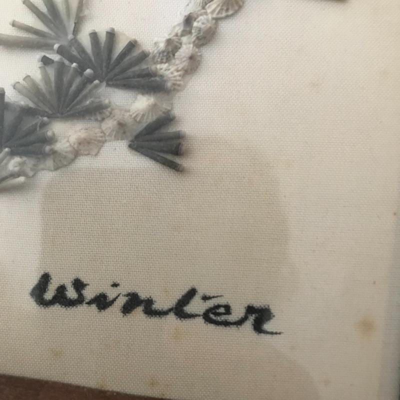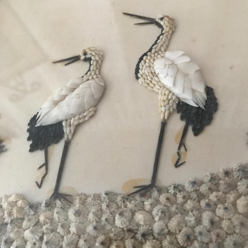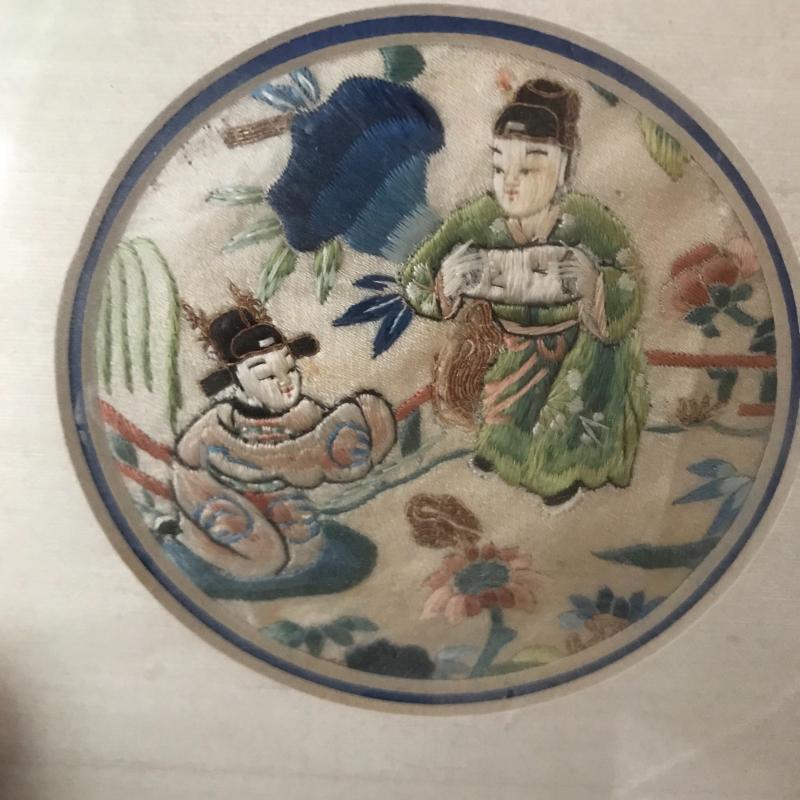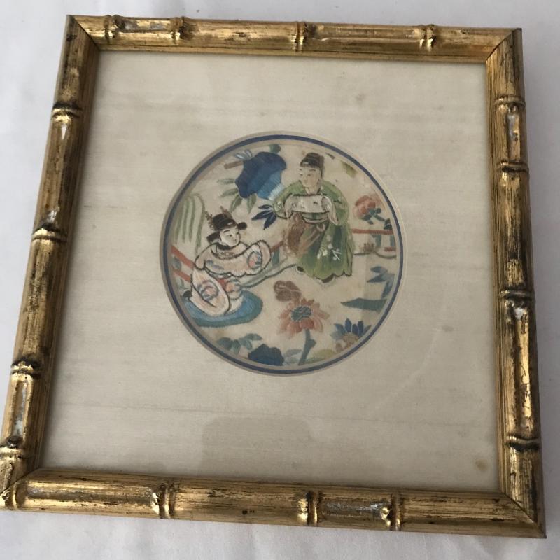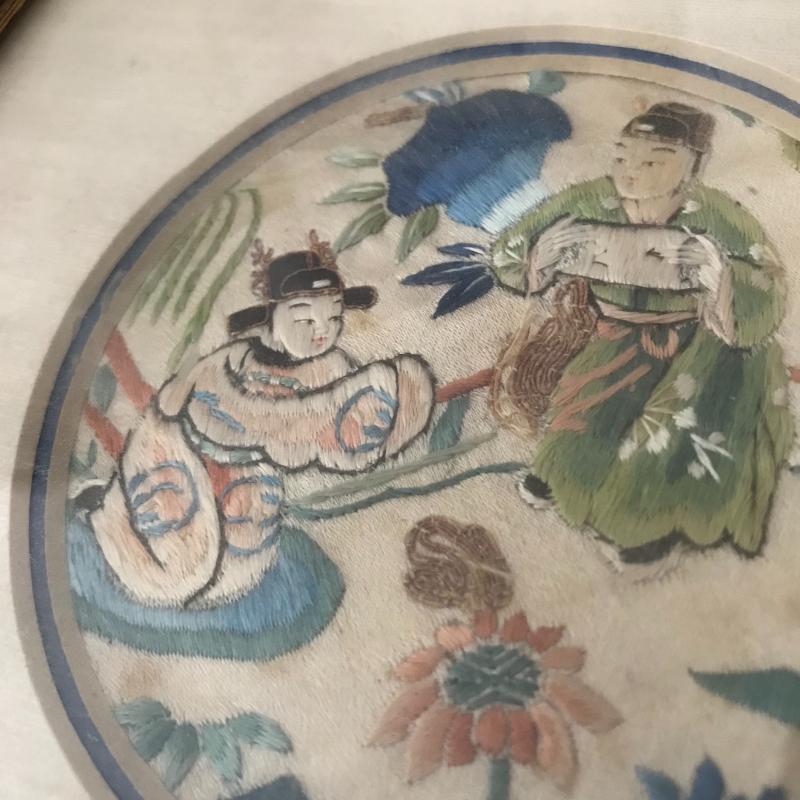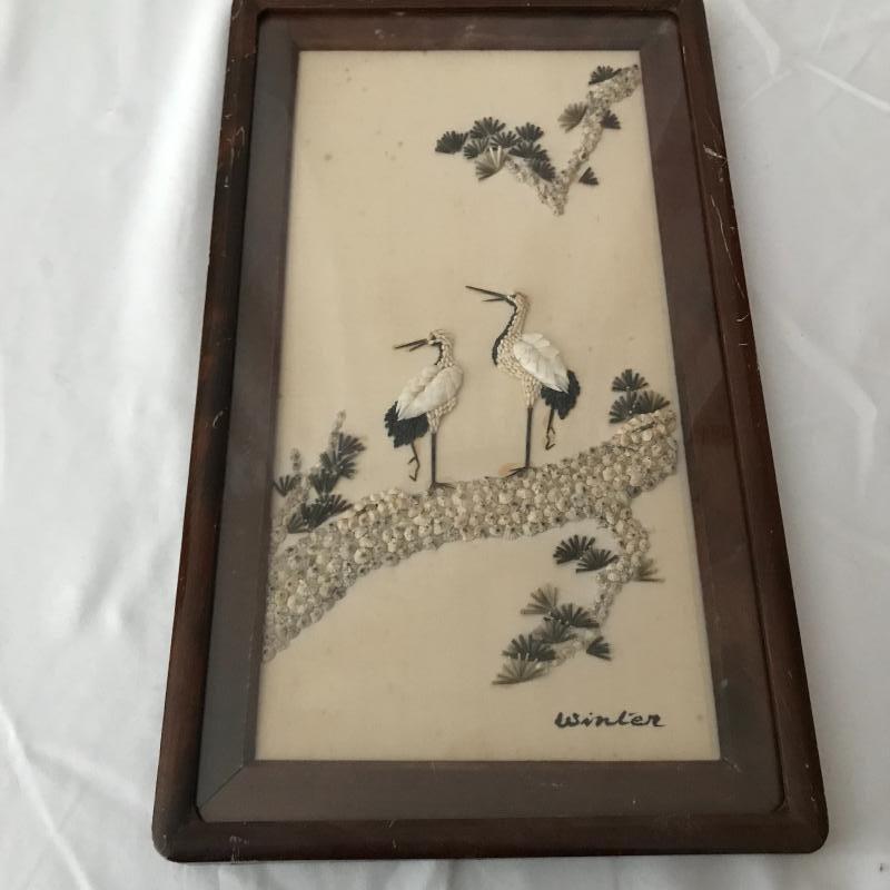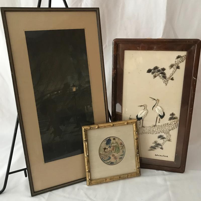 Lot contains three pieces of Asian-style art. Largest piece is approx. 20.5” x 10.5”. See photos for signature/marking. Bird piece is made with tiny shells and plants. Smallest piece is embroidered. Shipping available or local pickup in Asheville, NC. Please note that shipping art can be expensive.