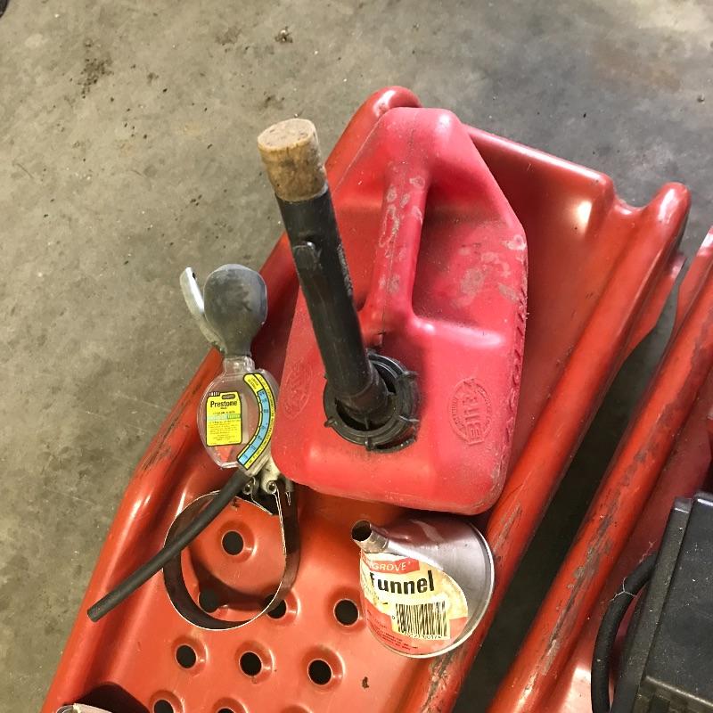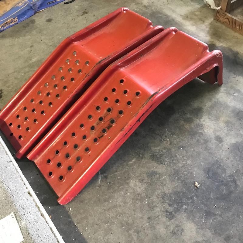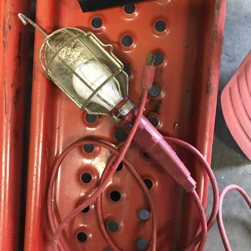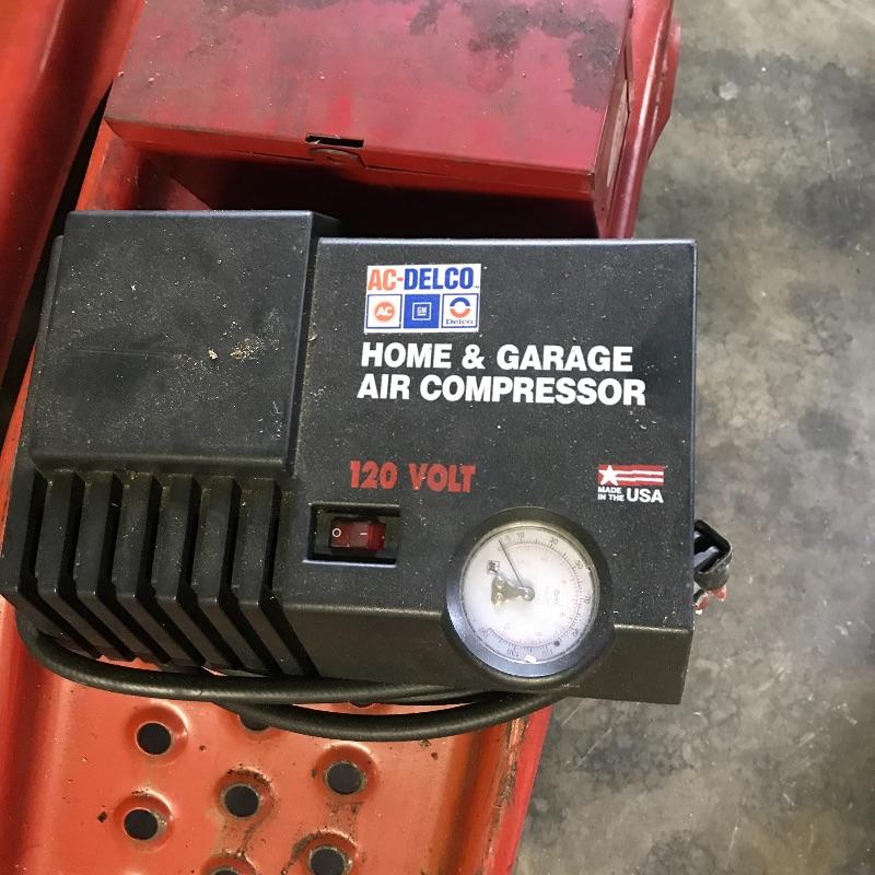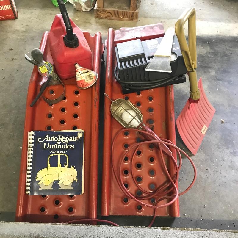 Some super handy items for your garage here with two small red ramps, gallon gas can, 120v air compressor, drop light, road reflectors and more. Local pick up only.