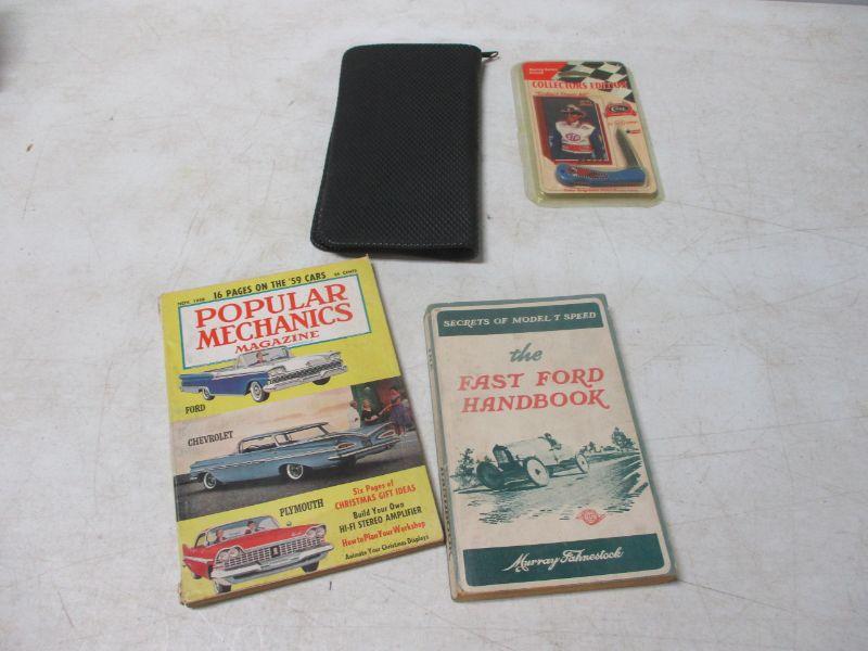 In this lot you are bidding on a popular mechanics magazine from 1958, the fast ford handbook , collectors edition Petty pocket knife and glove box car information holder.