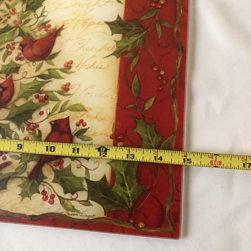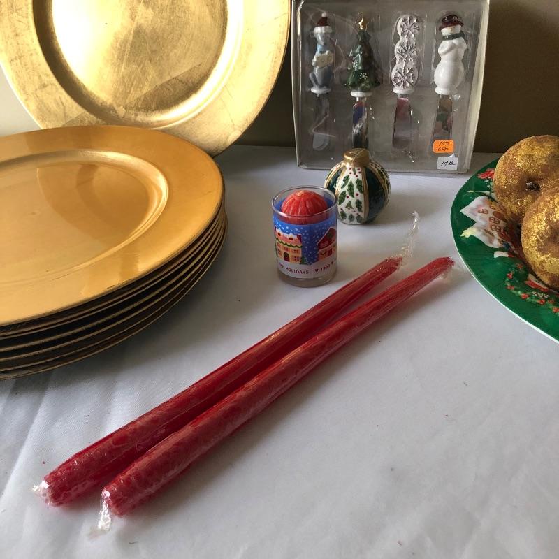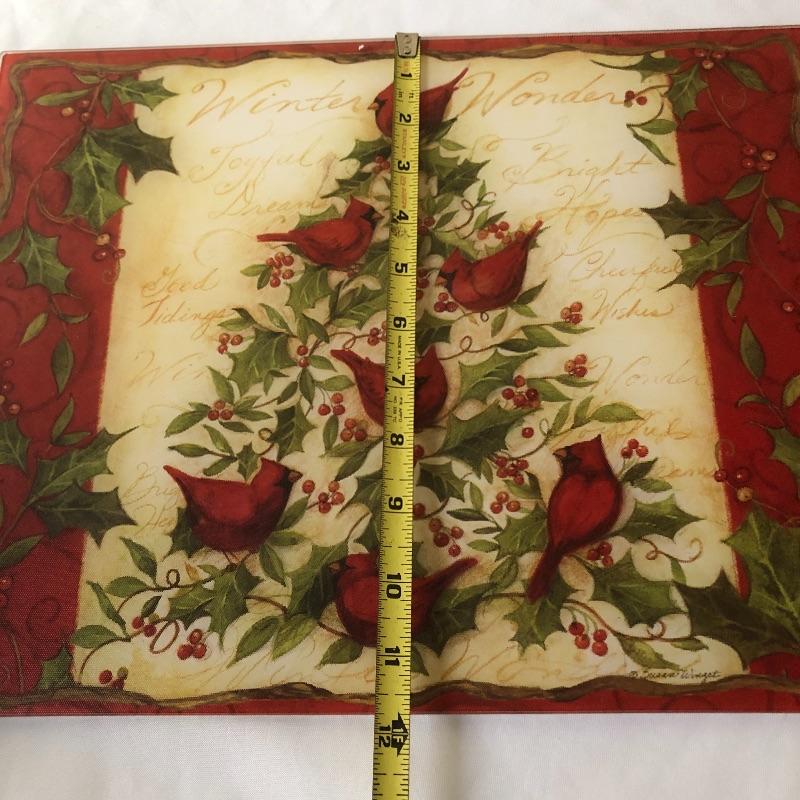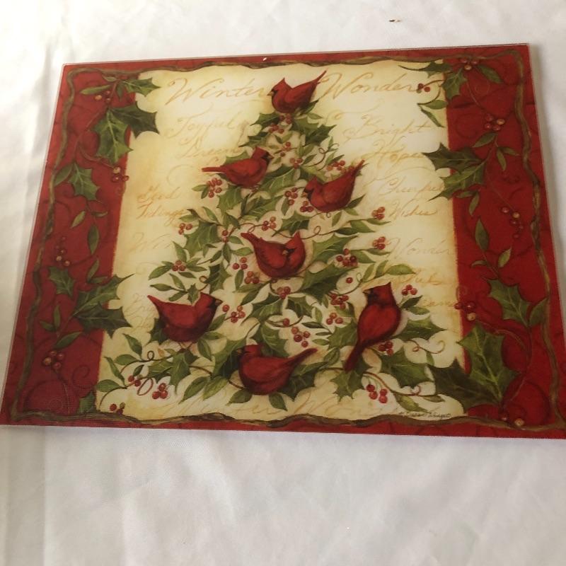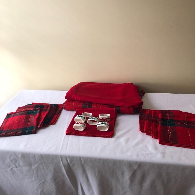 This lot includes a cardinal glass cutting board or centerpiece, three gold decorative votive holders, two garland decorative pieces, lots of garland, eight plaid napkins with matching oval red and plaid table cloth, six napkin holders, eight gold charger plastic plates, ten pears, napkin rings and more! Local pick up only.