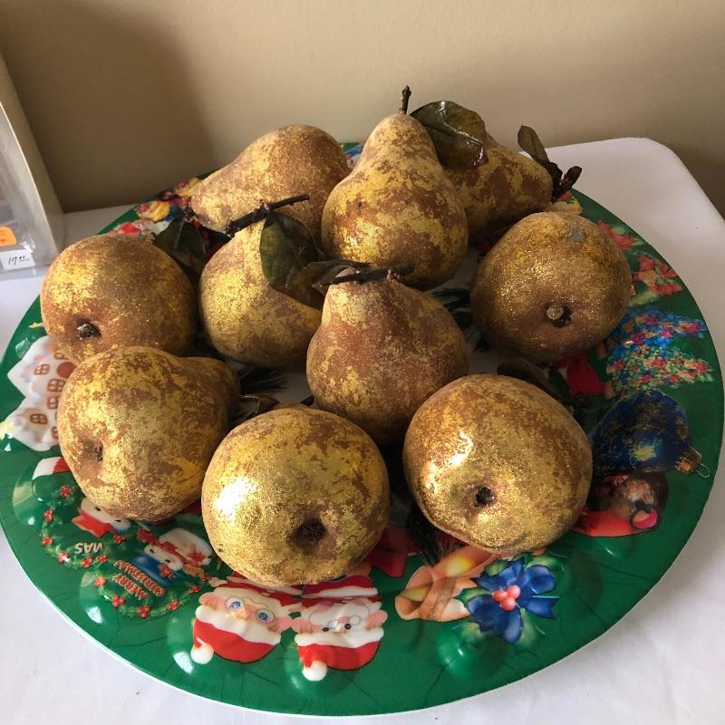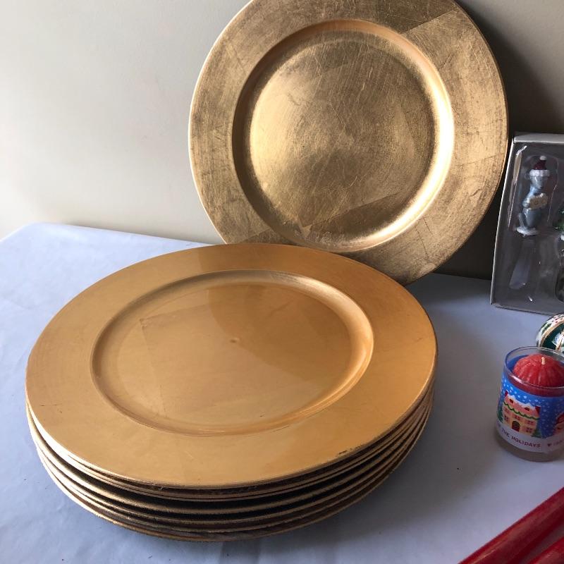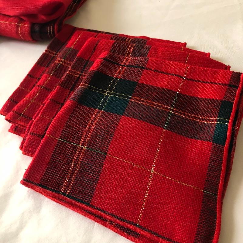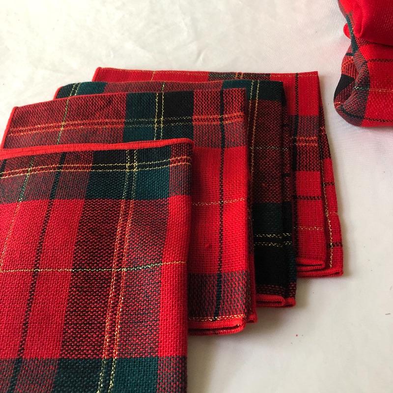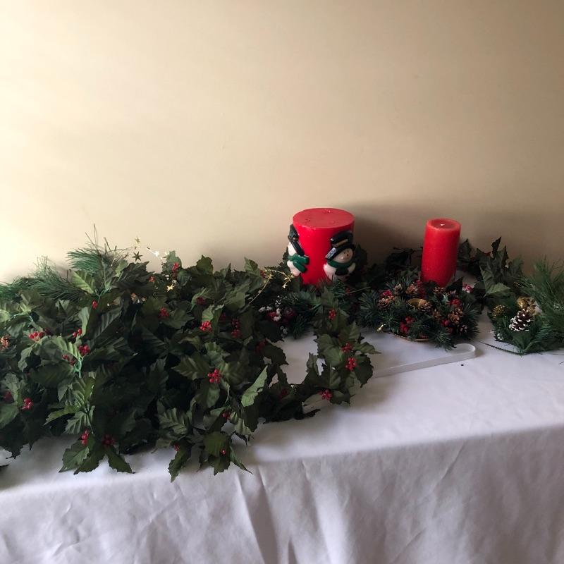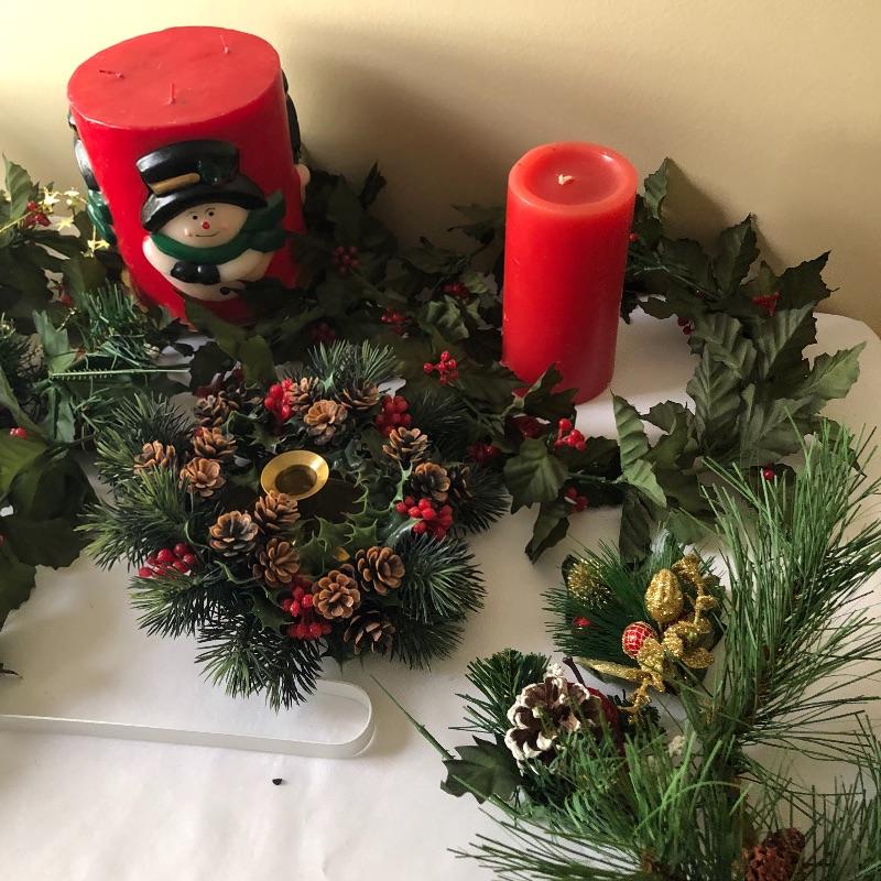 This lot includes a cardinal glass cutting board or centerpiece, three gold decorative votive holders, two garland decorative pieces, lots of garland, eight plaid napkins with matching oval red and plaid table cloth, six napkin holders, eight gold charger plastic plates, ten pears, napkin rings and more! Local pick up only.