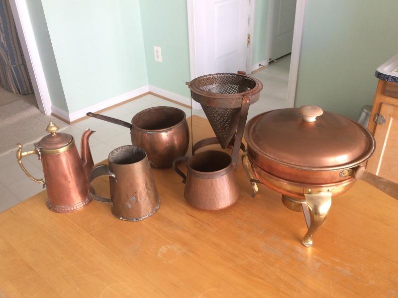 lot of 6 copper pieces, chafing dish, mug, sieve, teapot and more