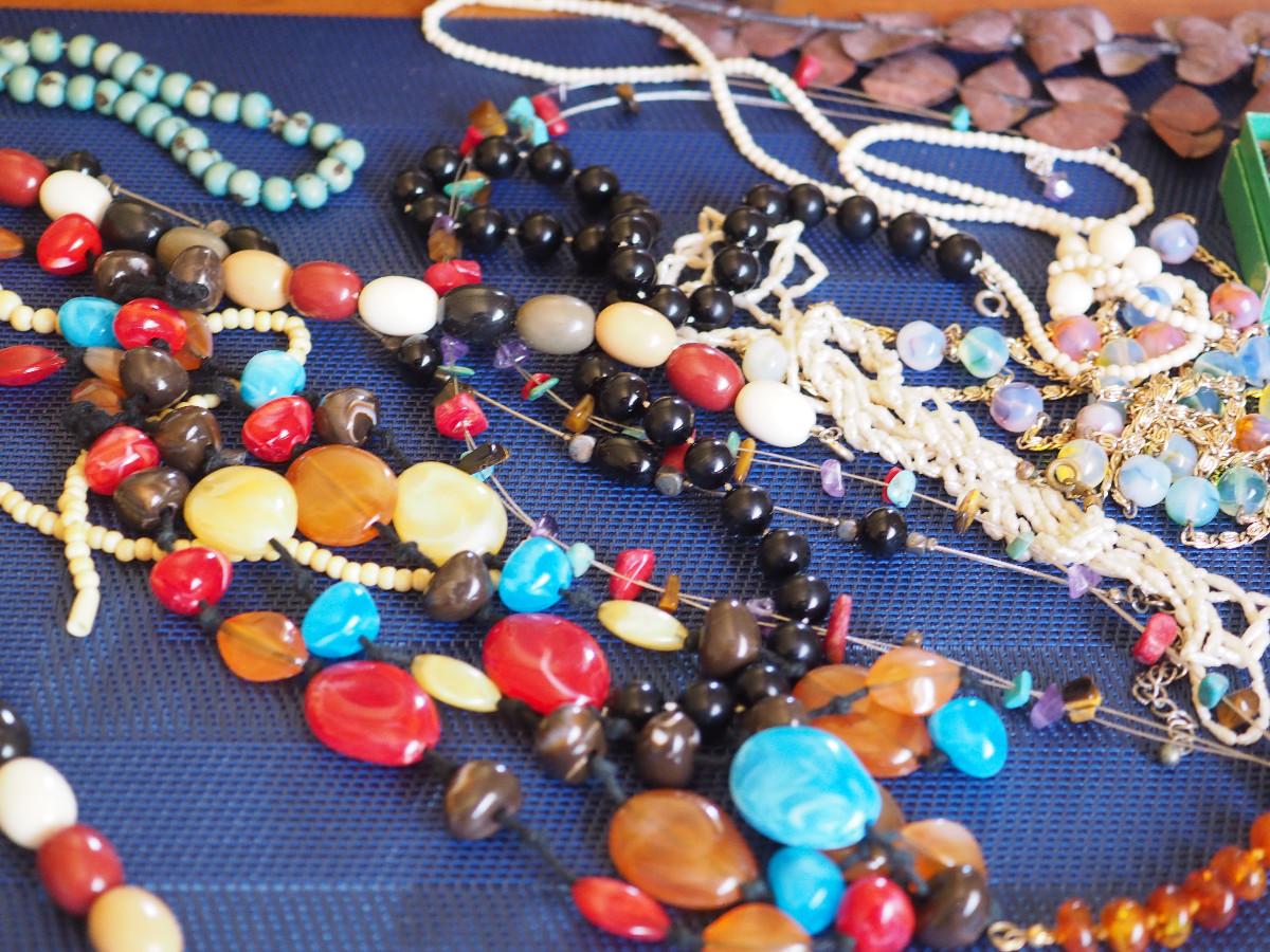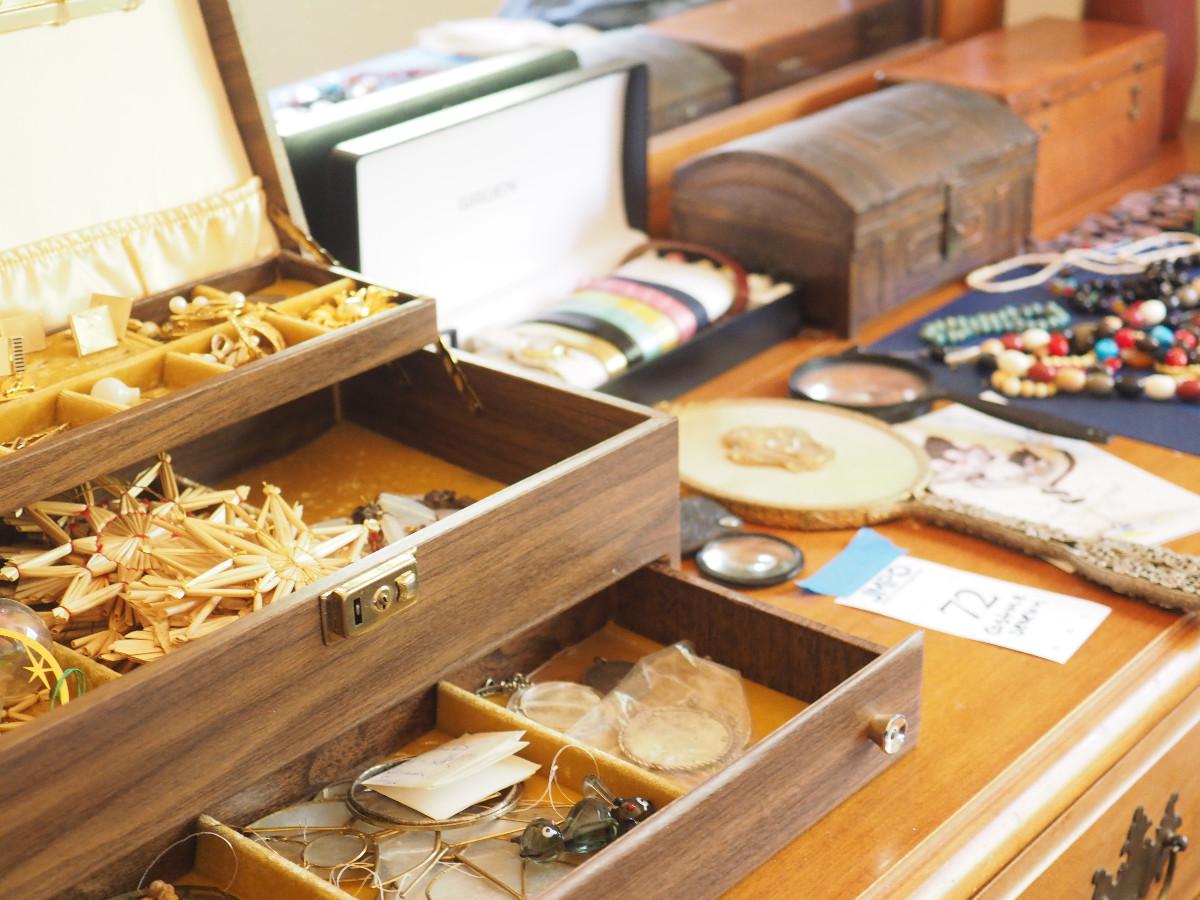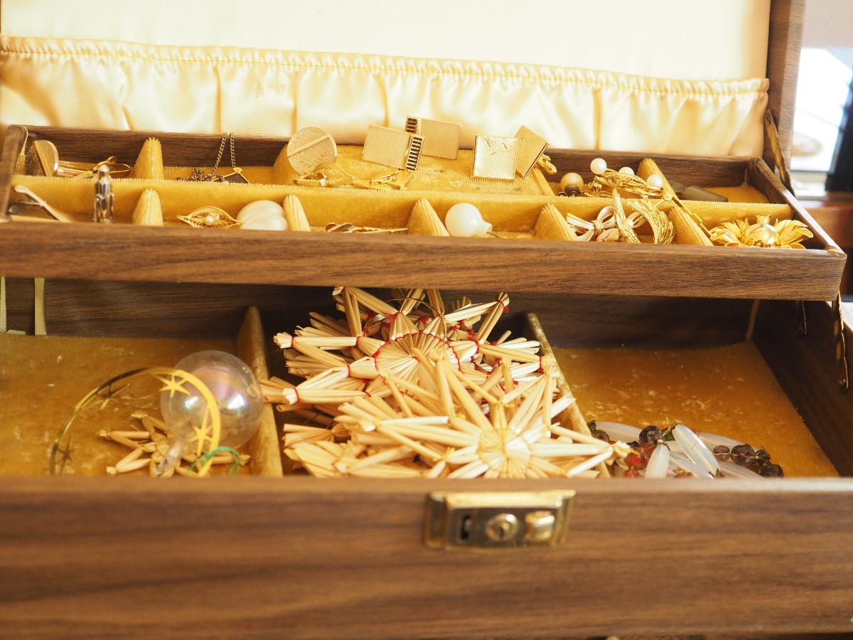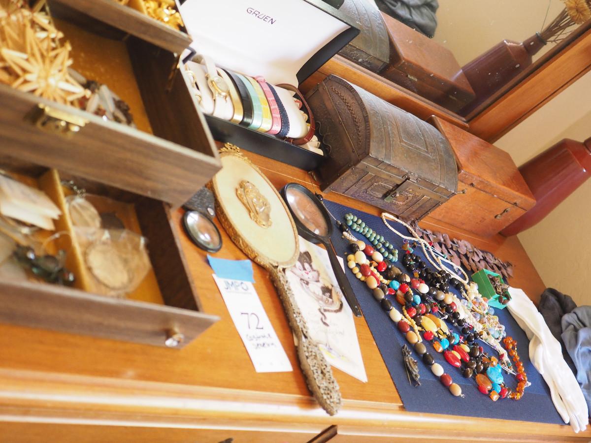 Lot 72 Costume Jewelry, vintage mirrors, gloves hats, jewelry boxes, magnifying glasses, fresh water pearls and other semi precious beads along with German straw ornaments.