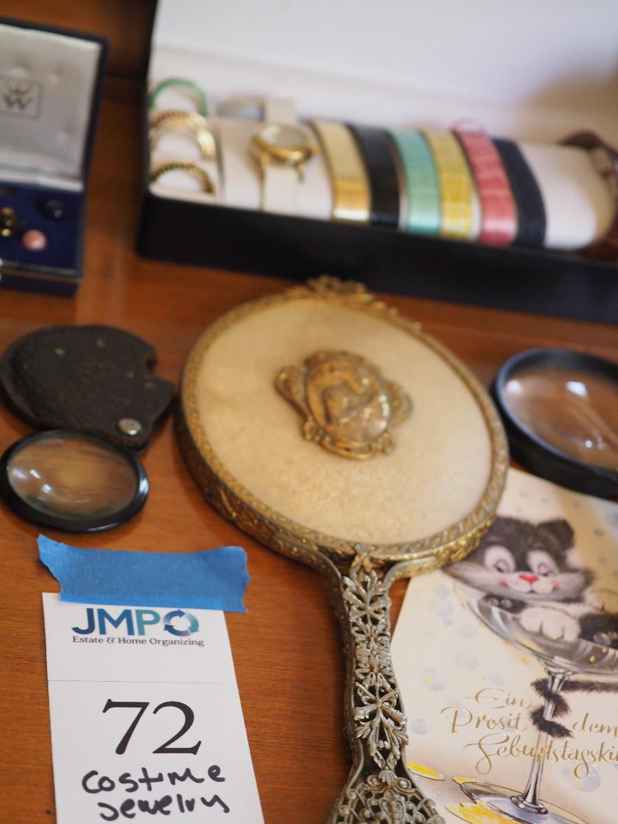 Lot 72 Costume Jewelry, vintage mirrors, gloves hats