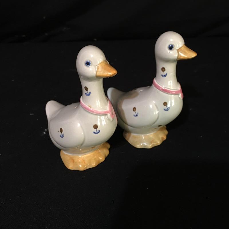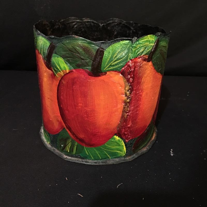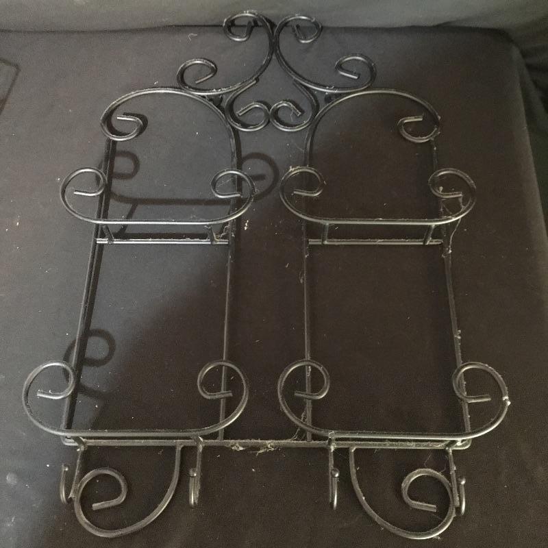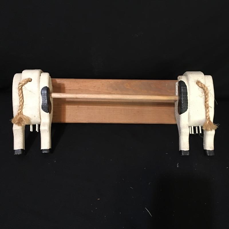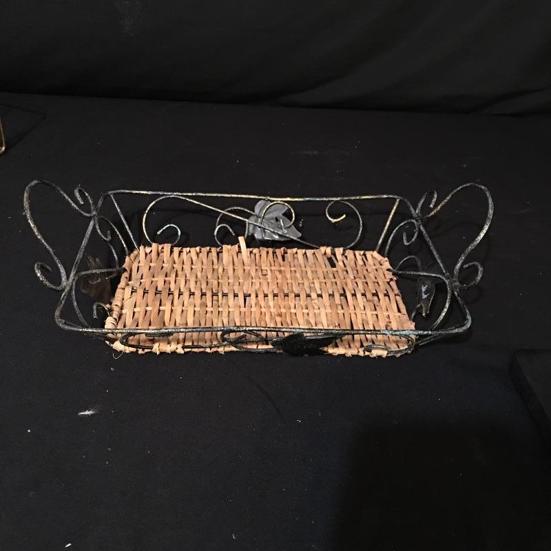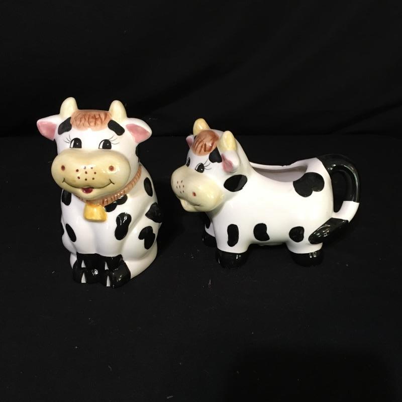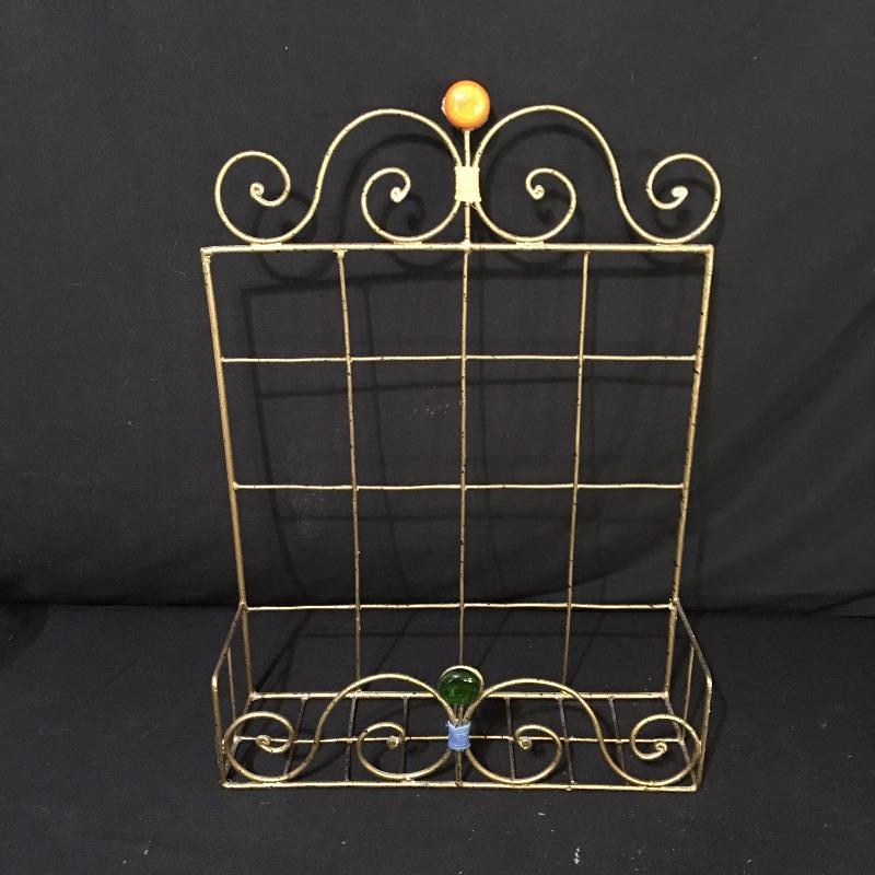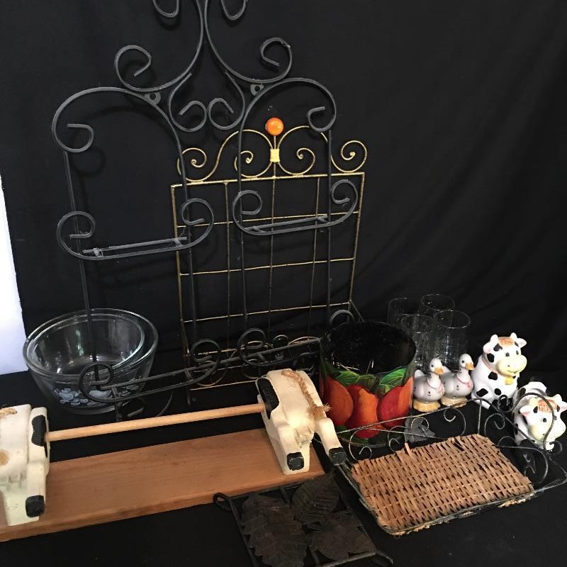Country kitchen decor. Lot includes cow paper towel holder and cream and sugar bowl, duck salt and pepper shakers, two Anchor bowls, trivet, peach design metal tin, four small glasses and two hanging display units. Largest display unit measures 18” x 25.5”.