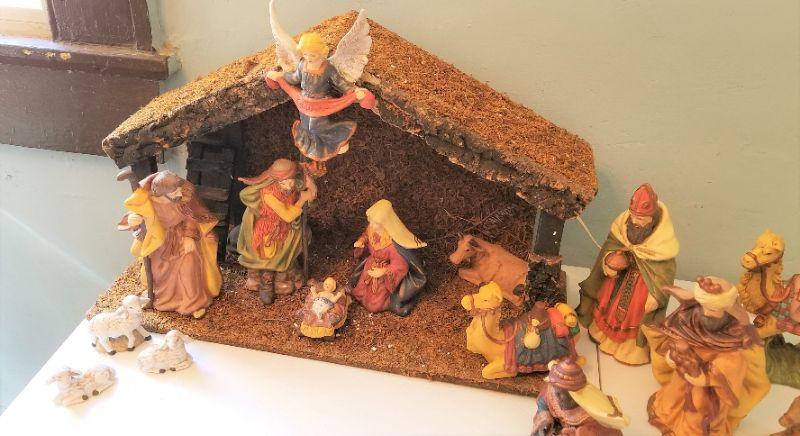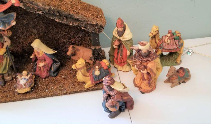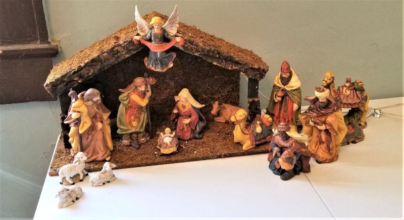 You get all you see here - lighted creche with 16 figures. See photos. Looks like someone has done a number of baby Jesus. All the other figures ok. For scale, the angel is 6" tall and the tallest King is 8" tall. Creche is 22" across, 9" deep and 13" tall. As found.