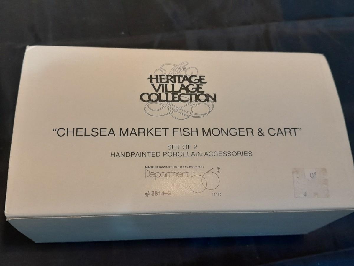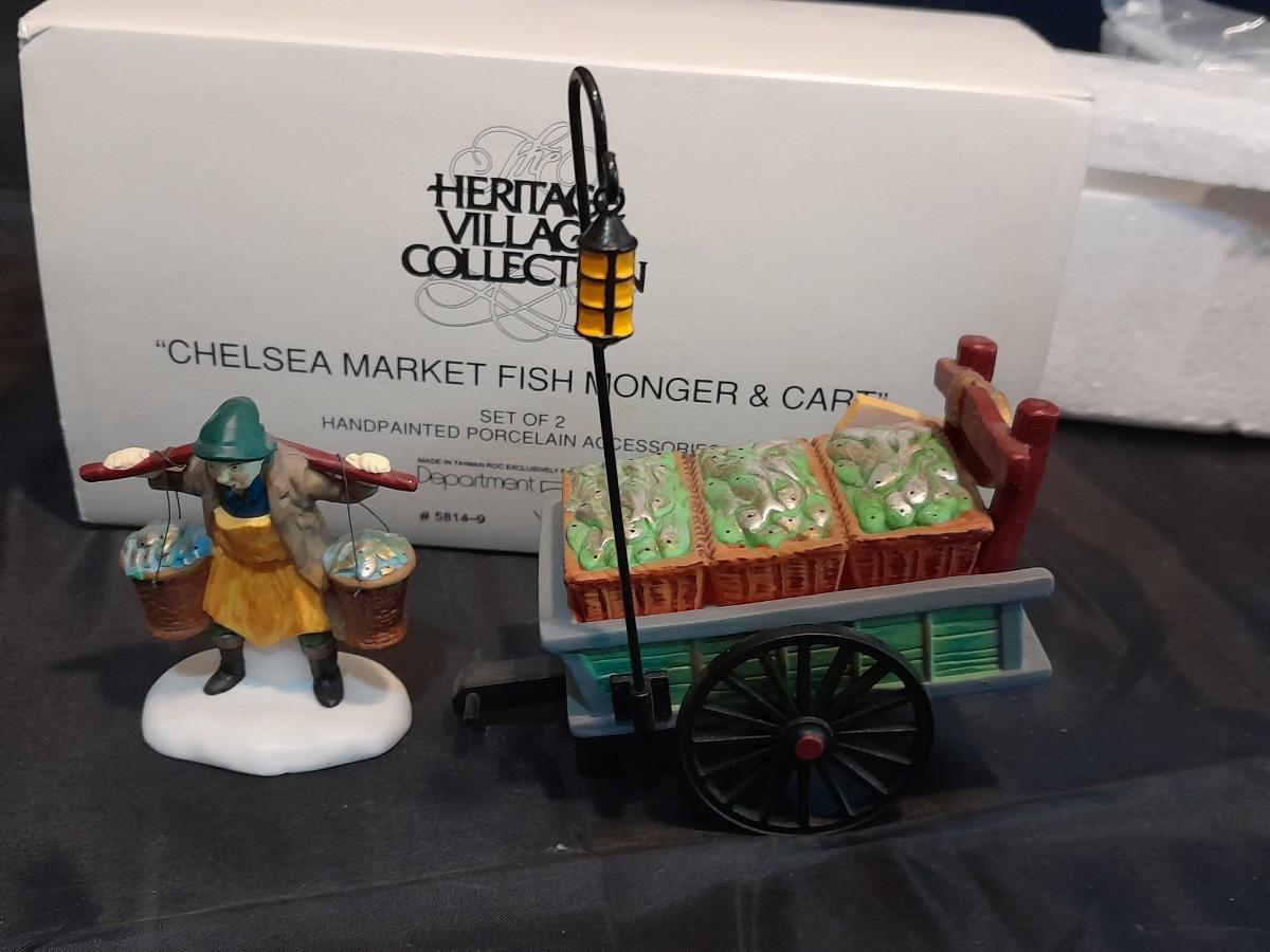 DEPARTMENT 56 VILLAGE ACCESSORIES CHELSEA MARKET FISH MONGER WITH CART AND DELIVERING COAL FOR THE HEARTH