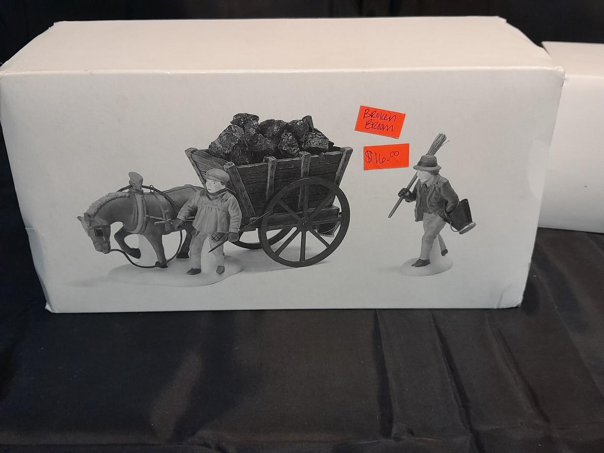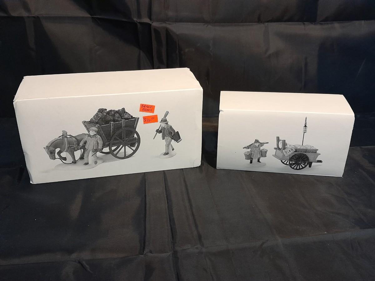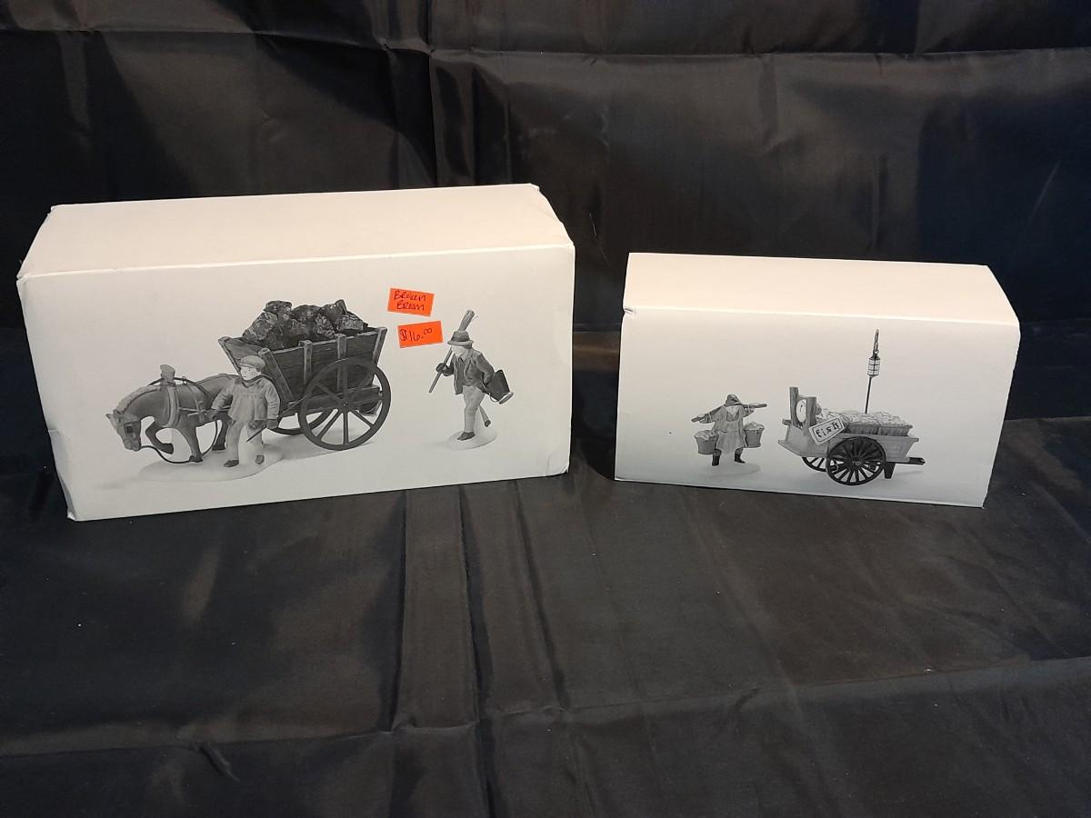 LOT 72 DEPARTMENT 56 VILLAGE ACCESSORIES CHELSEA MARKET FISH MONGER AND COAL DELIVERY