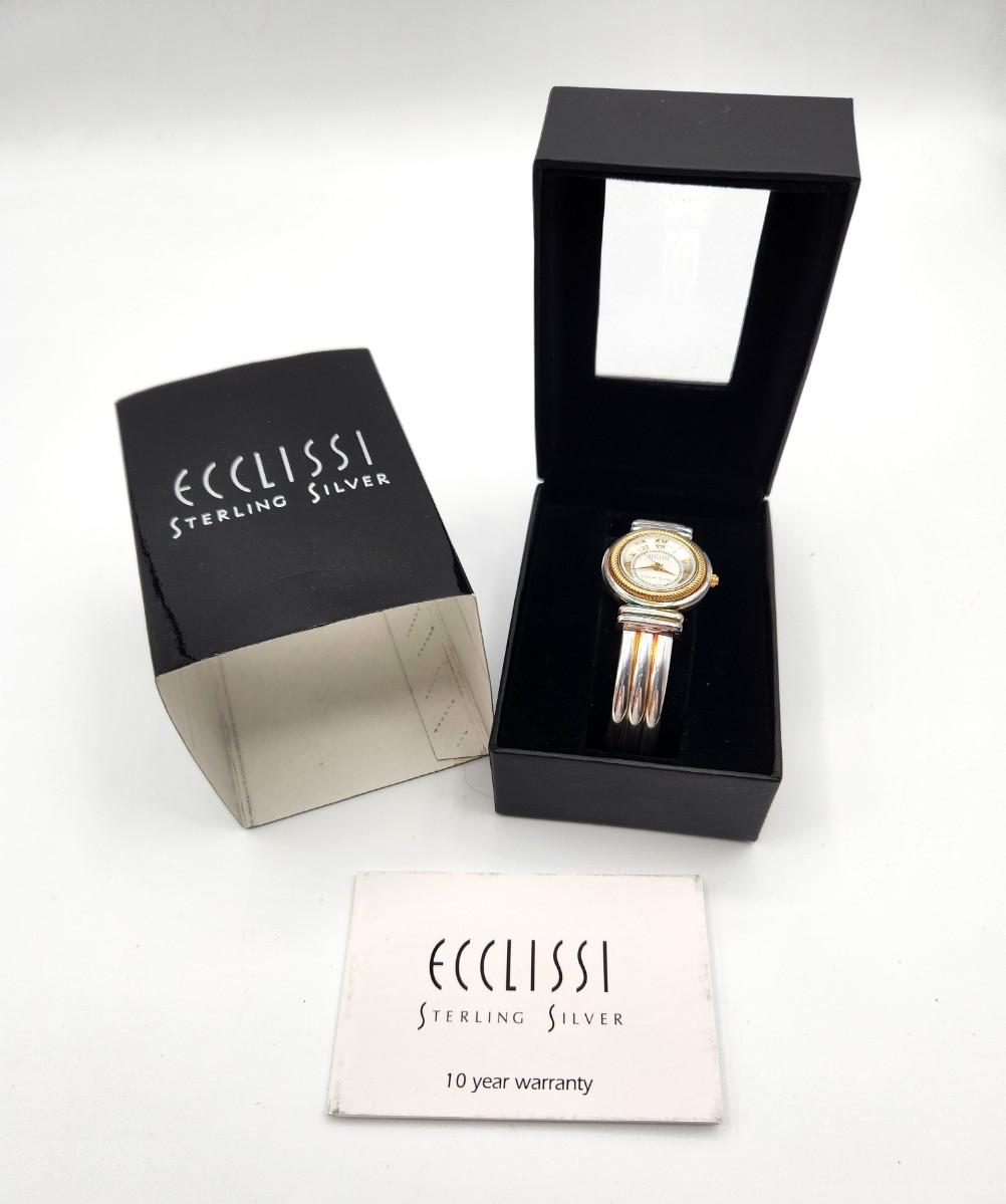 Ecclissi Sterling Silver Ladies Wristwatch - case and band sterling silver - new in box. We have installed a fresh battery and it works fine.