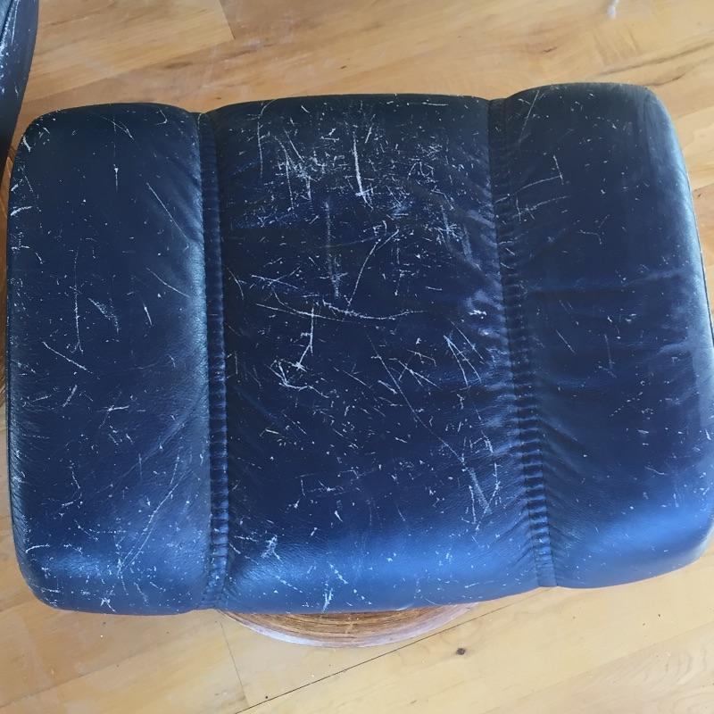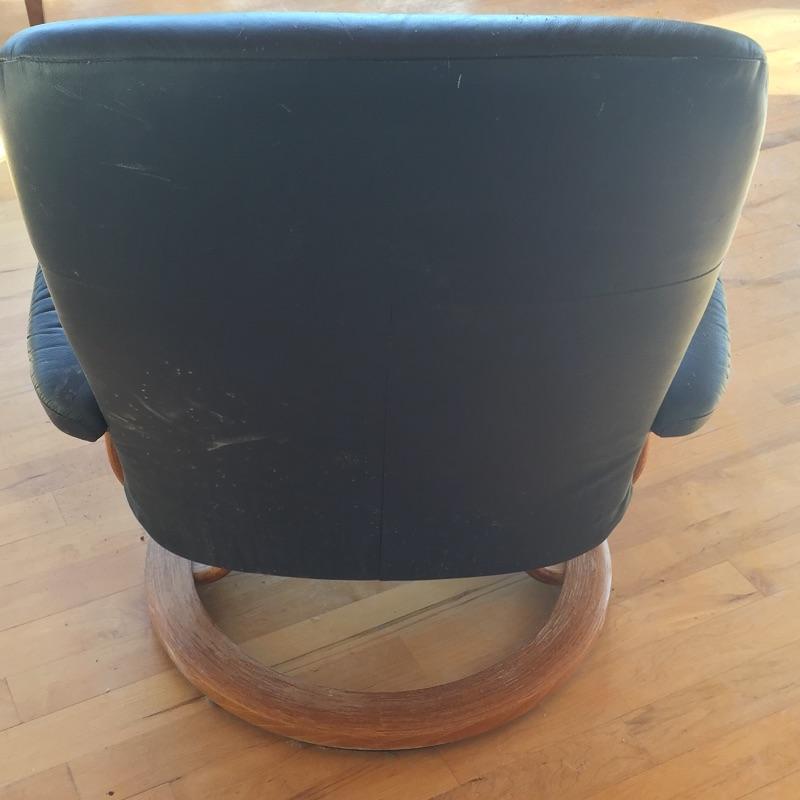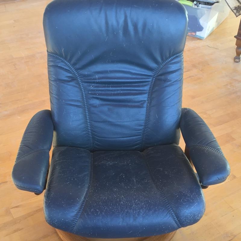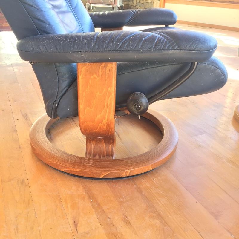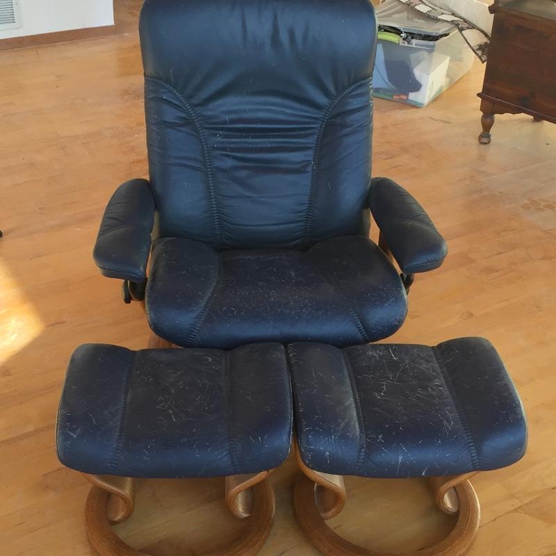 Dark blue Ekornes chair with two ottomans. Chair and ottomans have wear and what looks to be paint and car claw marks on them -see pictures.