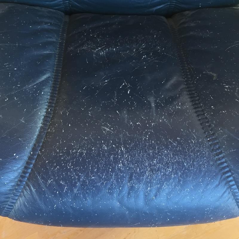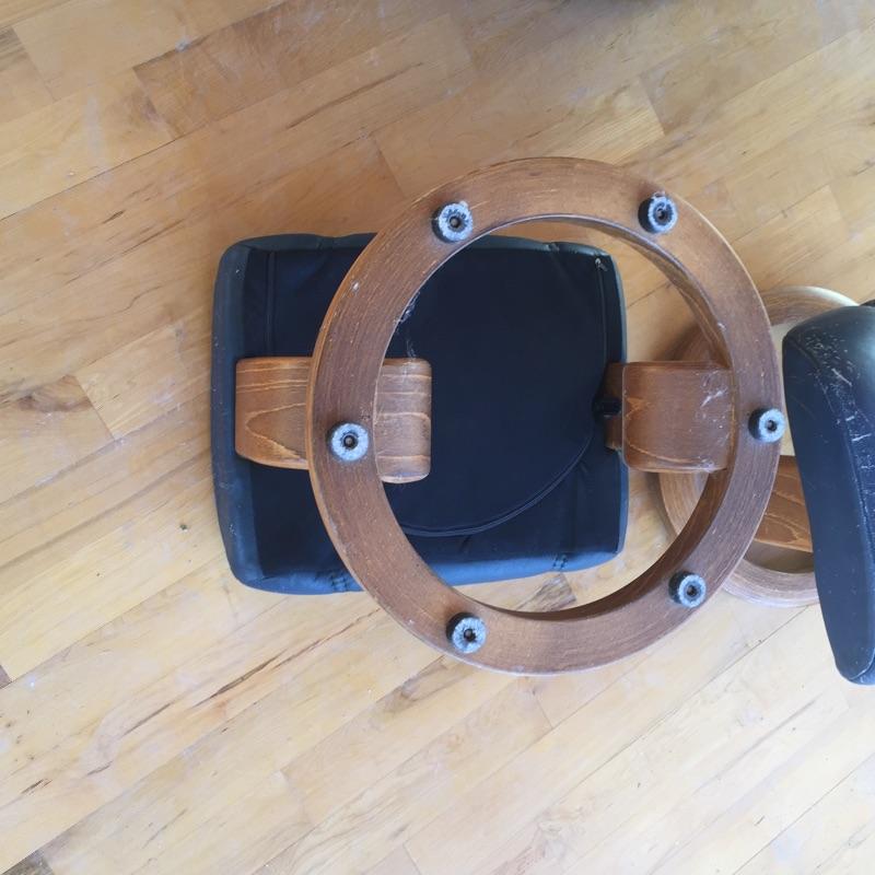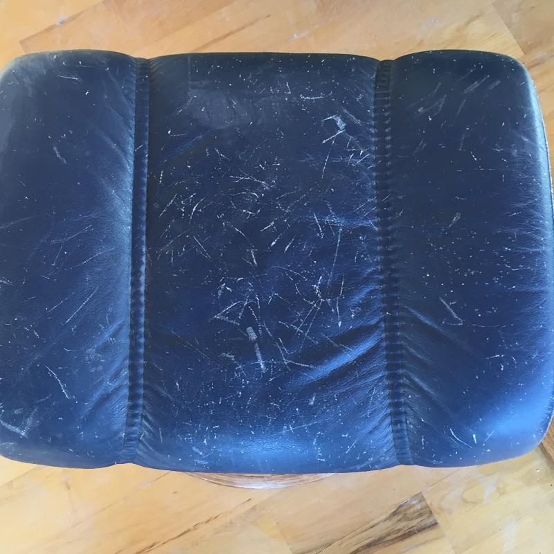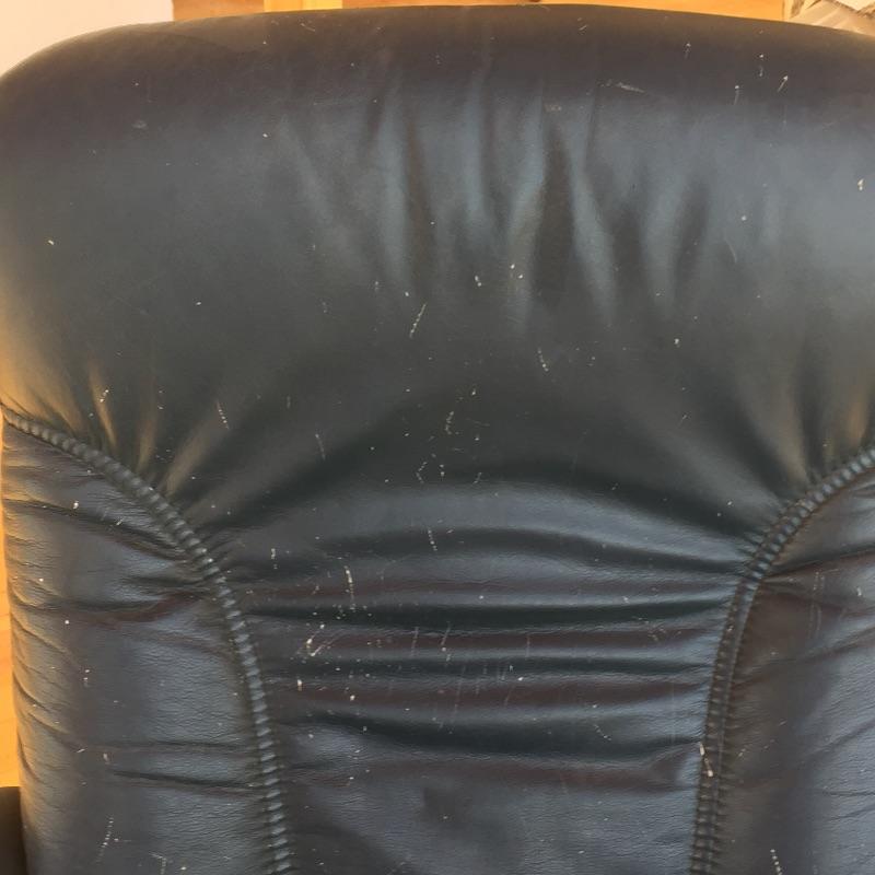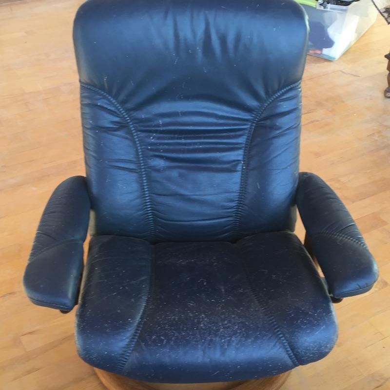 Dark blue Ekornes chair with two ottomans. Chair and ottomans have wear and what looks to be paint and car claw marks on them -see pictures.