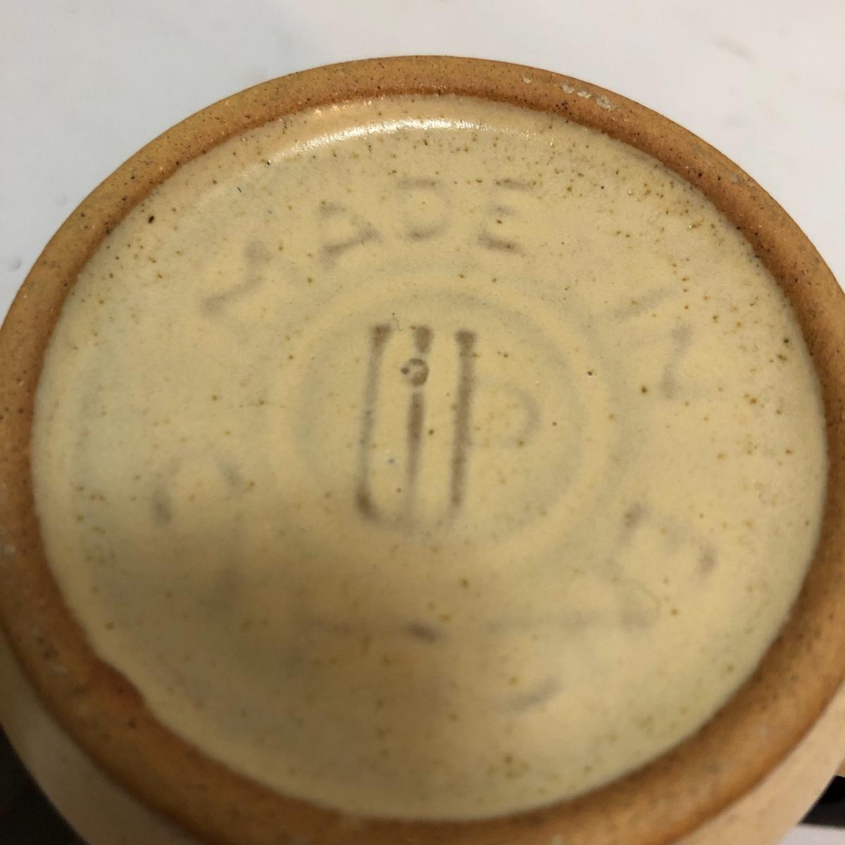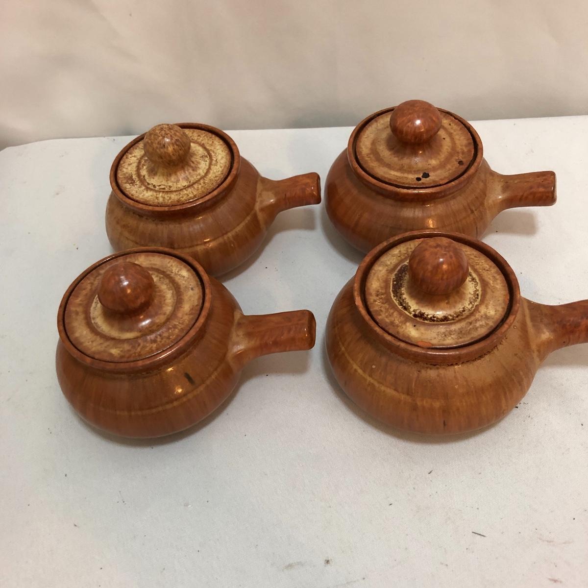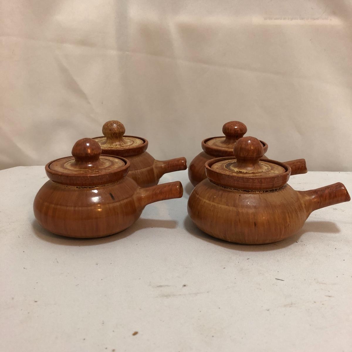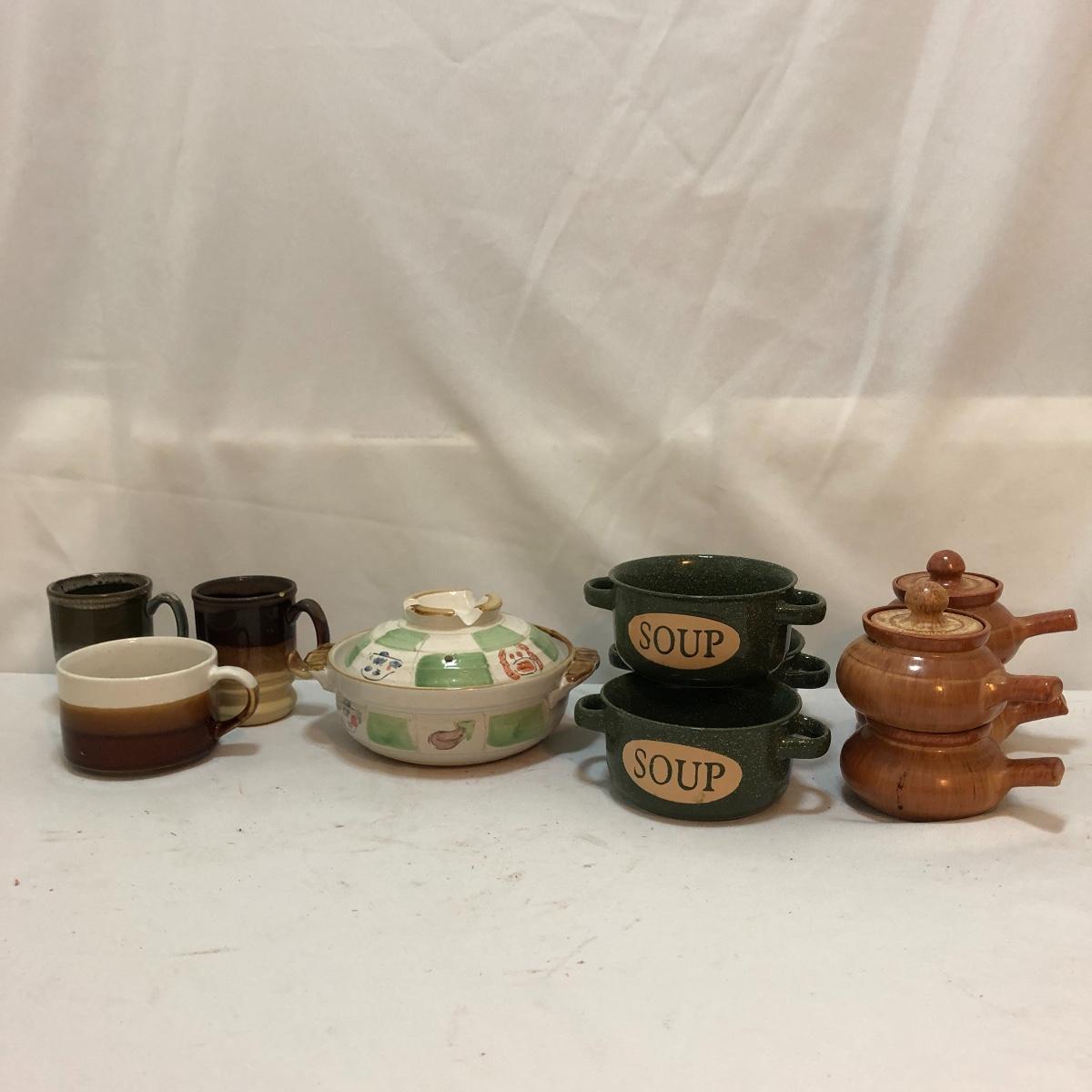 A nice selection for your college student. Lot includes four small crocks with lids that look deceivingly like wood but are crocks also, three Mulberry soup bowls, dish with lid, two English coffee cups and a unmarked mug.