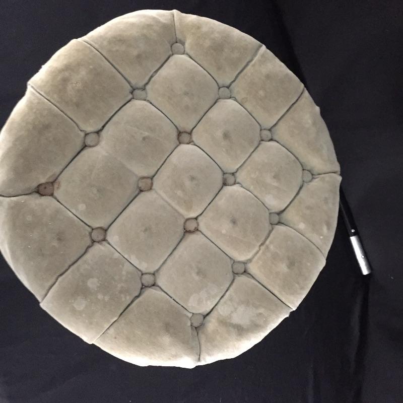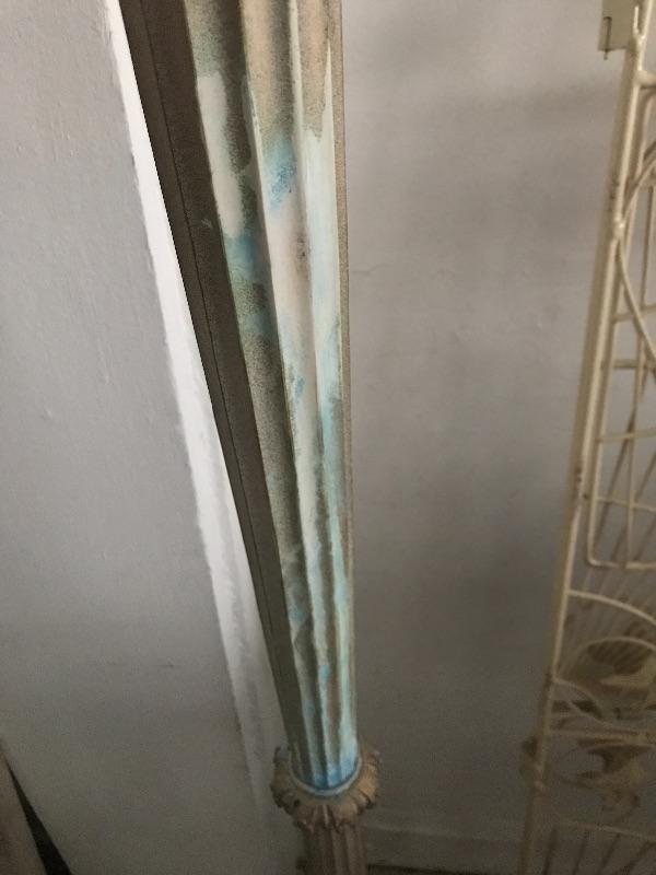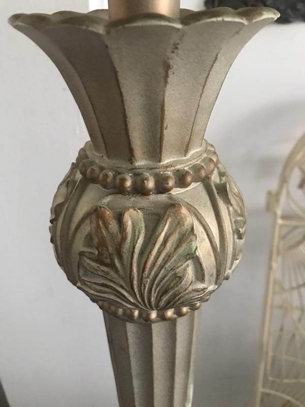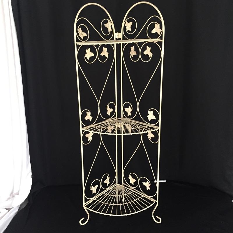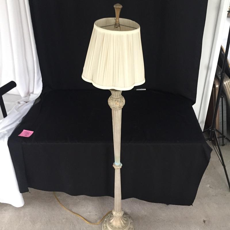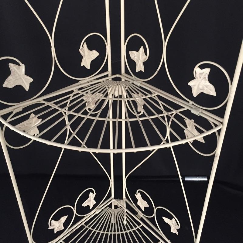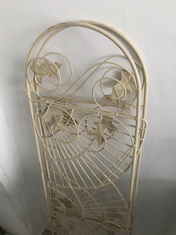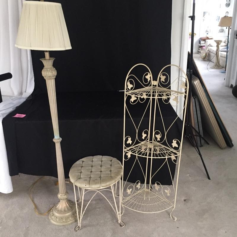 Three shelf plant stand, small stool and floor lamp. Stand can collapse to store. Stool upholstery is a bit stained but a solid piece. Lamp looks like it is made of painted terra cotta. Has some blue stains that could possibly be wiped off. measures 63” tall.