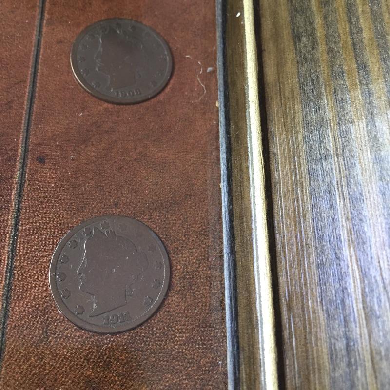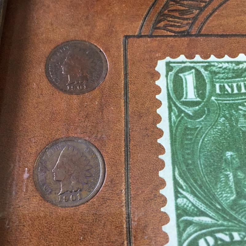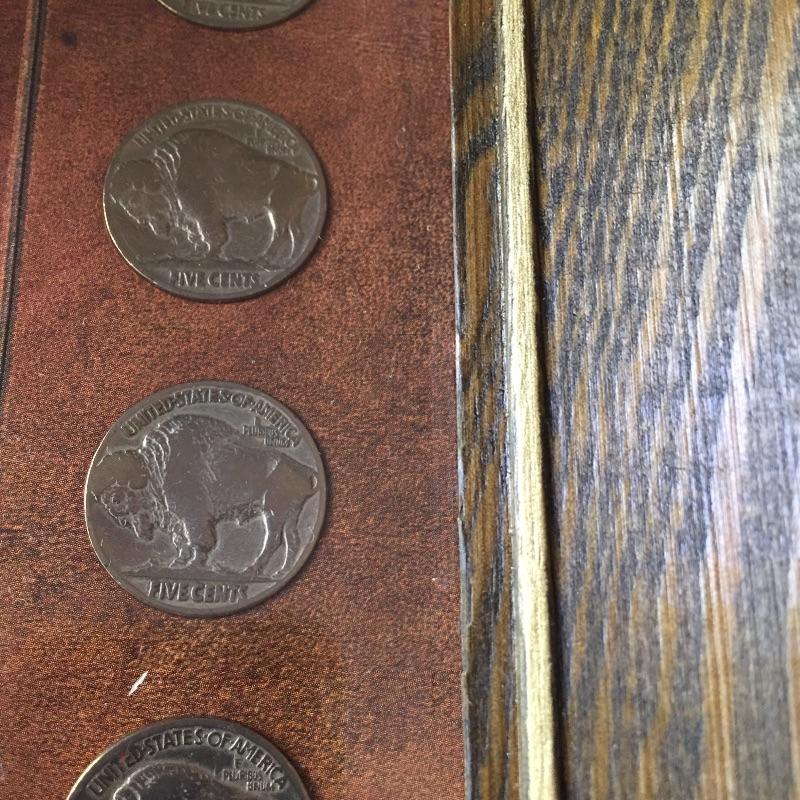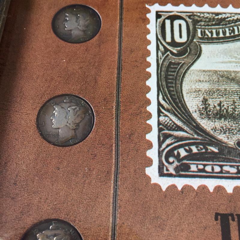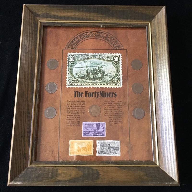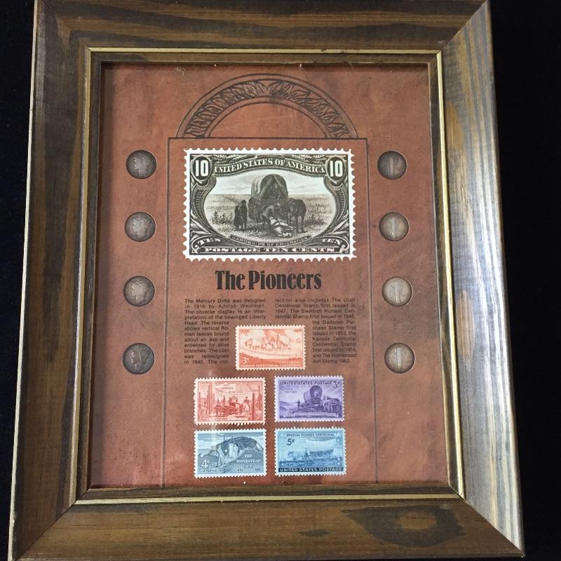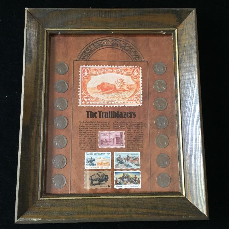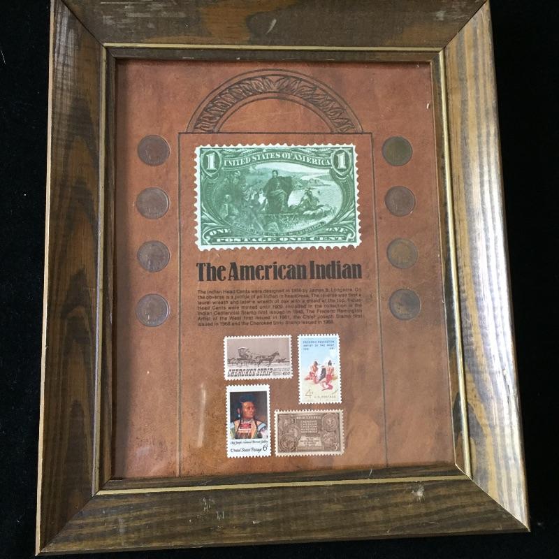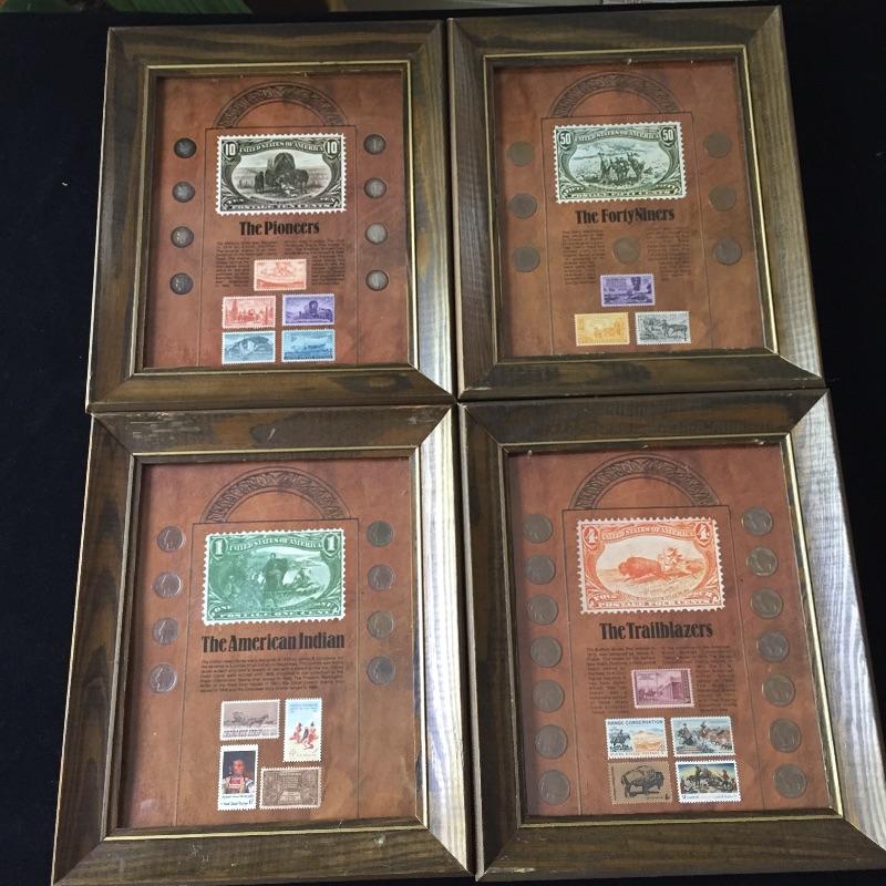 Four framed sets of coins and stamps including Indian head cents, Liberty head nickels, Mercury dimes and Buffalo Nickels. Frames measure 10.5” x 12.5”.