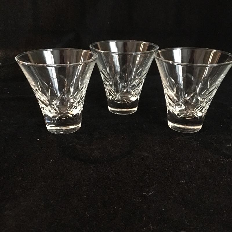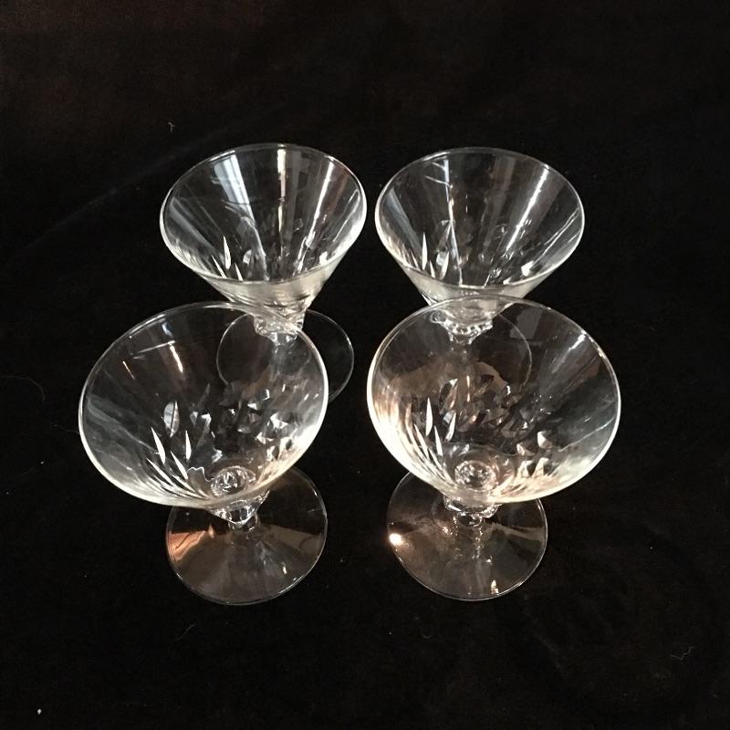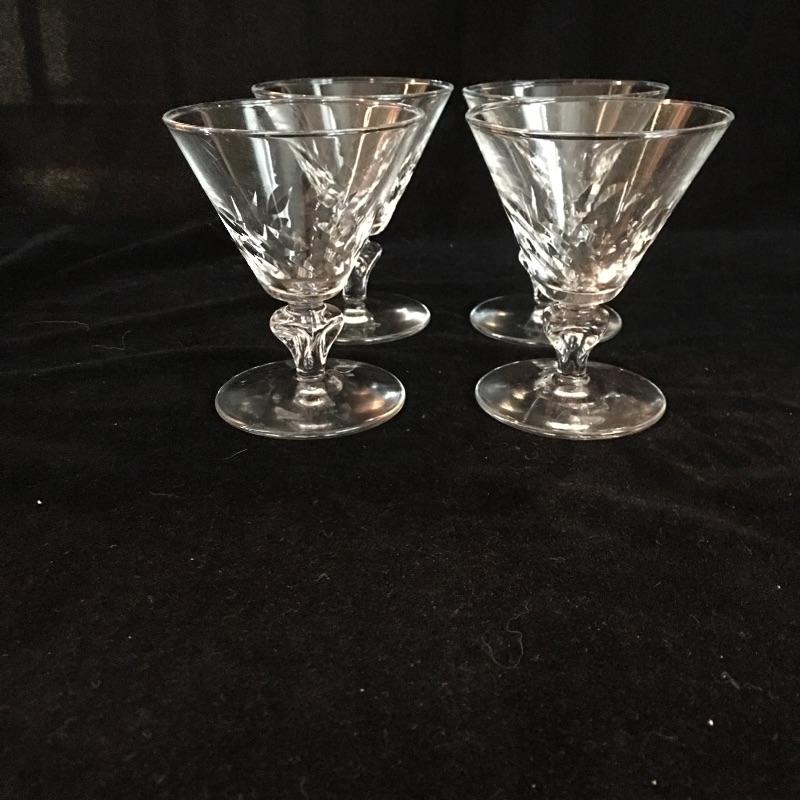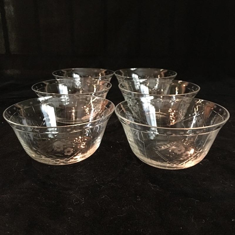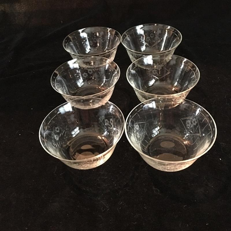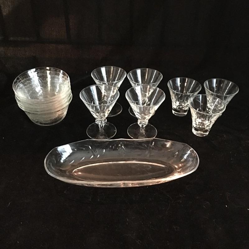Assortment of glassware includes six small bowls, four stemmed glasses, three small glasses and a glass tray. Largest glasses measures 4” tall.