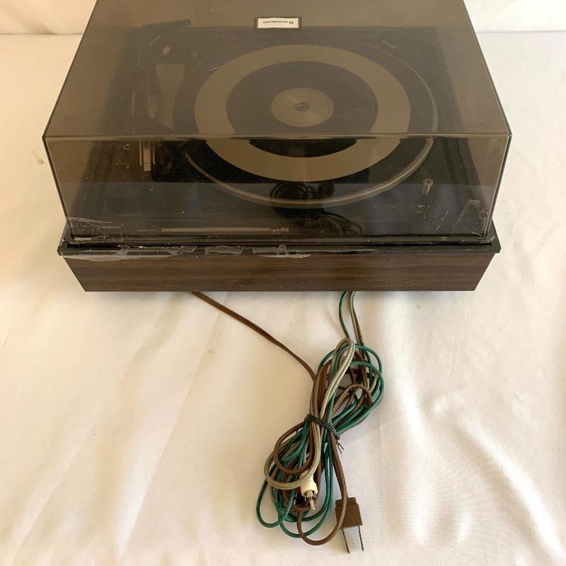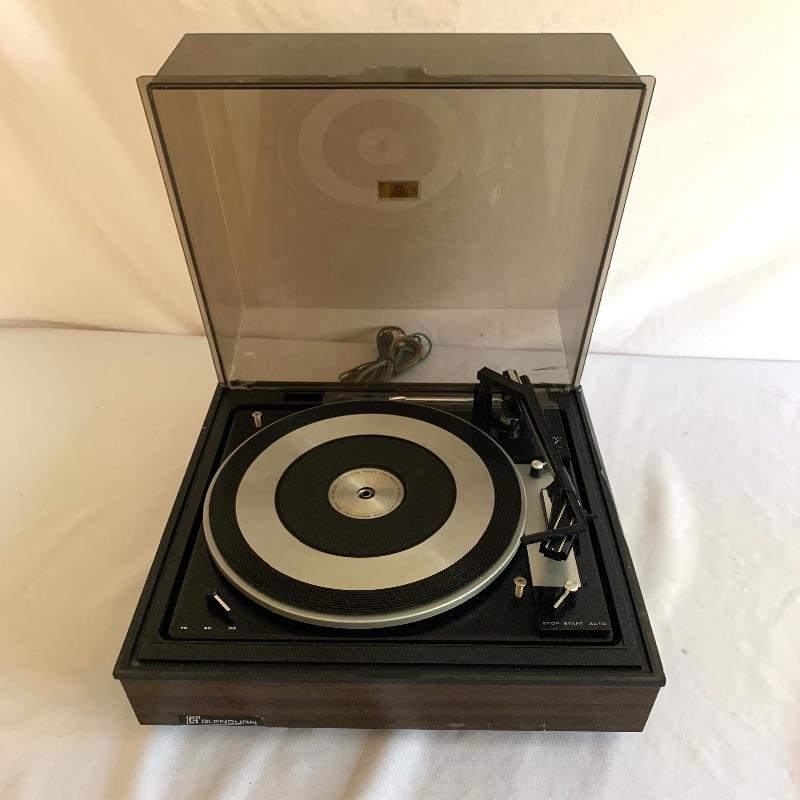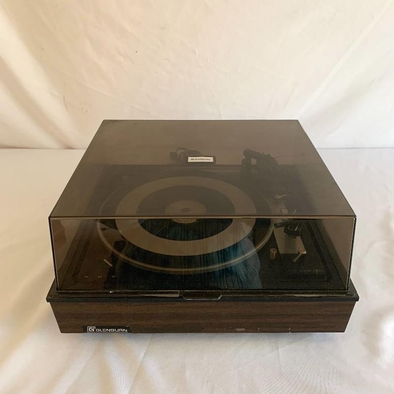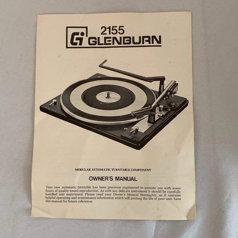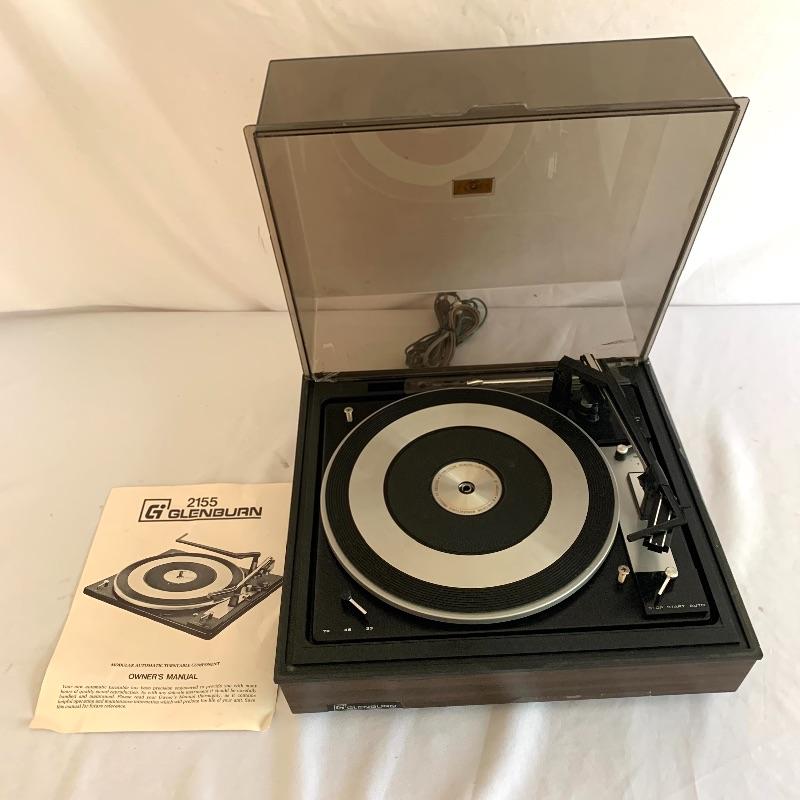Glenburn 2155Q Automatic 3-Speed Turntable. Powers on when plugged in. Has a base and plastic lid. Also comes with an Owner’s Manual.