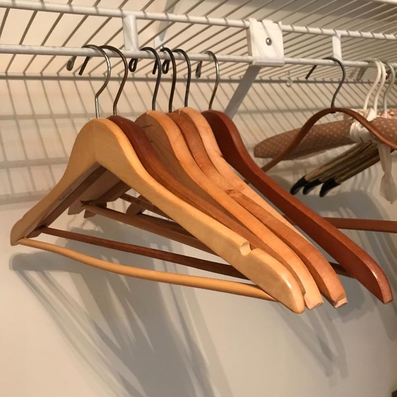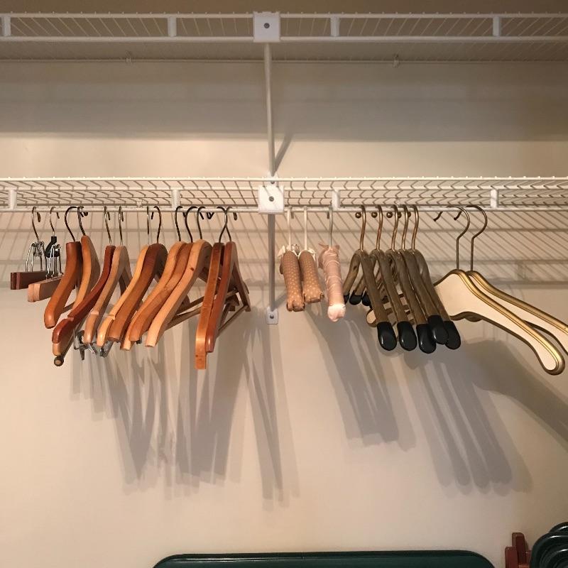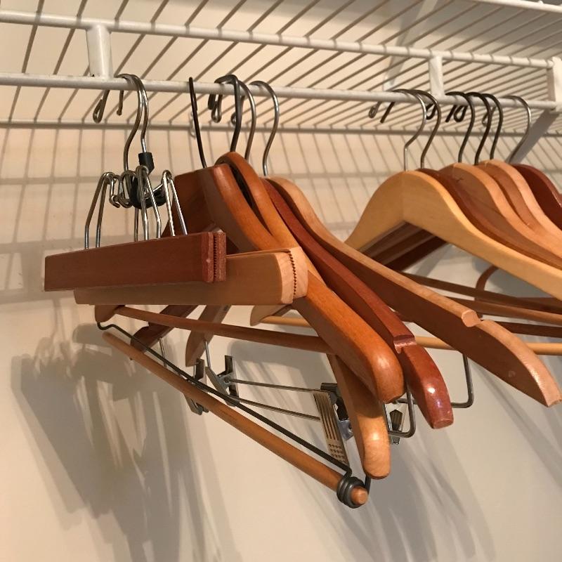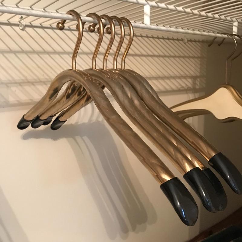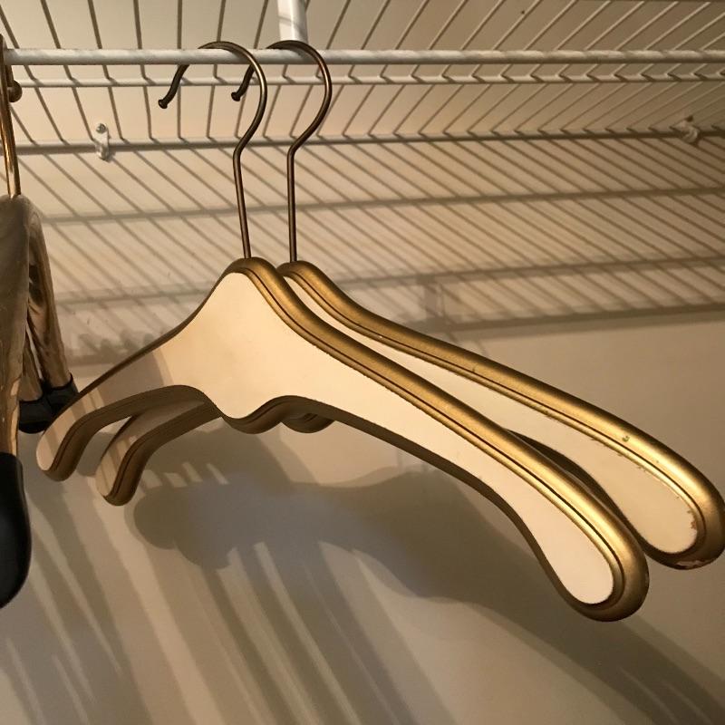 Upgrade your hangers with some funky gold metal hangers that includes a nice variety of hangers for your wardrobe needs. Standard wooden hangers, fancy gold and ivory wooden hangers, hangers for suits/slacks and cloth covered for those slippery items. Local Pickup Only.