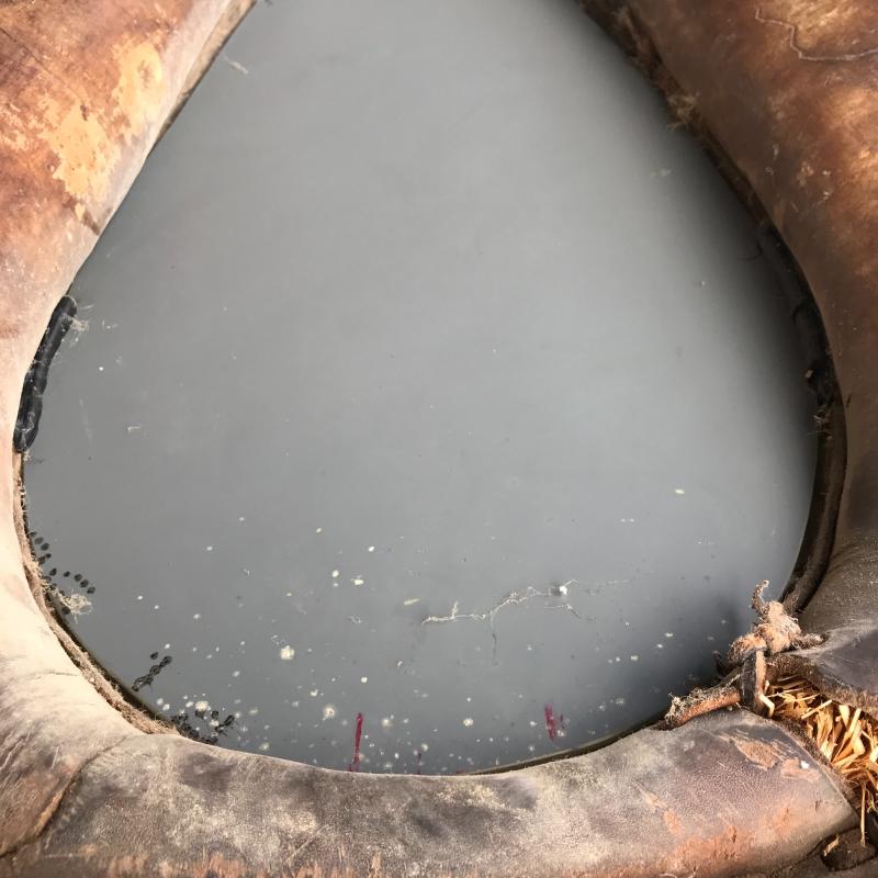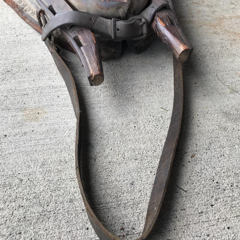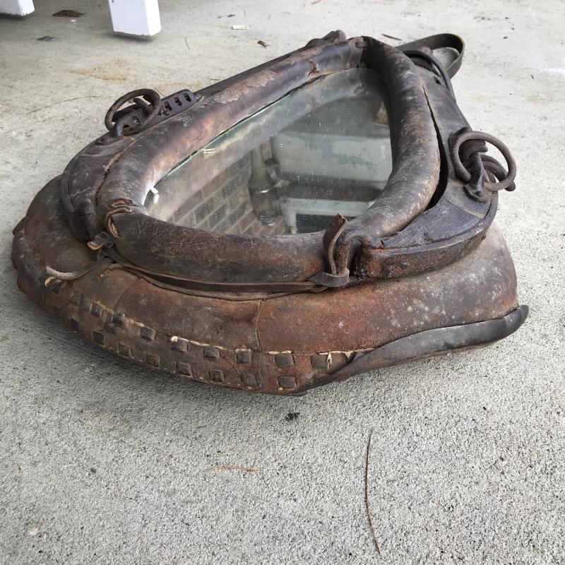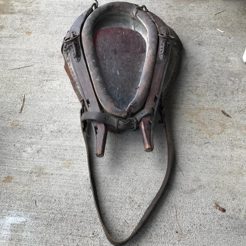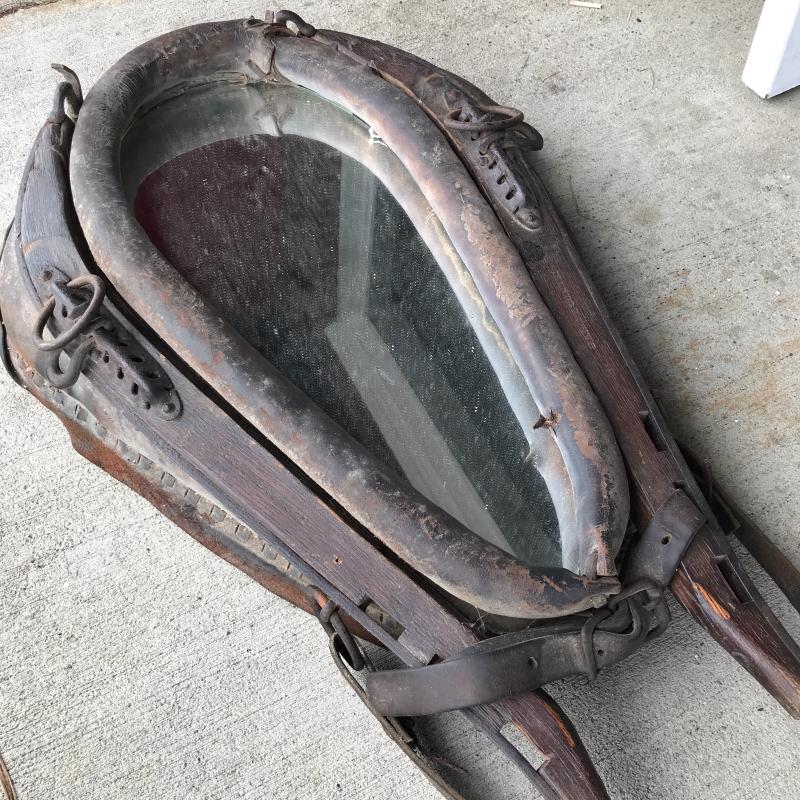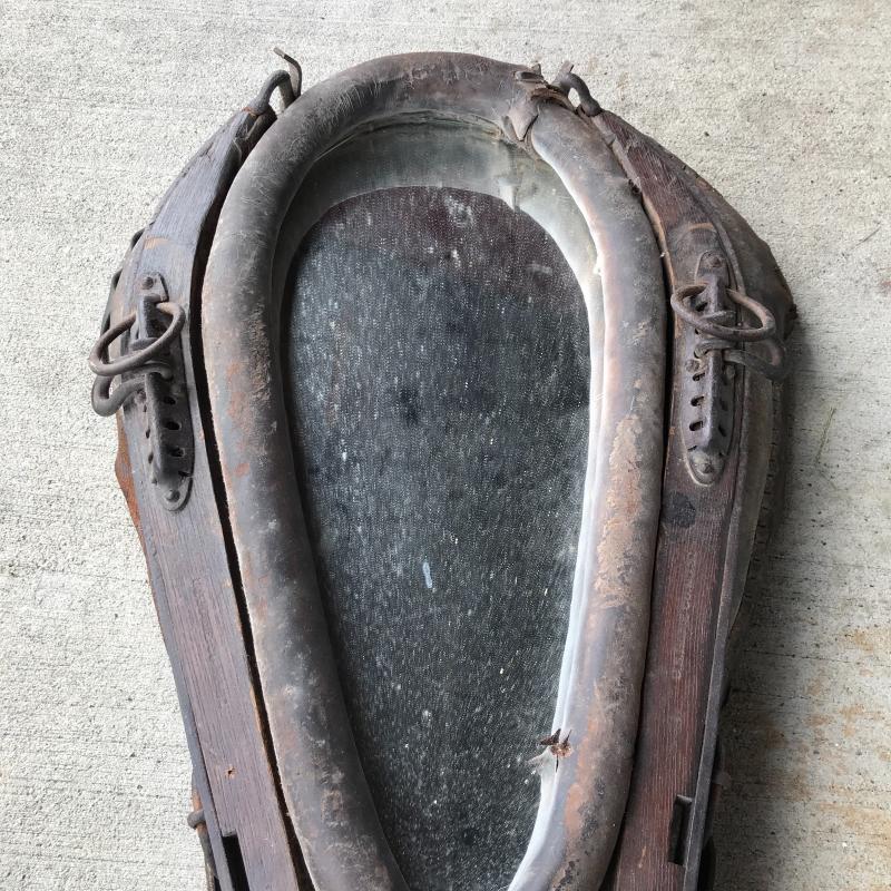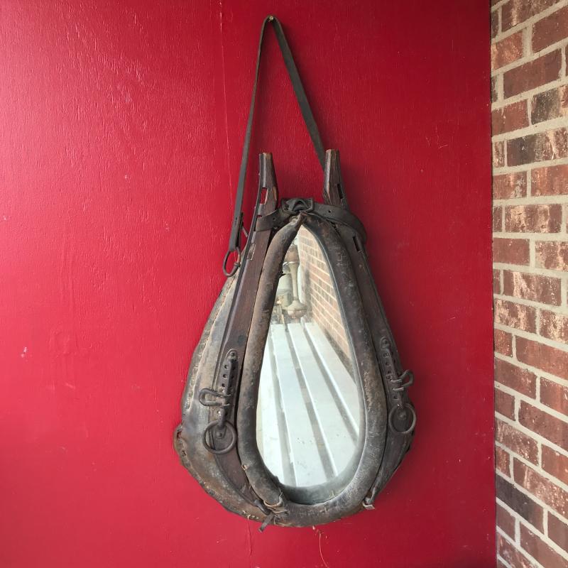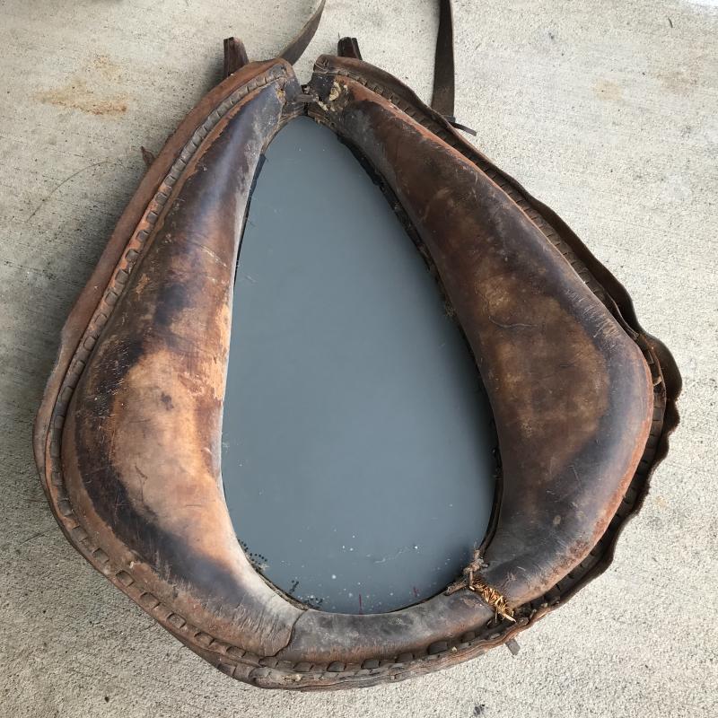 This ox harness is in great condition, from Cataloochee Ranch. Has a mirror installed in center to make it functional when hung on a wall. Leather strap is in good condition. Measures 30” x 21” x 5”. Local pick up only in Maggie Valley.