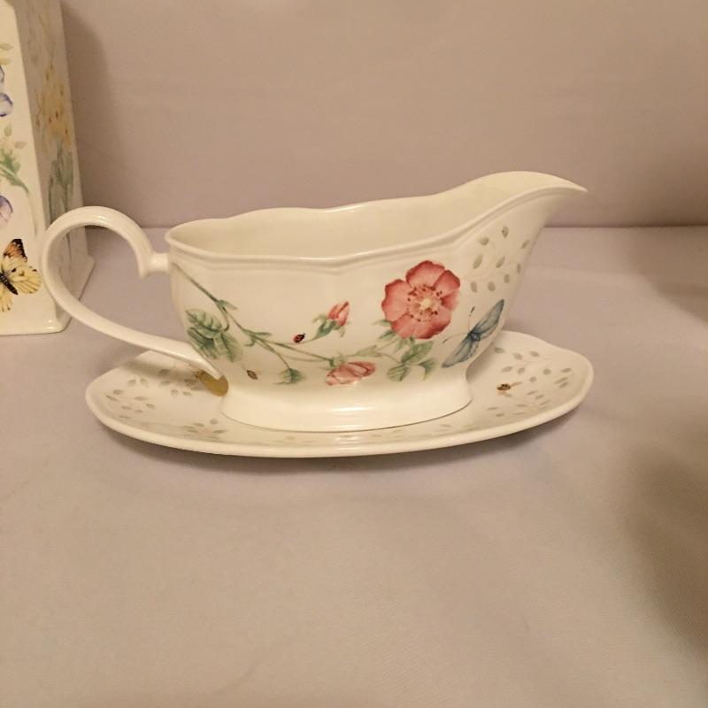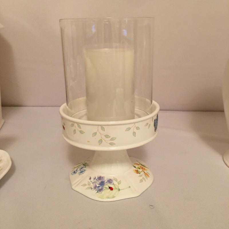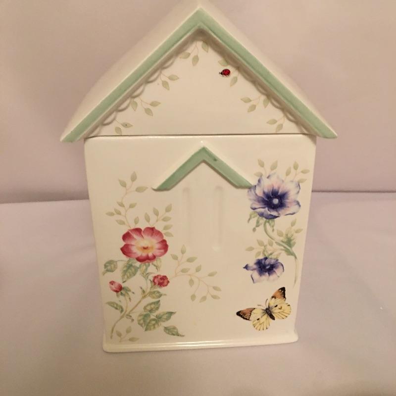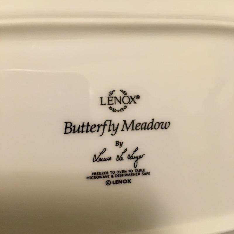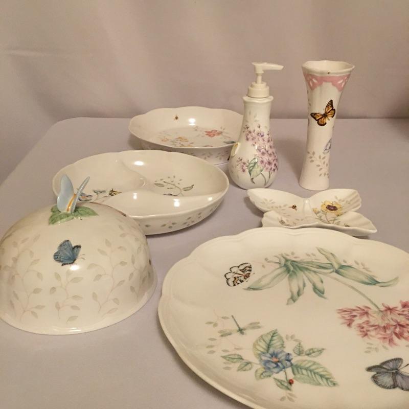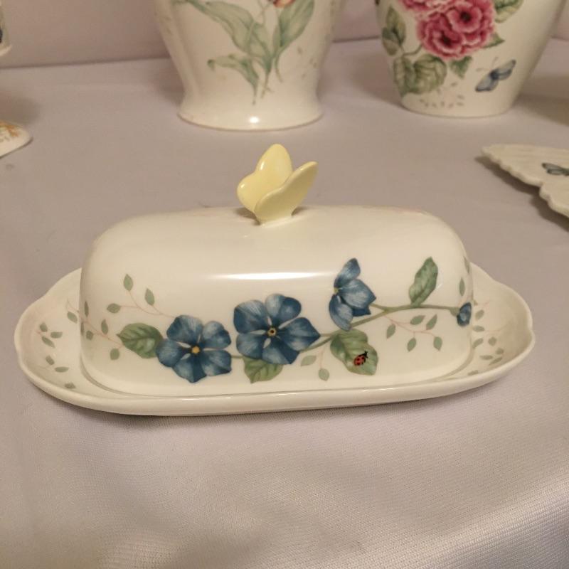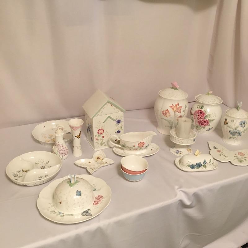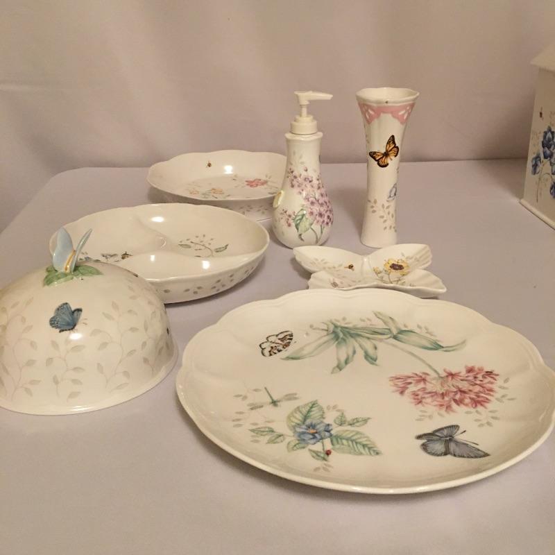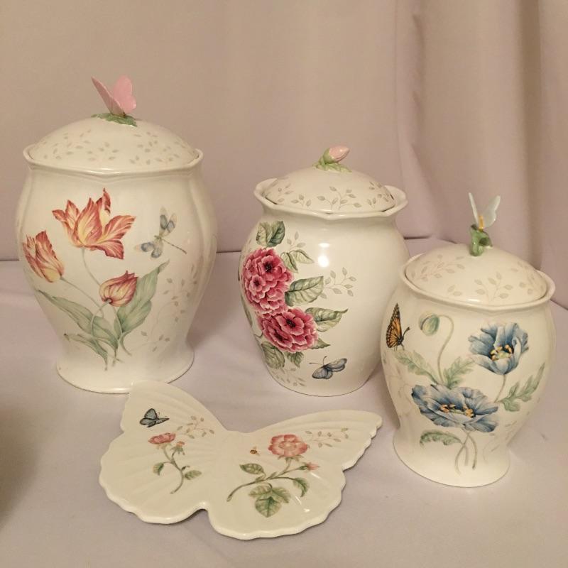 Lenox butterfly meadow dishware includes three canisters, candle holder, cookie jar(11”tall), vase, lotion dispenser, three serving dishes, pair of small bowls and more. Dishes match lot # 24.