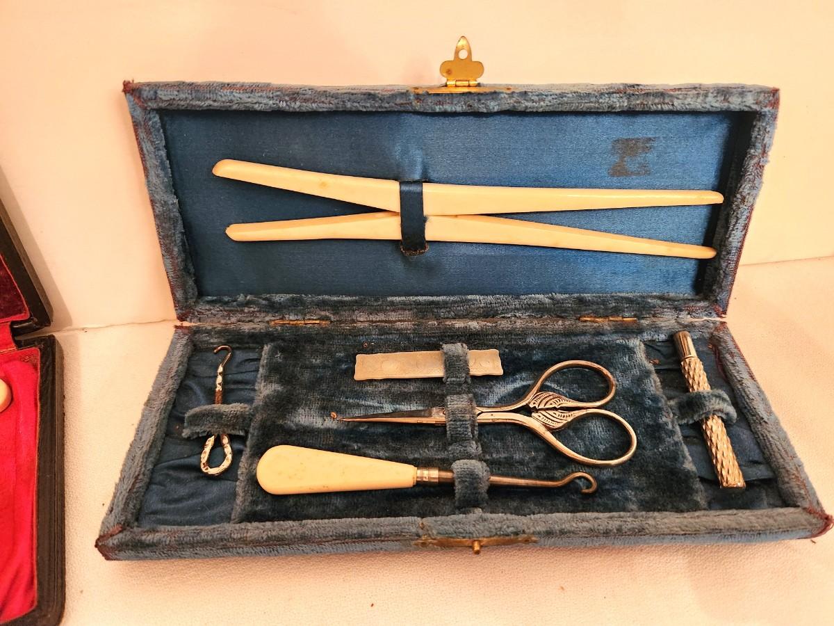 You get all you see here - two antique fitted boxes (ca 1920) containing a complete manicure set - glove stretcher, button hooks. scissors, etc. All original