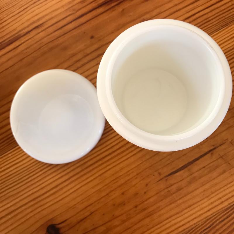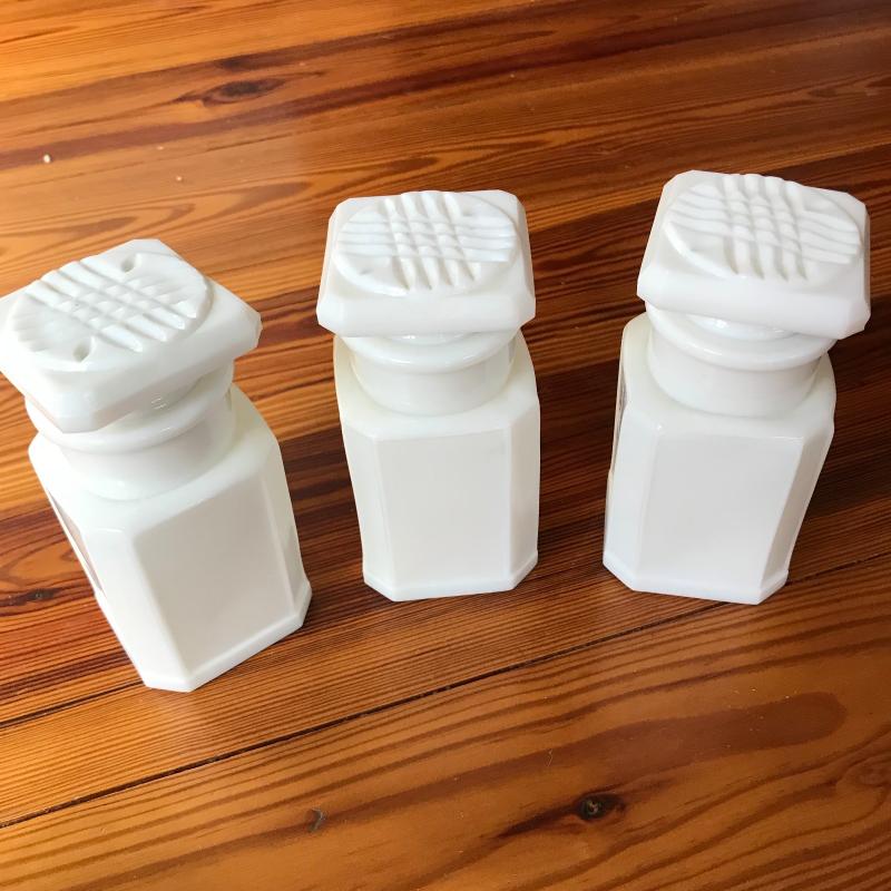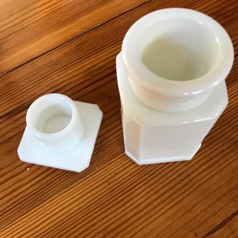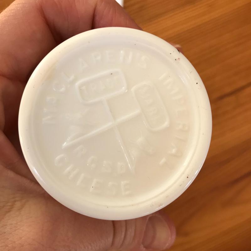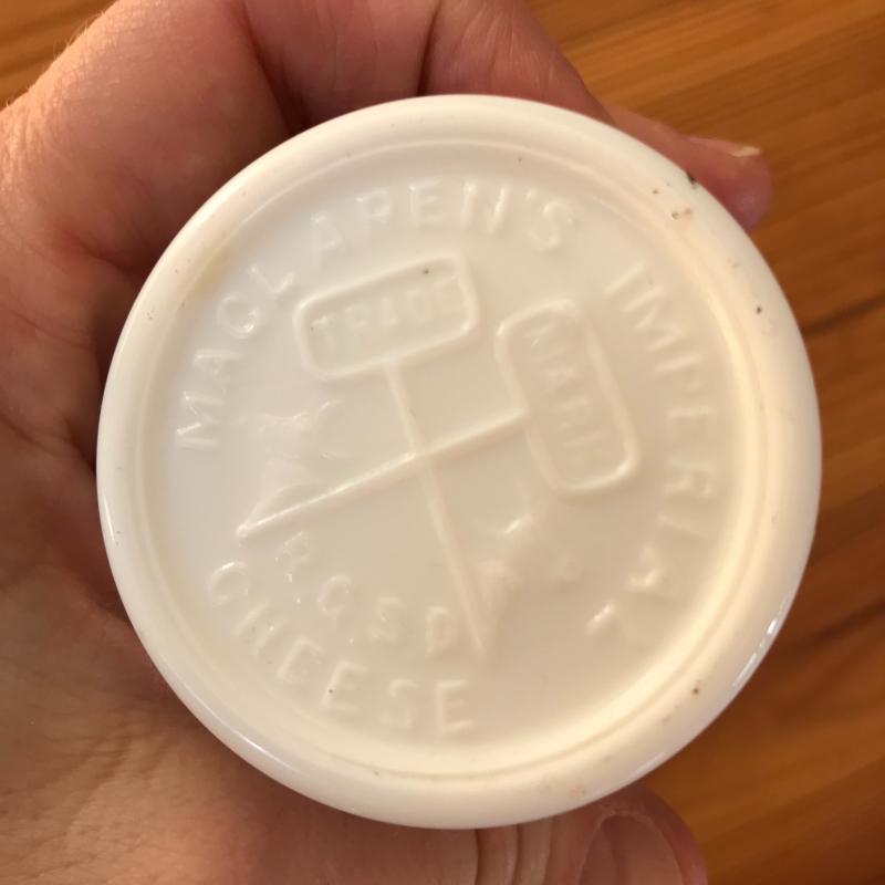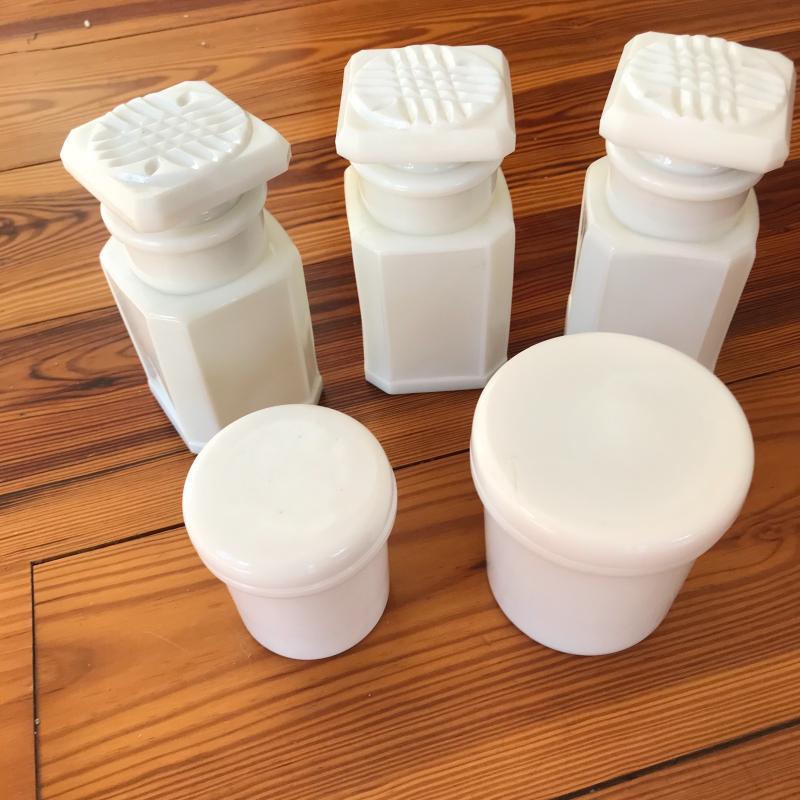 Five lidded milk glass canisters. Three match and are approx. 5” tall. Two smaller canisters are marked on bottom, “Maclaren’s Imperial Cheese.” Shipping available or local pickup in Asheville, NC.