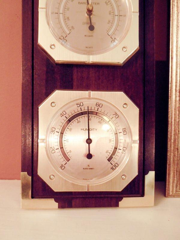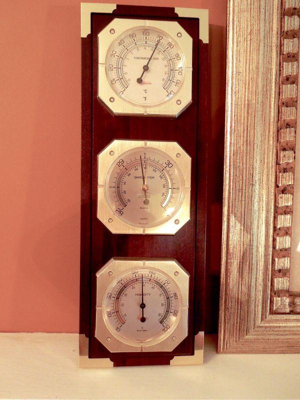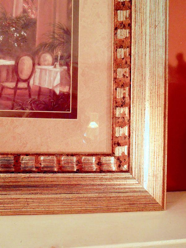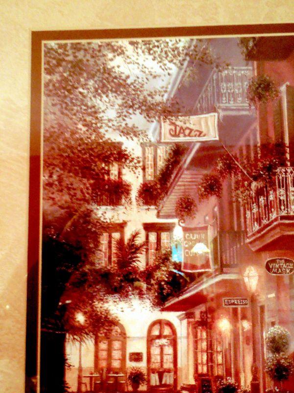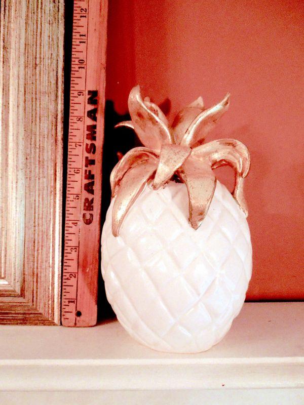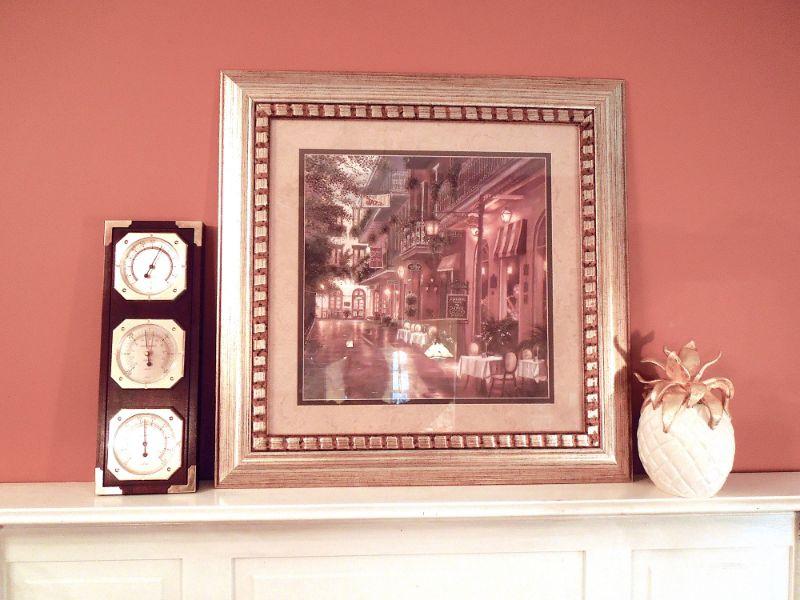 Gold framed print of a New Orleans street cafe behind glass, a wood and brass weather station and a ceramic gold and white pineapple made by Sudio Z with original price tag.