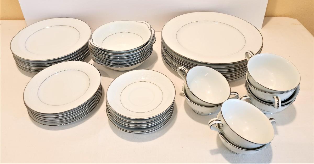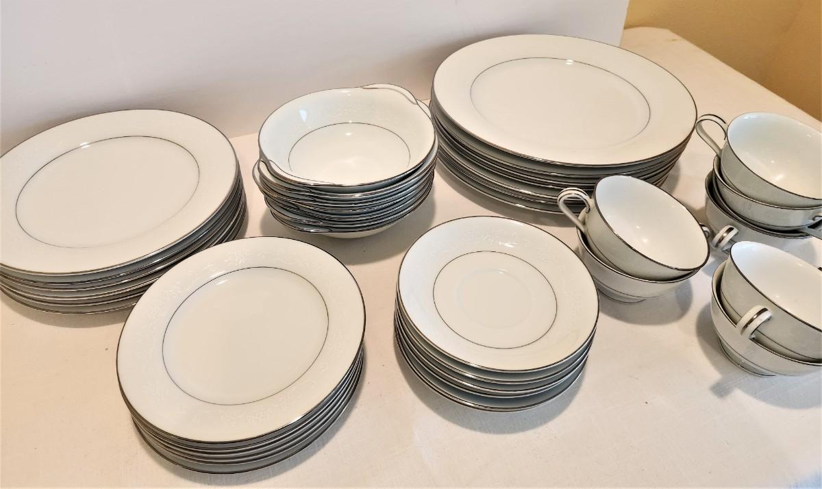 Vintage NORITAKE dinnerware in the "Whitehall" pattern (platinum rim). You get all you see here: 6 salad plates, 8 cups/6 saucers, 6 bread/butter plates, 7 dinner plates, 7 soup bowls. All in good condition.