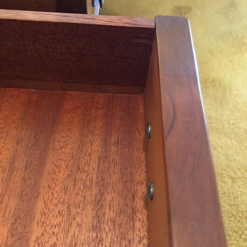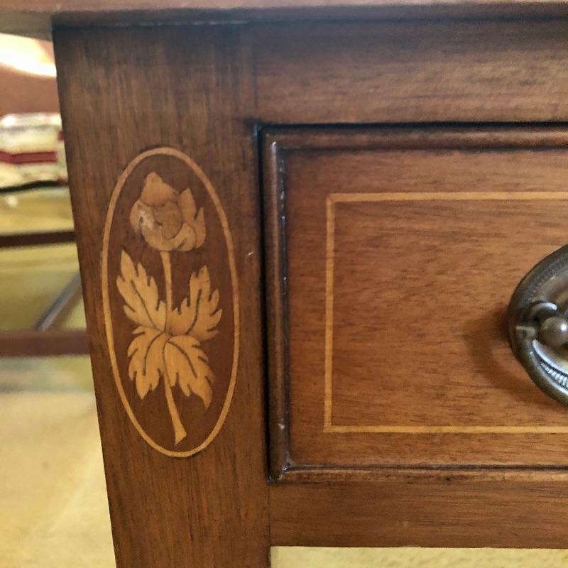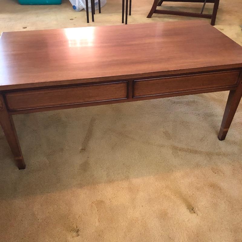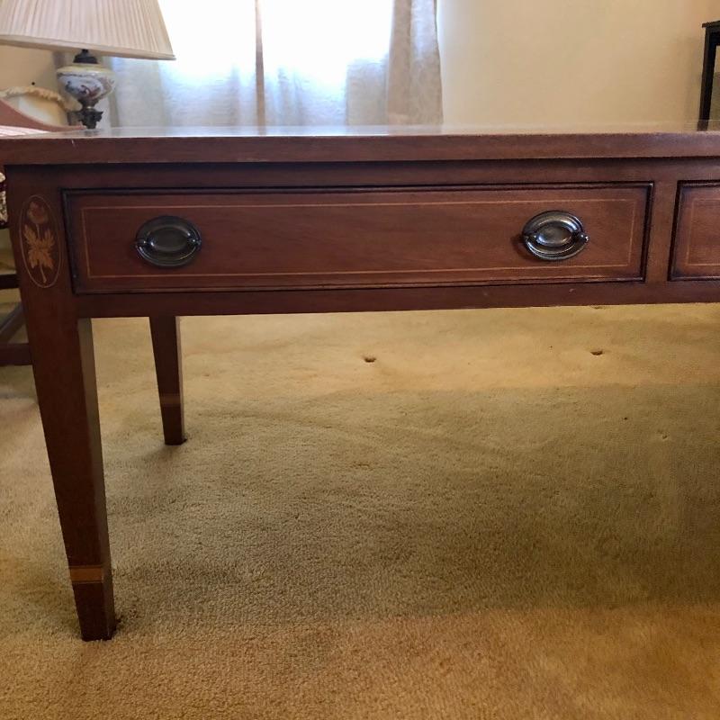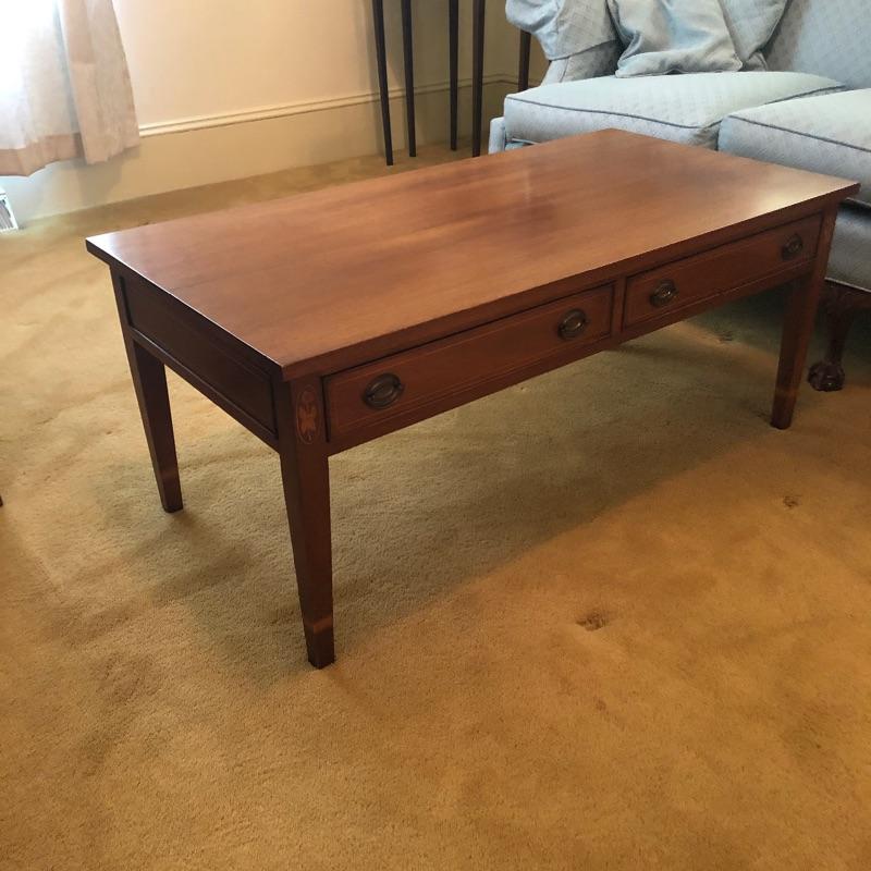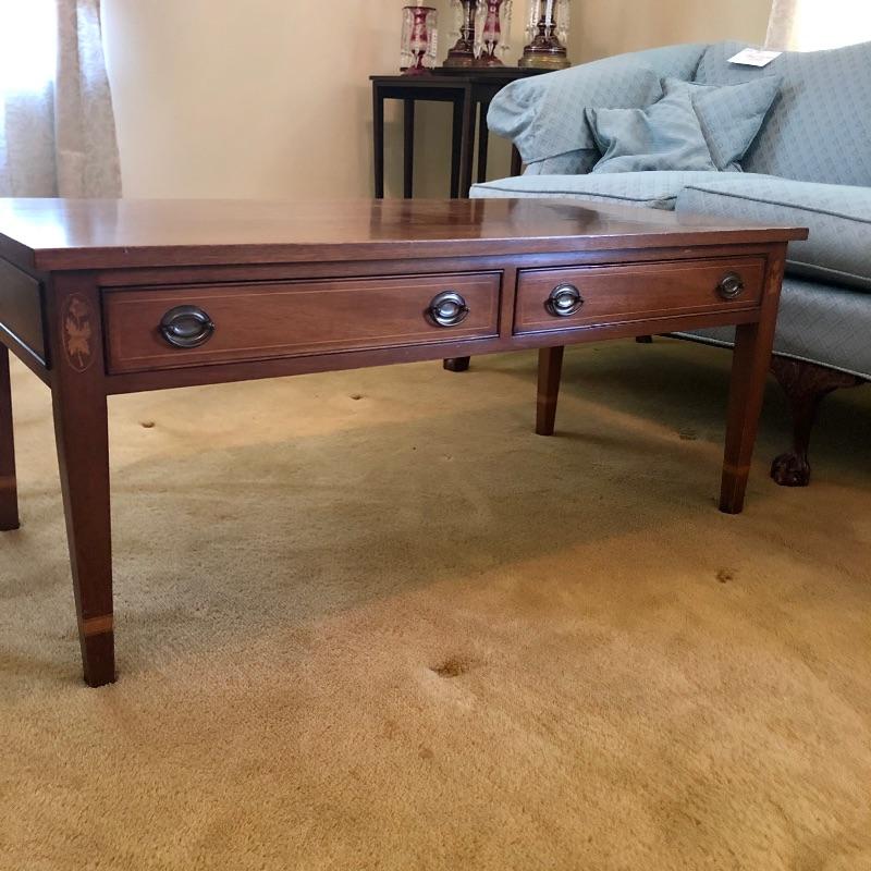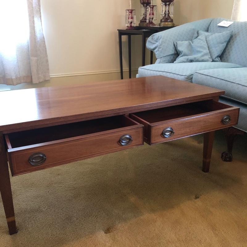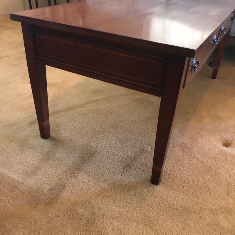 Craftsmanship, style and exquisite details in this rectangular coffee table. From the MCM-like brass pulls in the two drawers to the inlaid wood details, this piece is a real gem. Lovingly cared for, this table has just a few minor scratches shown in an image.