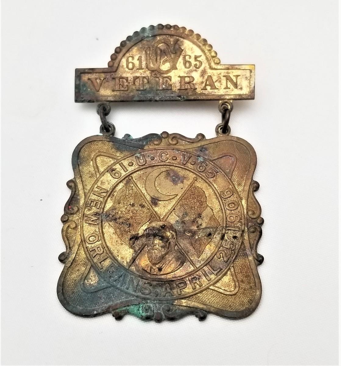 There were several Confederate Veteran Reunions held in New Orleans - 1903, 1906, 1927. This medal is from the 1906 reunion, which was one of the largest. Several different commemoratives were struck, but this one was reserved only for the VETERANS themselves. Made by Schwab & Co. - brass. In somewhat rough condition, as shown. Pin in missing on the back and has some verdigris. We have not attempted to polish it - as found. Measures about 2.5" long. A true collectible.