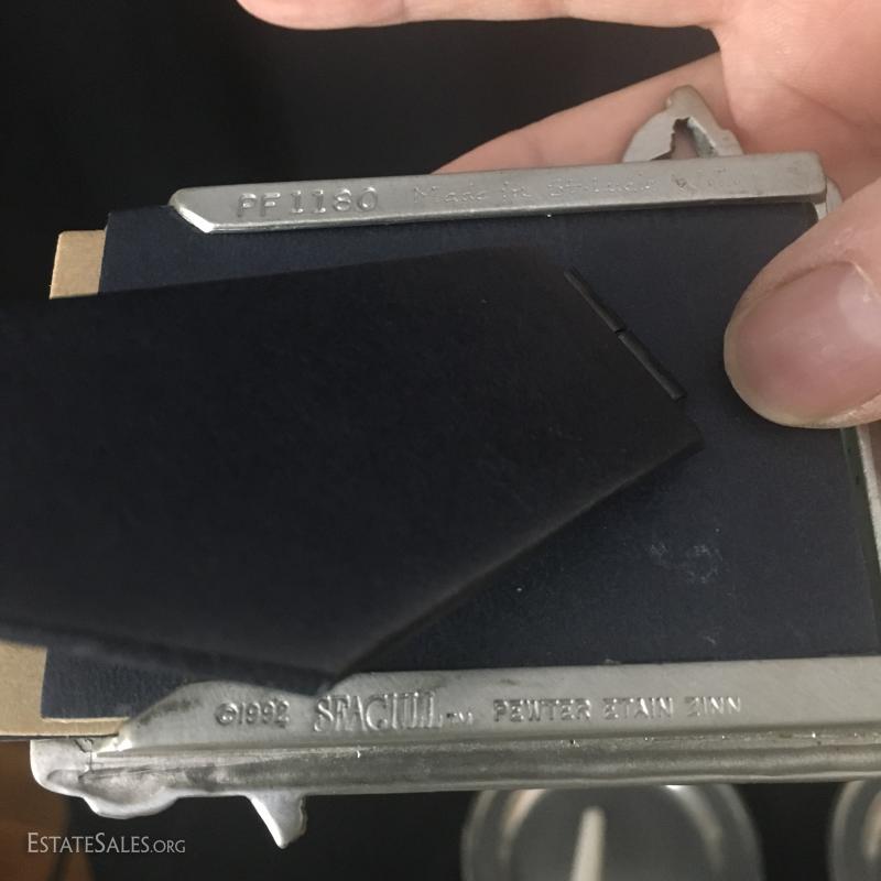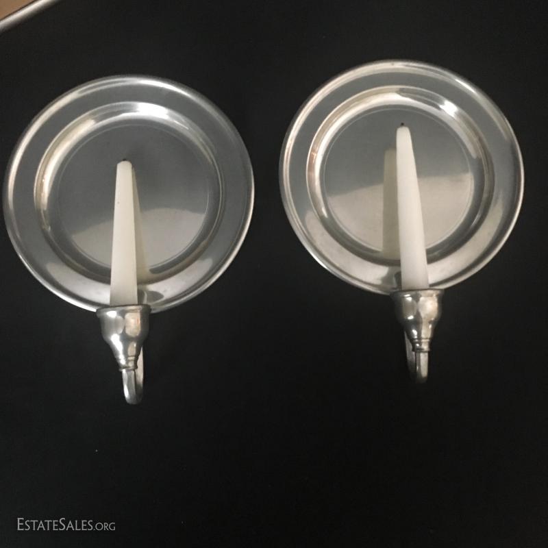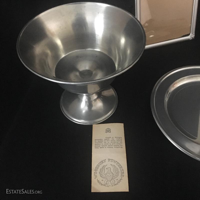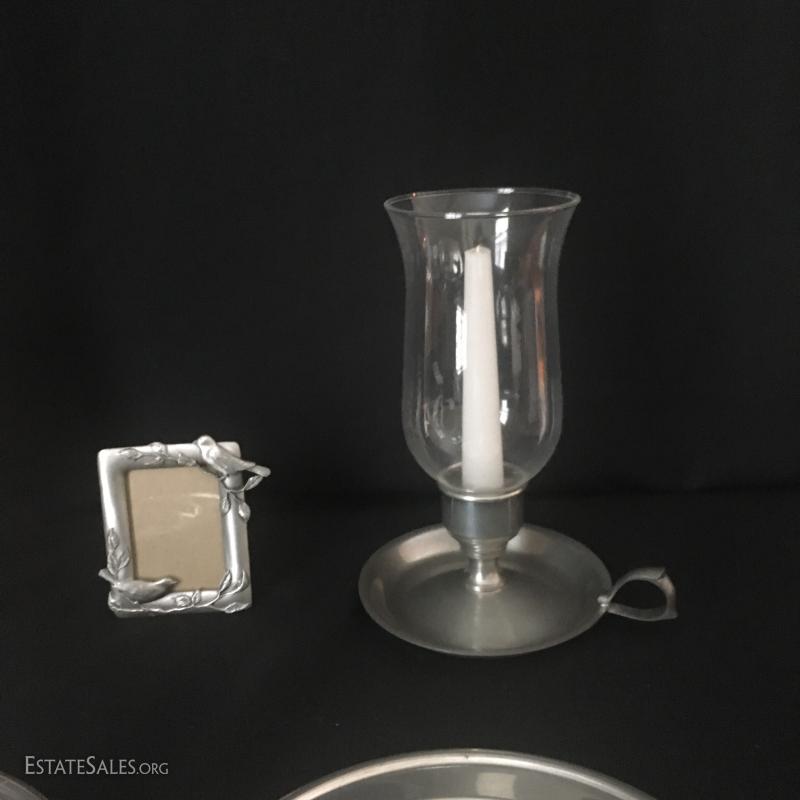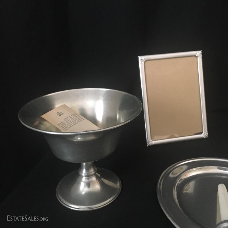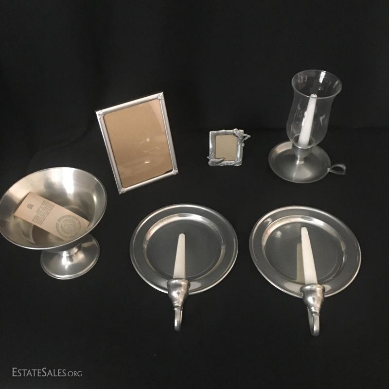 Plate wall candle holders and pedestal bowl by Woodbury. Small frame made in St. Lucia. This lot is available for shipping or local pick up in Asheville, NC.