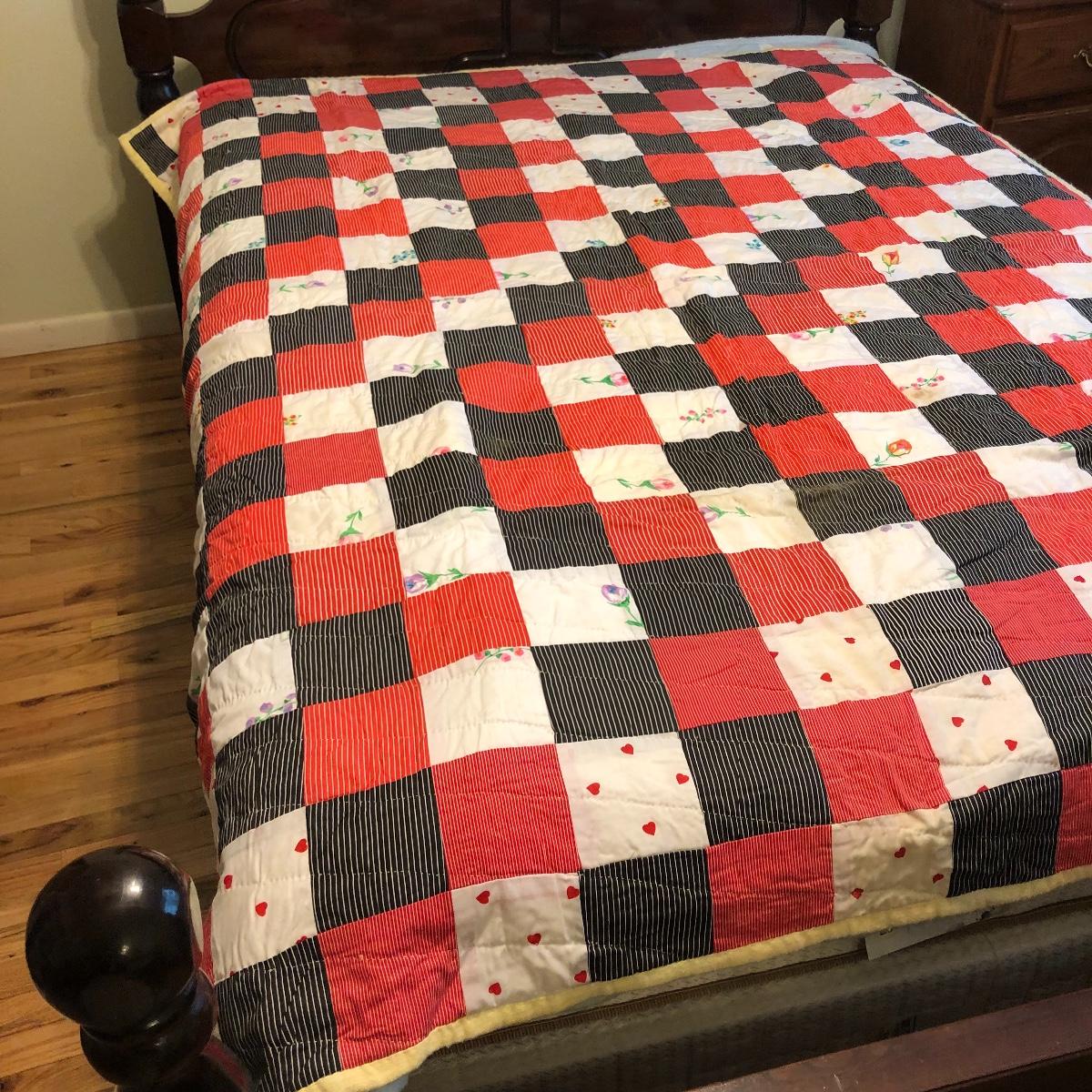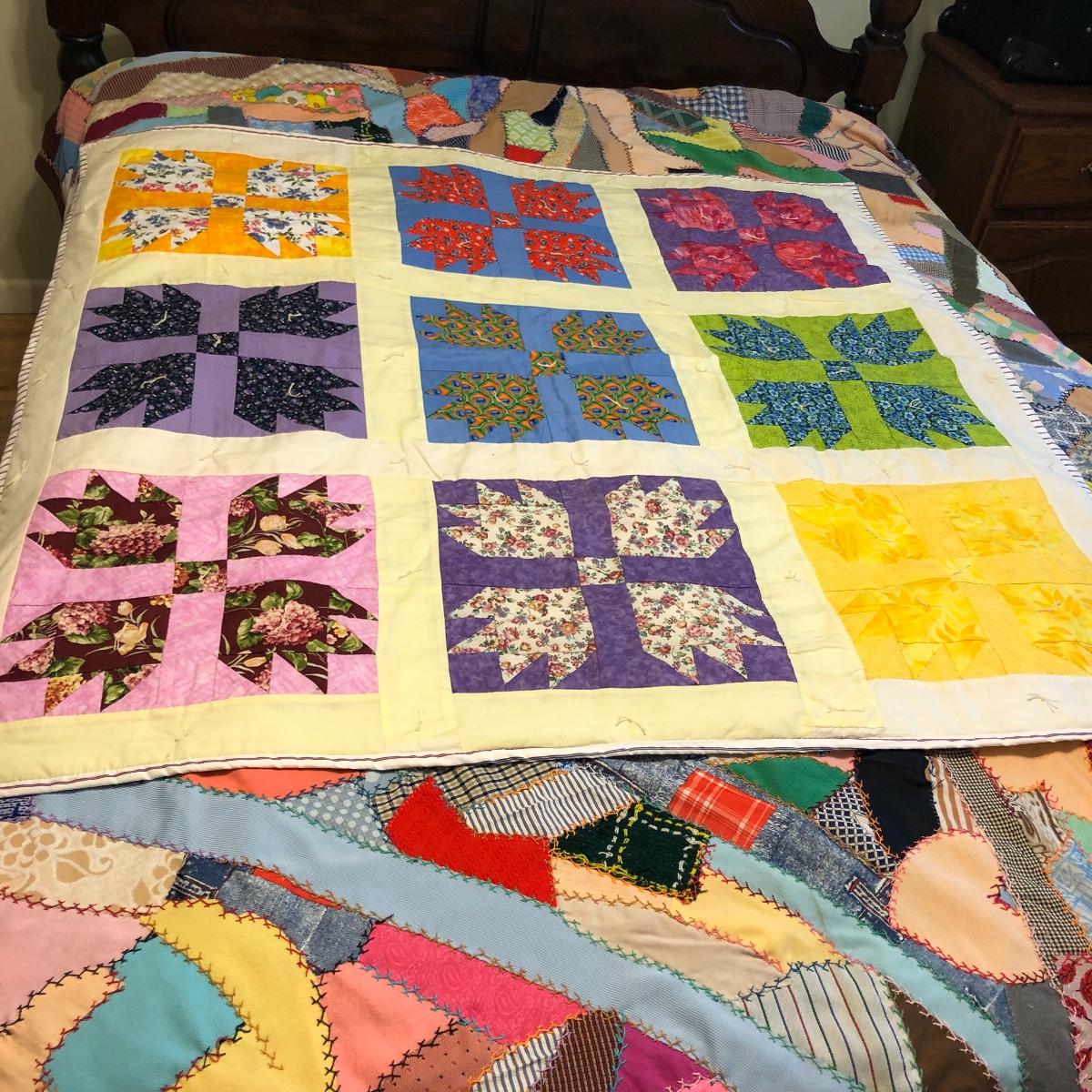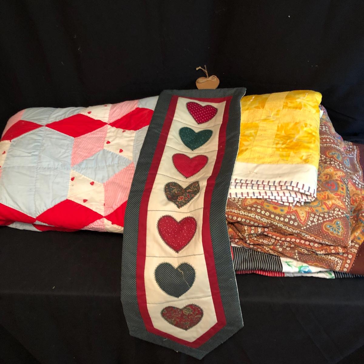 A stunning collection of quilts in a variety of sizes. Quilts are shown on queen sized bed that is not included but available in lot 7. See all the great workmanship on these beauties. Also includes one hanging piece. Largest quilt measures 84” x 90”.