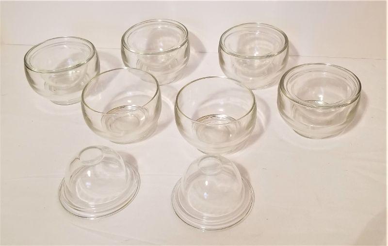 Nice set of six shrimp cocktail dishes with removeable liners (crushed ice goes in the bottom). Good condition. 4" across, 3.25" tall.
