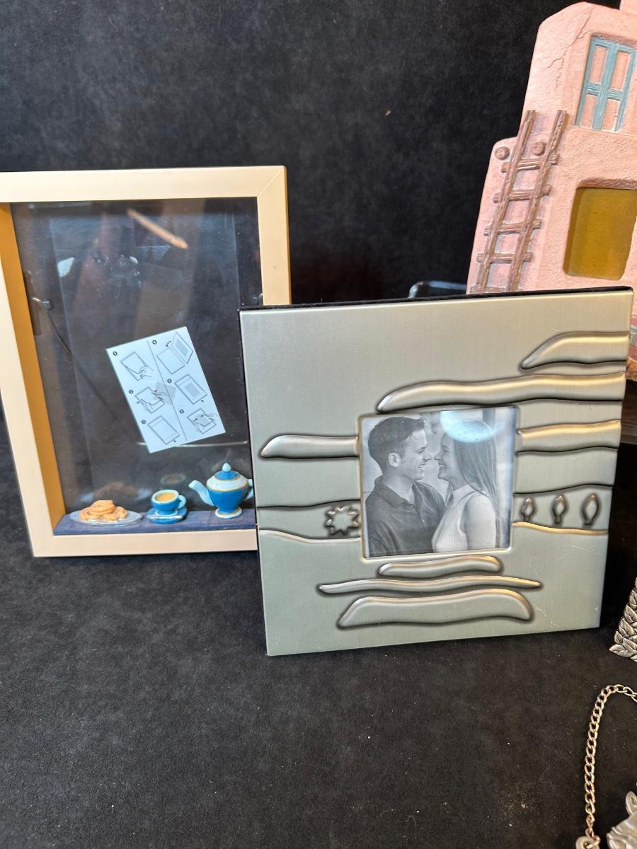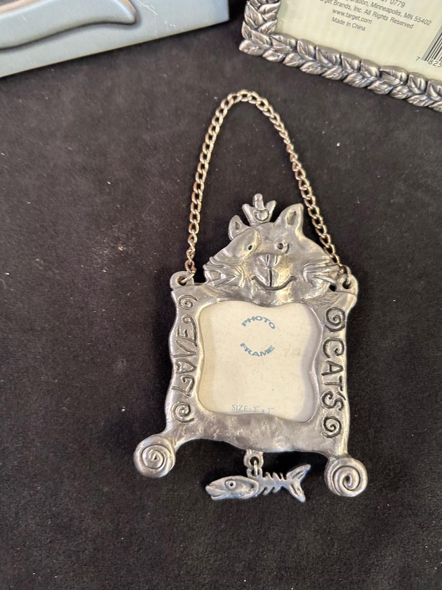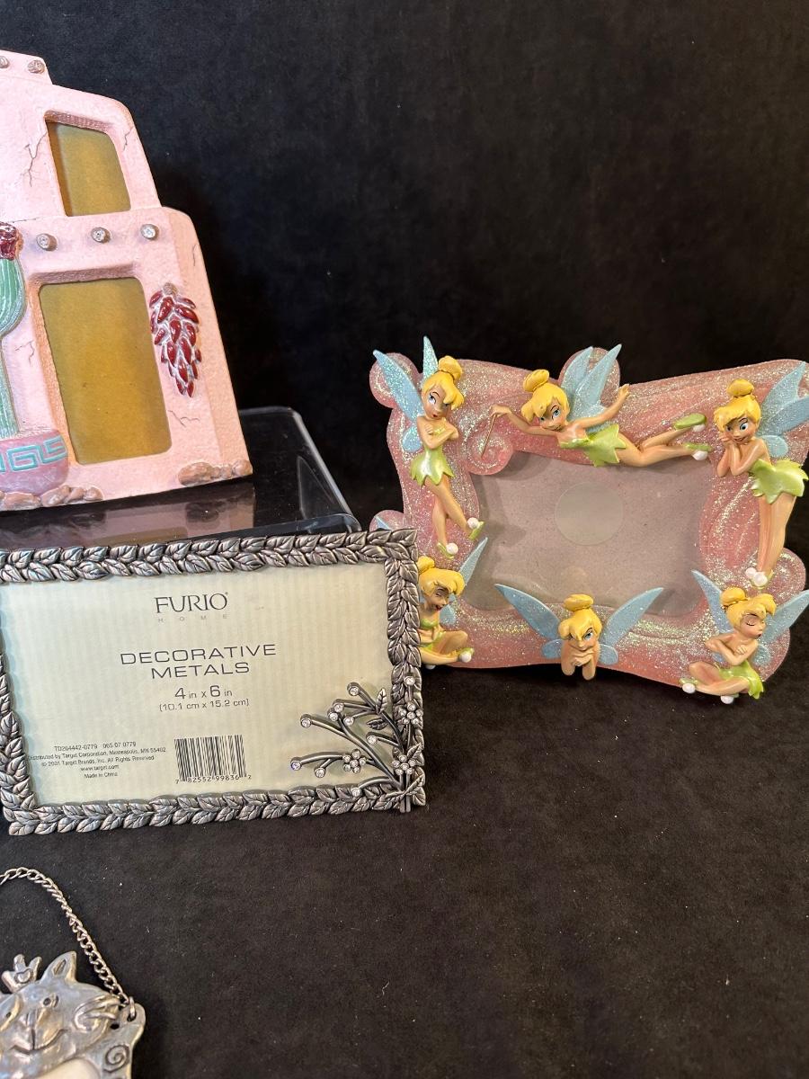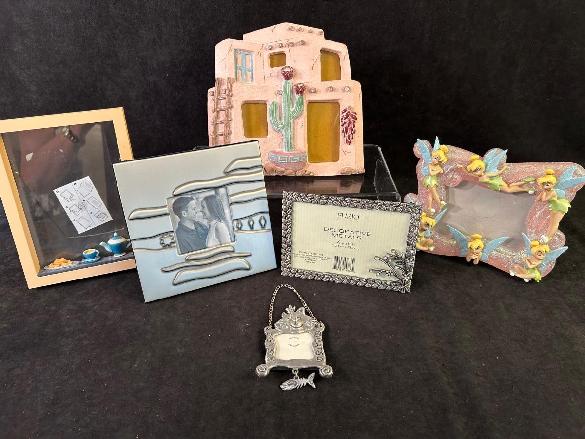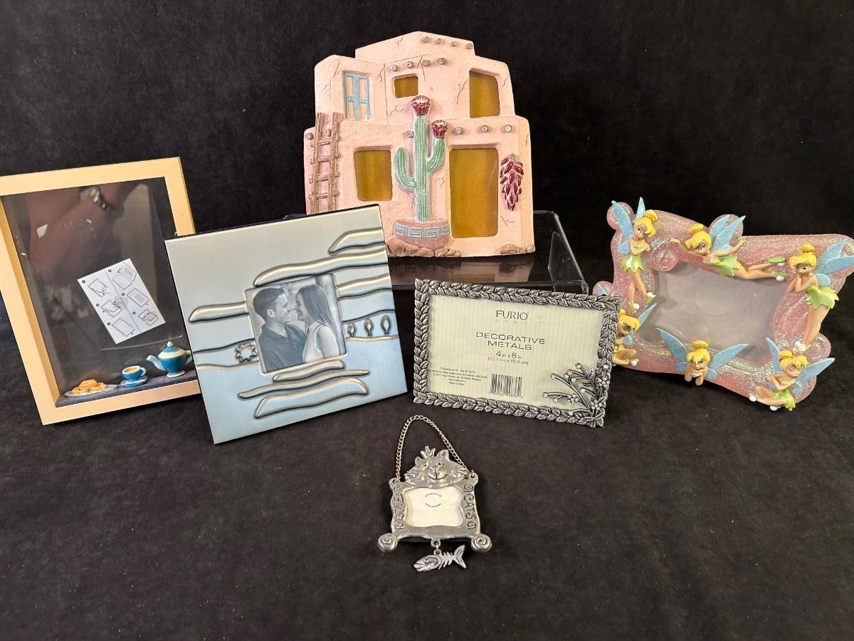 Includes 1 brand new Furio 4” x 6”, a Tinker Bell frame, mini metal cat frame, southwest style multi-picture frame, 1 stainless frame and a dessert/breakfast themed frame.