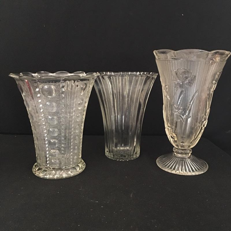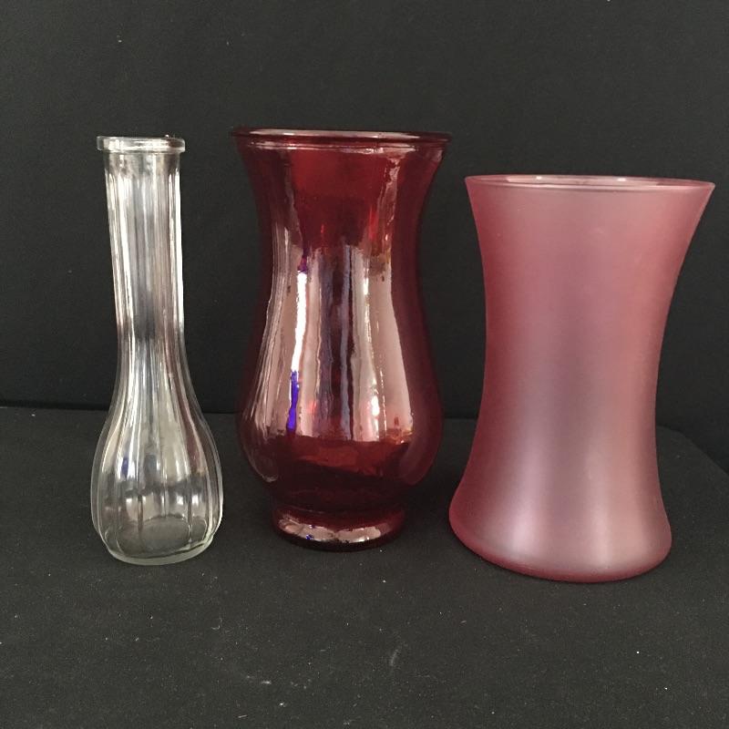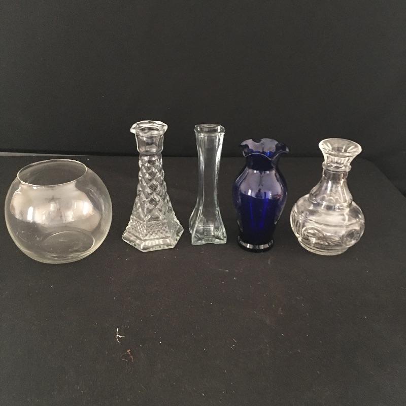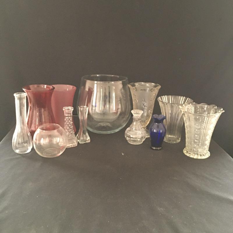 Just in time to collect all those spring flowers! Vases includes one large vase, one marked Profile Europa and a variety of vases in a assortment of colors, styles and sizes. Largest vase measures 9”D x 10” tall.