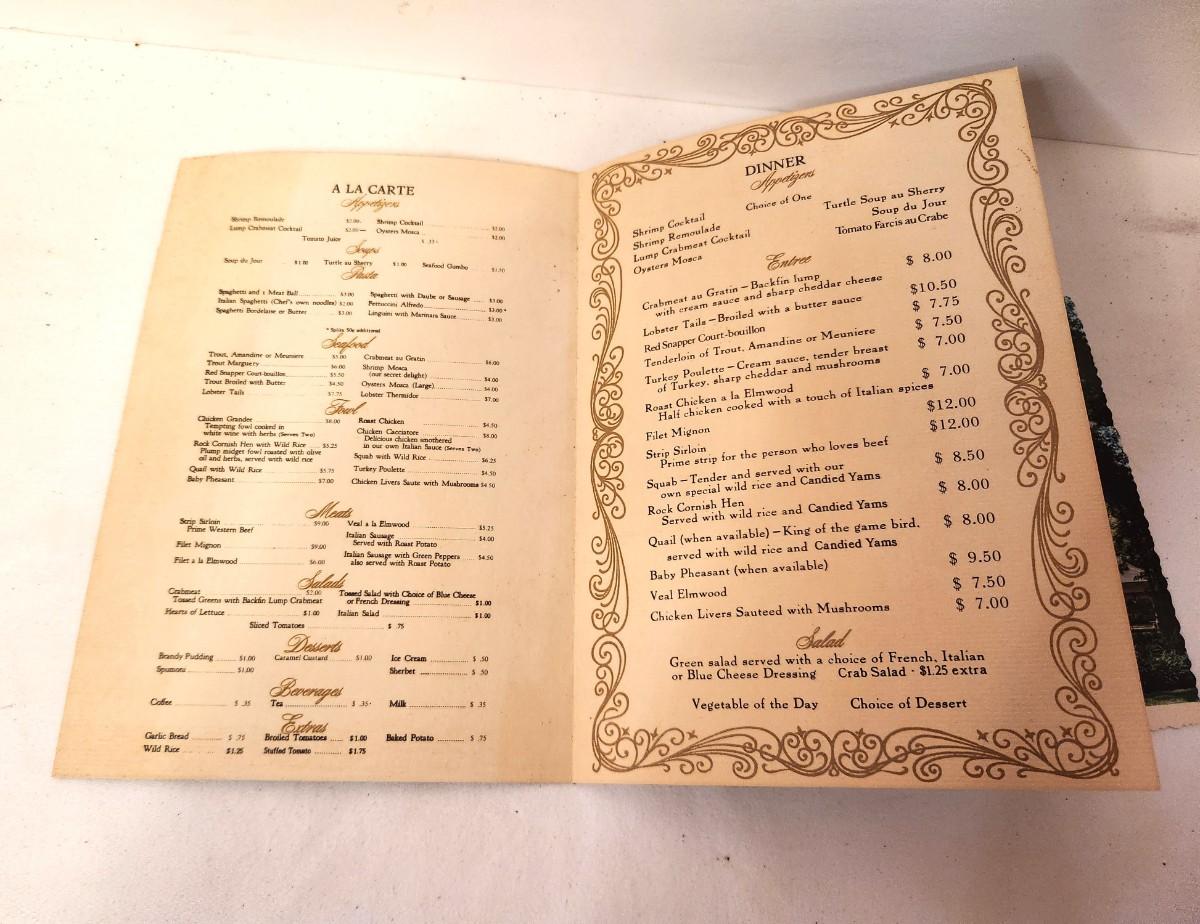 Long lost Elmwood Plantation - where you could get a complete multi-course Filet dinner for $12.00. This is the smaller size menu, which is actually a little harder to find. Good condition.