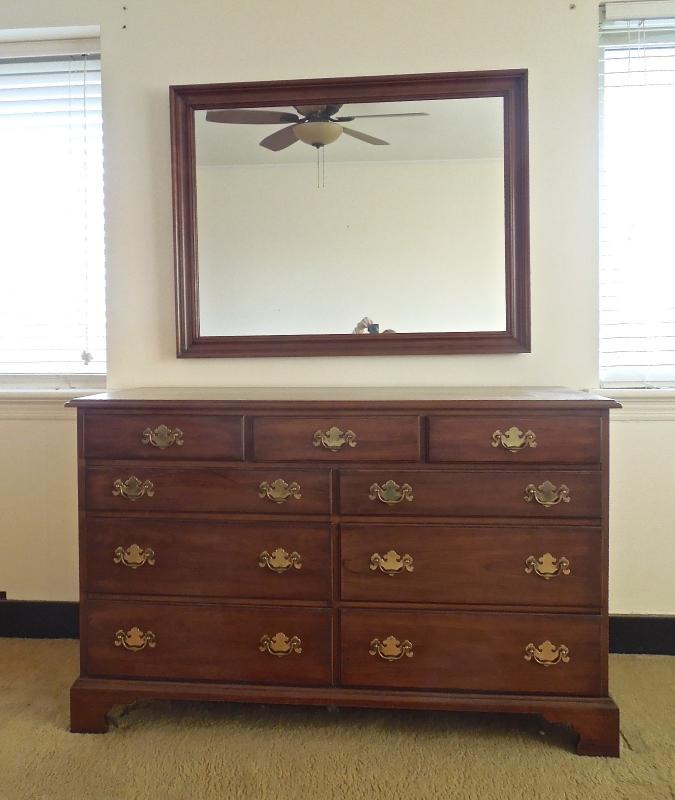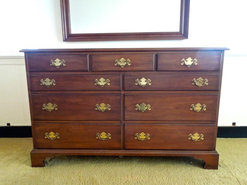 Made in Virginia of Black Cherry. Batwing brass hardware. Chippendale early american style. Dovetailed drawers. Minimal surface scratches. 54" L x 21" W x 35" H. Matching mirror is 45" x 34".