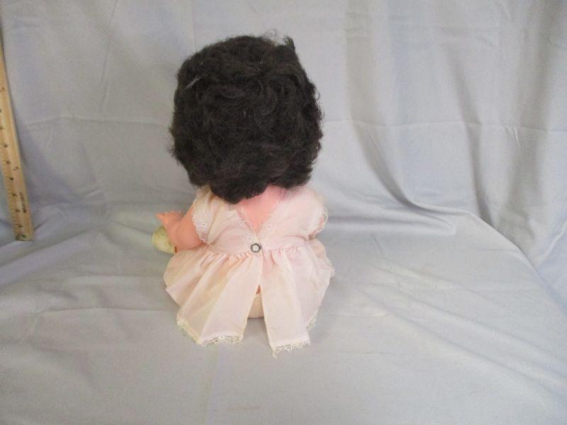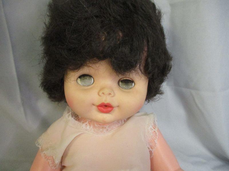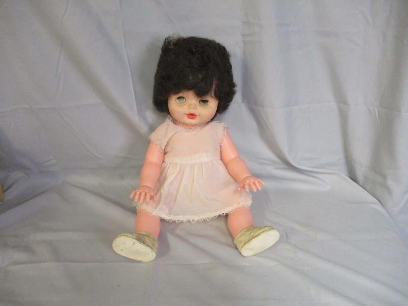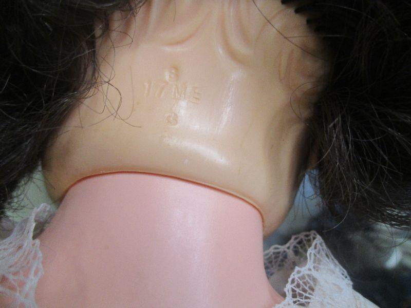 Her eyes need to be clean, but with a little attention, they should clean up nicely. The only marking that I could find is "17 ME" on the back of her head. There is a hole in her mouth, and a hole in her bottom, that leads me to think that she should be able to drink and release. She is about 18" long.