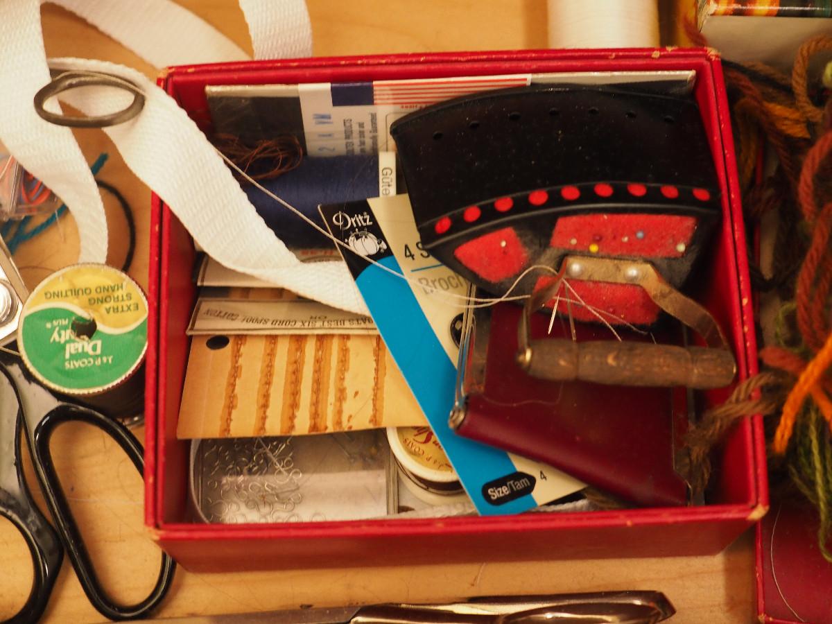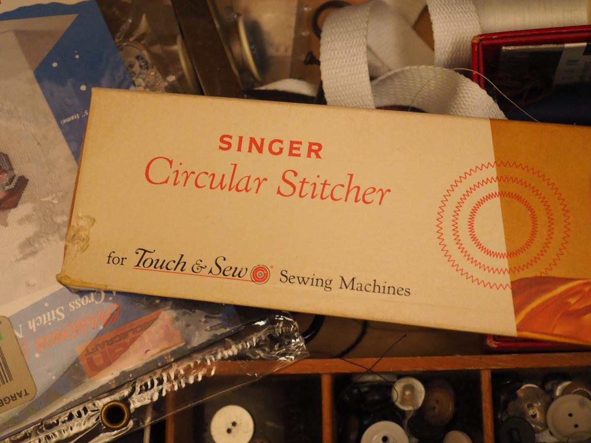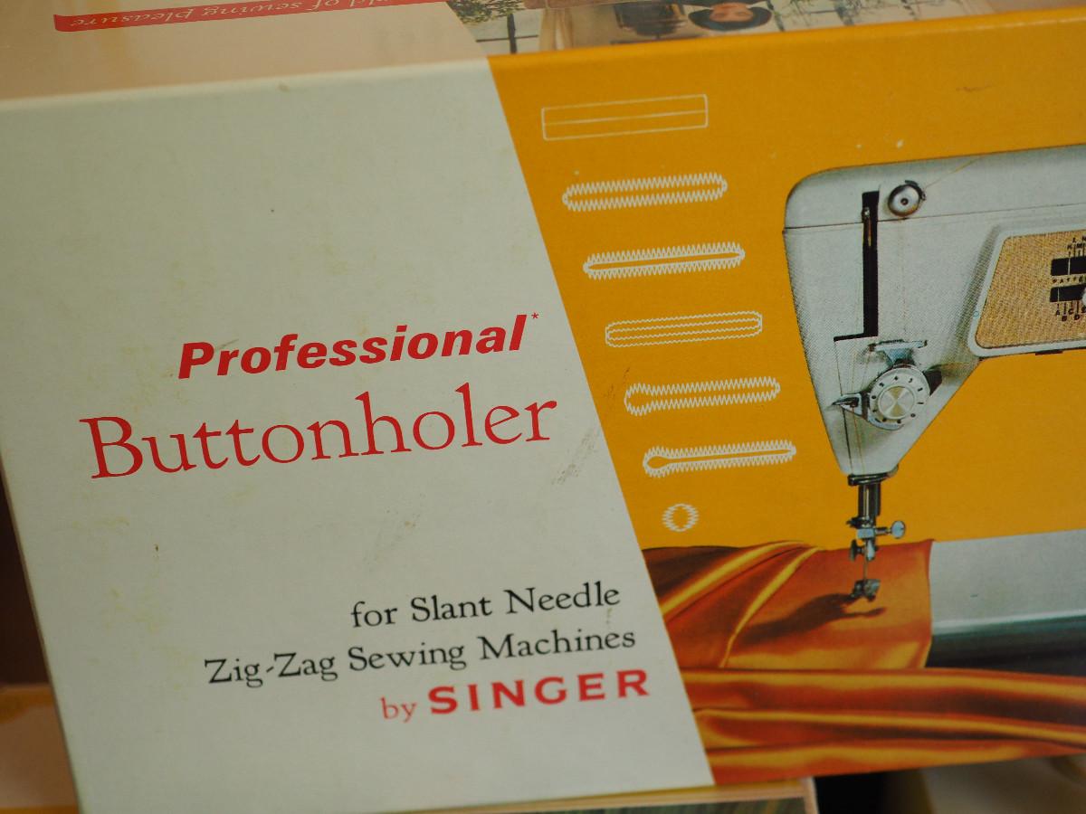 Lot 72 Vintage Singer "Touch-o-matic with manual and accessories: Large sewing lot with attachments, straight stitch machine with case, iron, thimble collection, Drawer full of thread, buttons, and other sewing items, steam iron. Iron and machine are untested, has foot petal and cord.