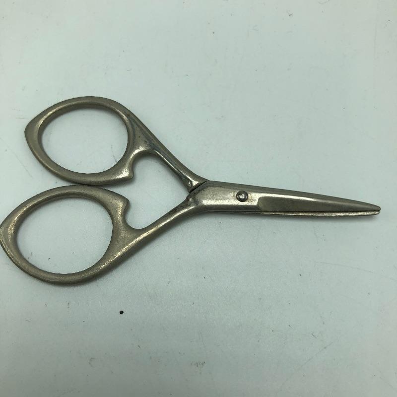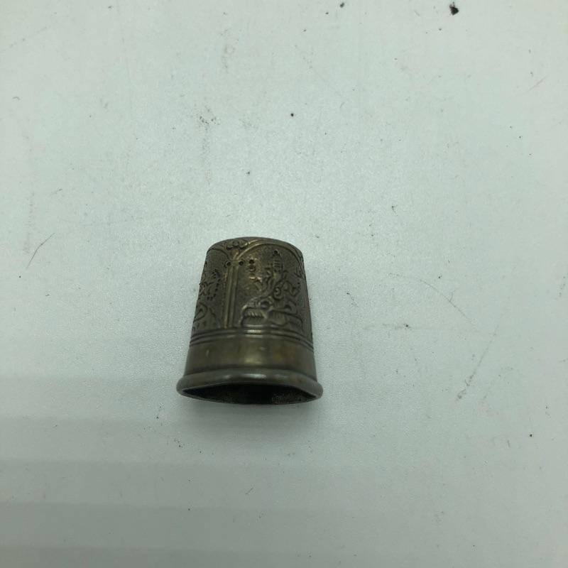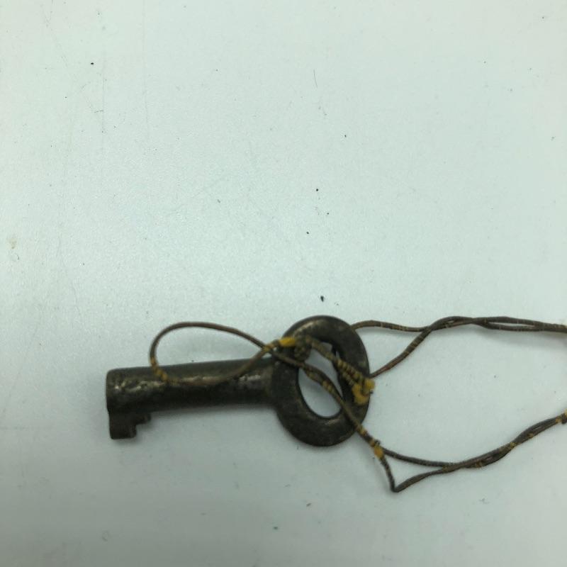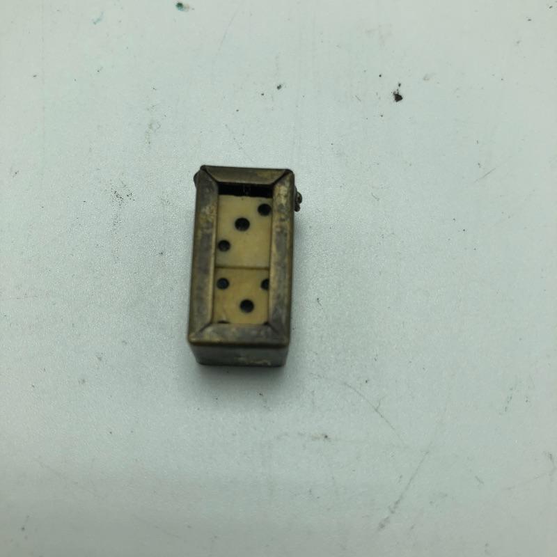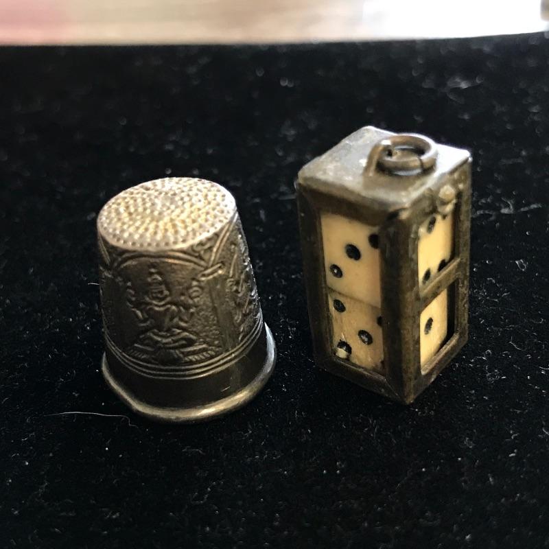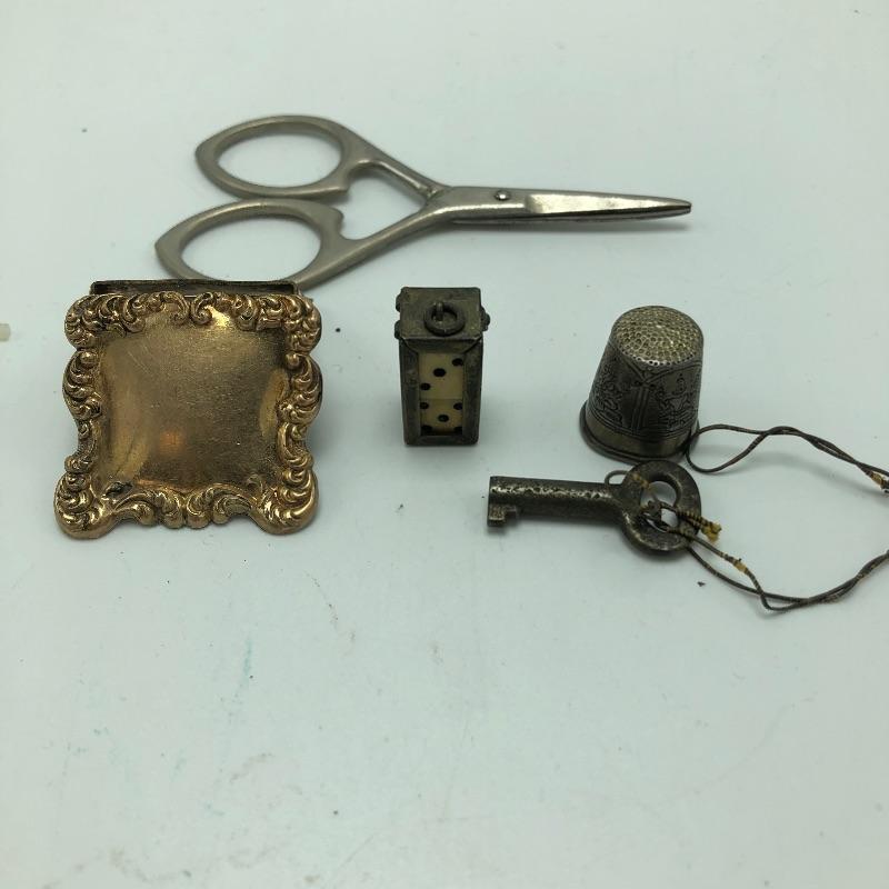 Adorable collection of nostalgic artifacts here that includes scissors, key, thimble, dice and what appears to be a small belt buckle that is stamped 197. Small dice seems to be a pendant for a necklace since it has a ring on top. It’s the size of the thimble.