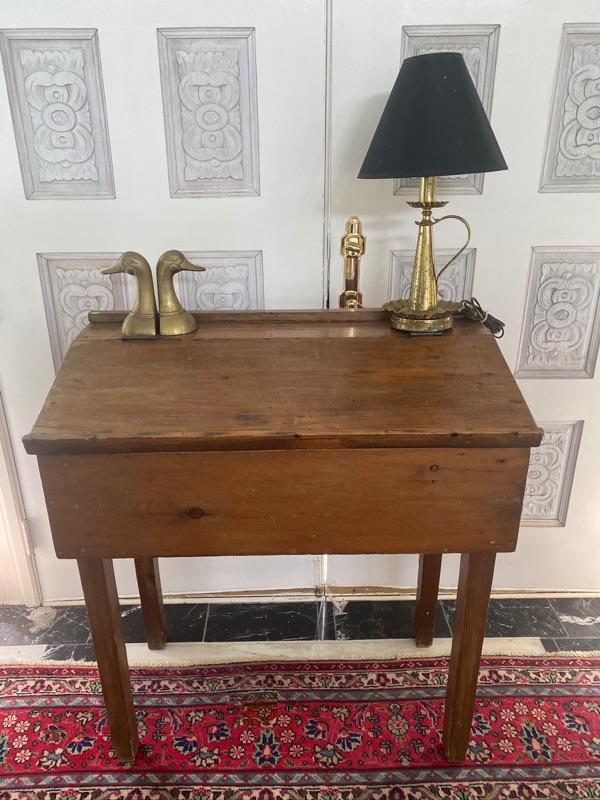 Antique Primitive Pine Slant front desk with lamp and duck book ends