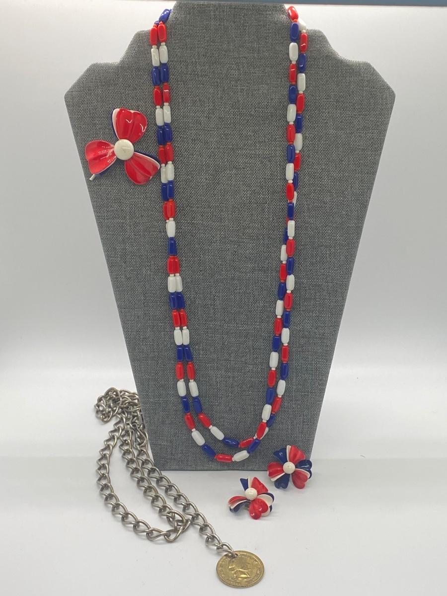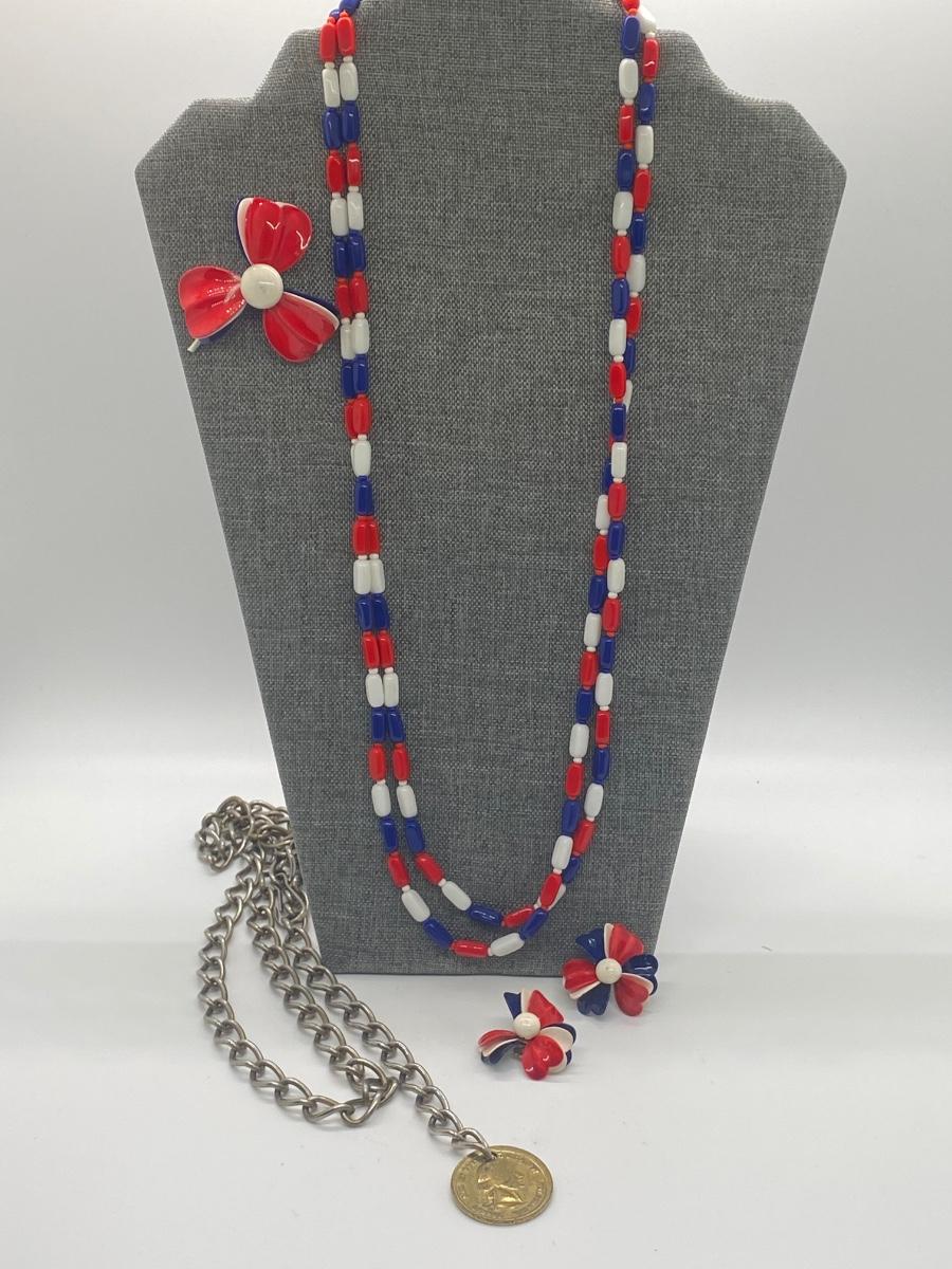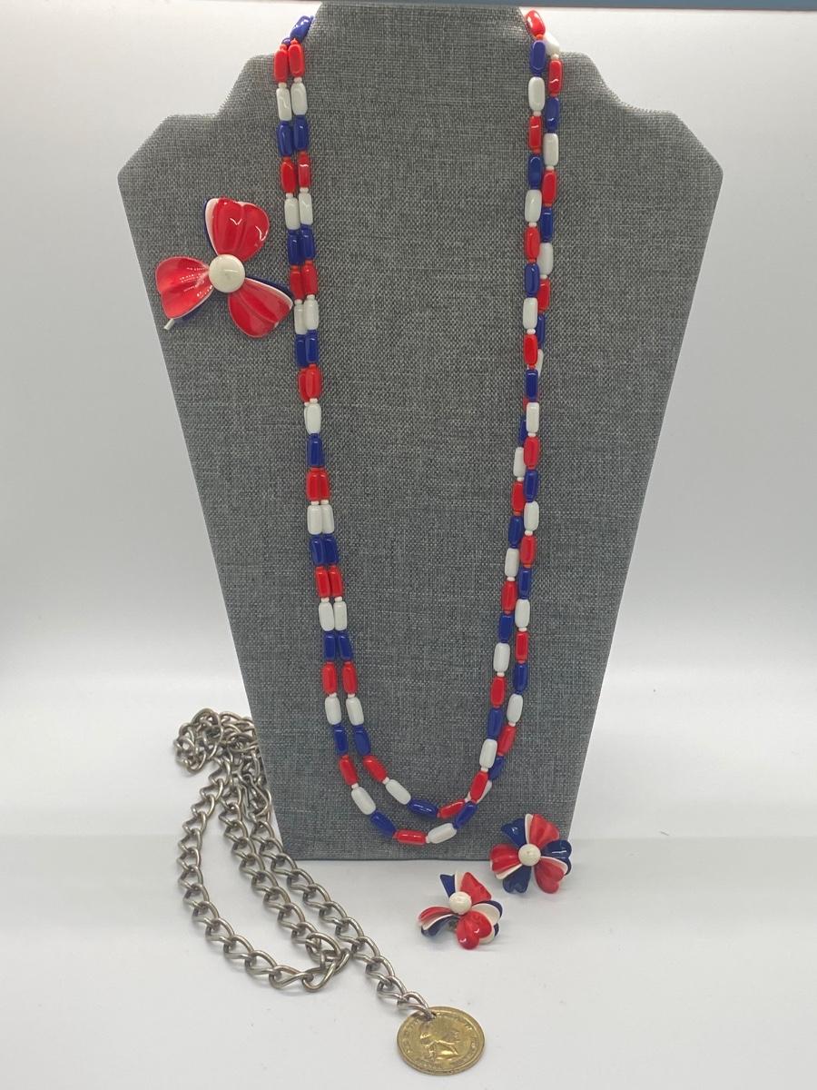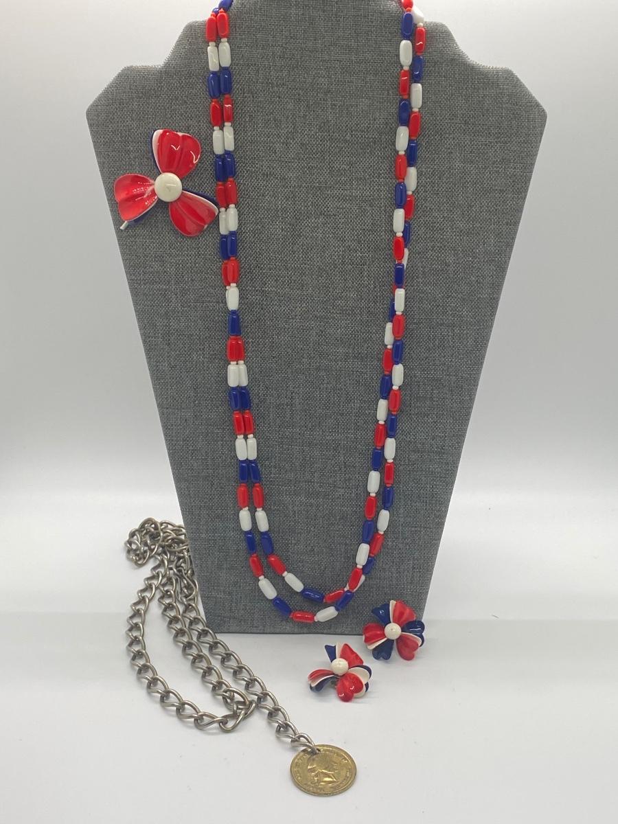 Matching set of red, white and blue beaded necklaces, pin and earrings. Lot also includes coin necklace. Please see all pictures as they are the best representation of the items. The pictures show condition, measurements if taken, and what is included in the lot. Due to the large amount that we photograph and the time frame, we are not always able to take measurements. All items unless noted, are pre-owned and have been used. If you purchased furniture, you must bring help. We do not allow one person to carry large furniture out on their own. Bring help, tools and a truck for the safety of our client’s homes, and your personal safety. Any damages that result to the property including walls, and floors due to moving of the furniture will be charged to the buyer. Company policy. Thank you.