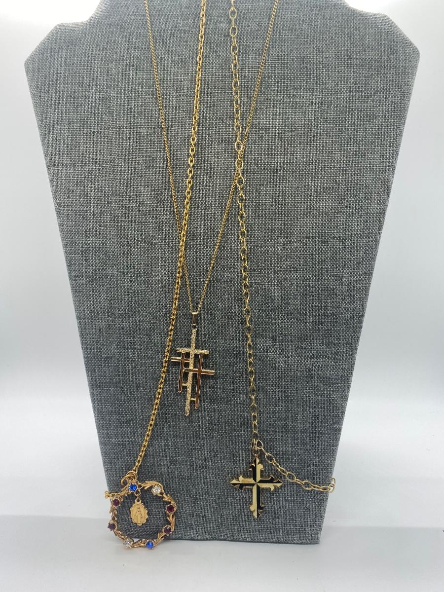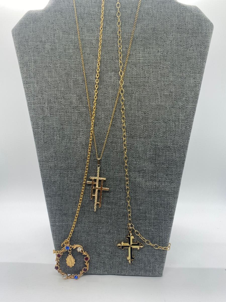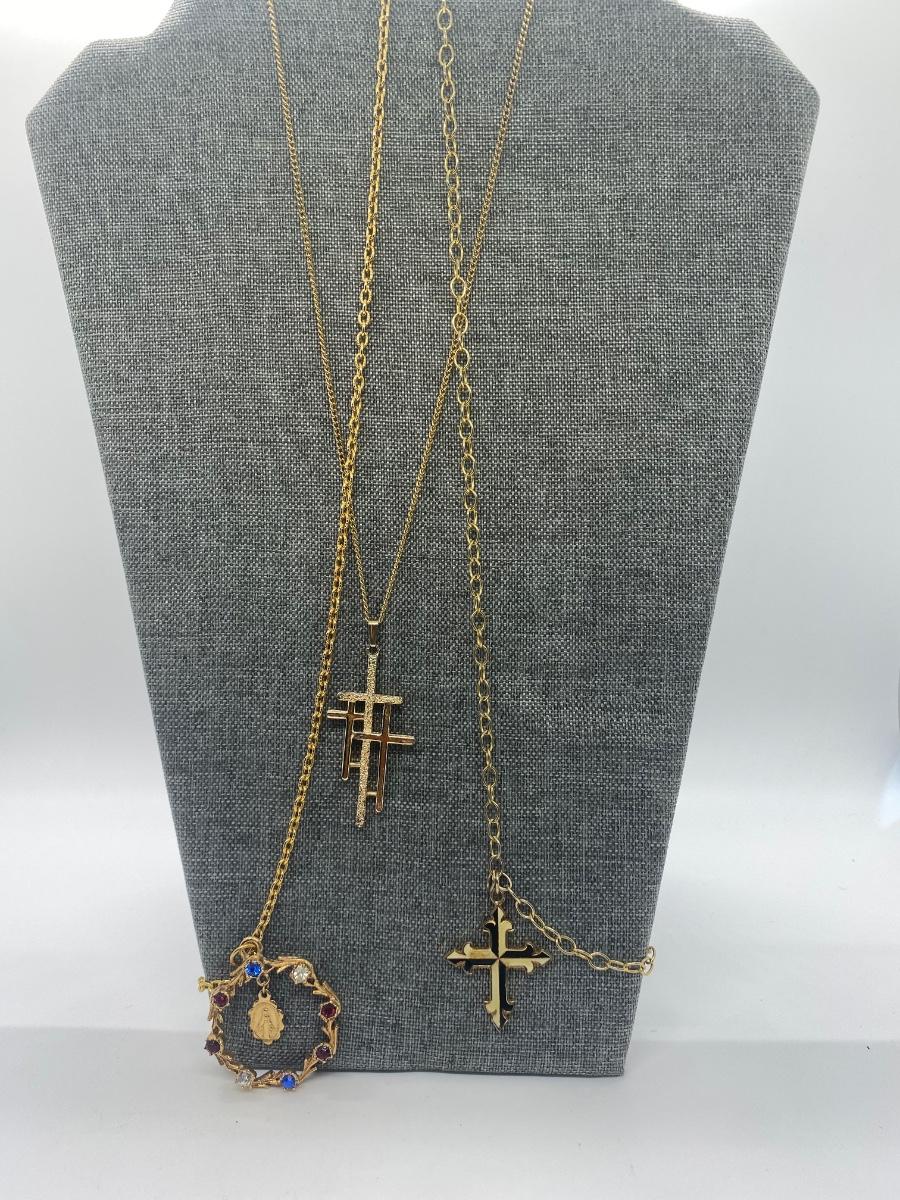 Two Cross pendant on chains and chain with St. Mary pendant. Please see all pictures as they are the best representation of the items. The pictures show condition, measurements if taken, and what is included in the lot. Due to the large amount that we photograph and the time frame, we are not always able to take measurements. All items unless noted, are pre-owned and have been used. If you purchased furniture, you must bring help. We do not allow one person to carry large furniture out on their own. Bring help, tools and a truck for the safety of our client’s homes, and your personal safety. Any damages that result to the property including walls, and floors due to moving of the furniture will be charged to the buyer. Company policy. Thank you.
